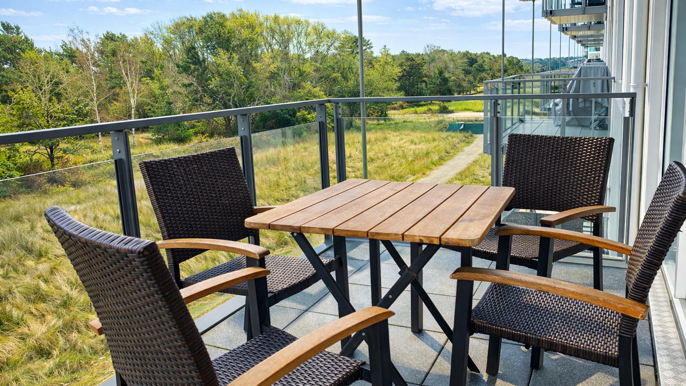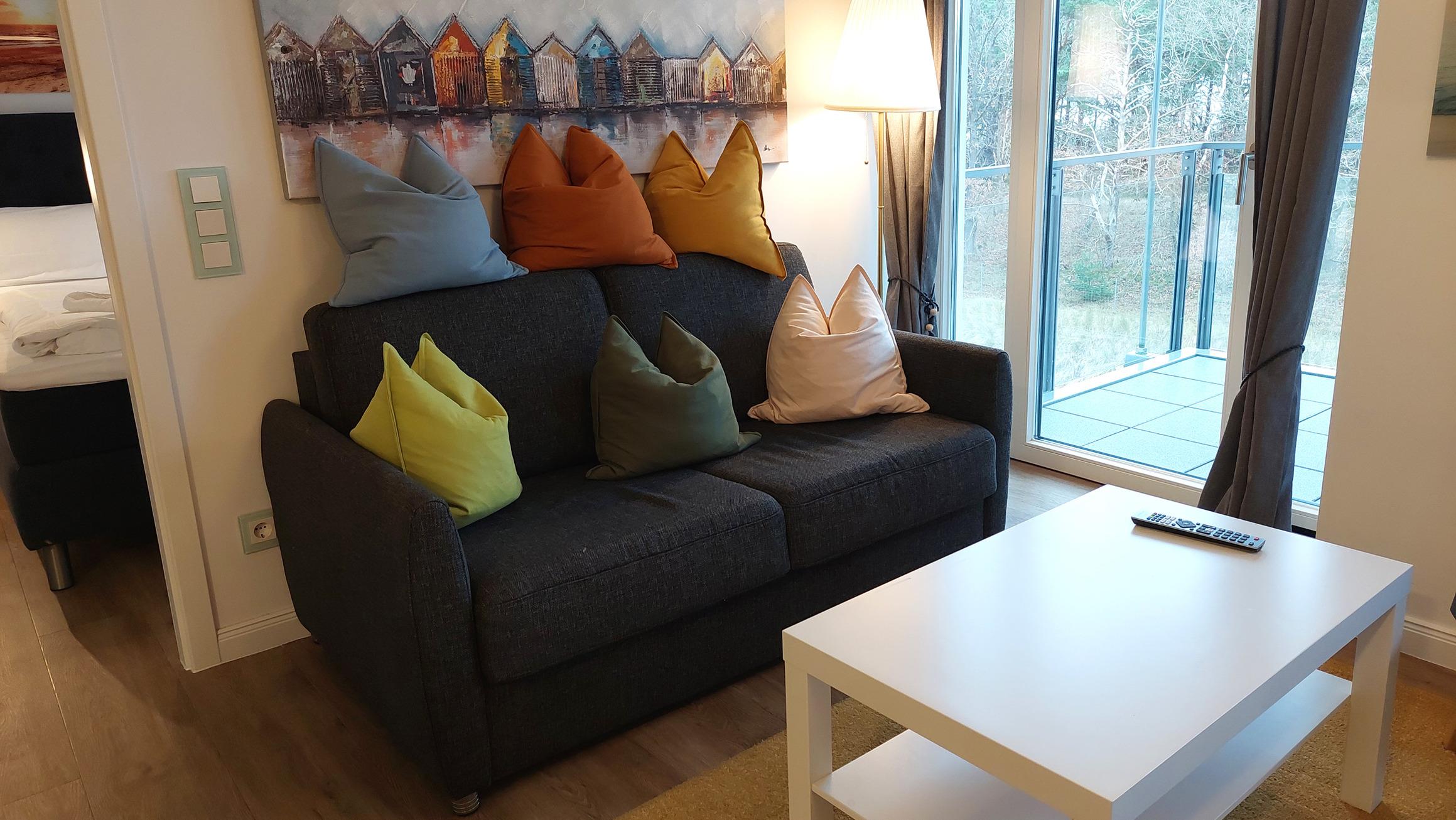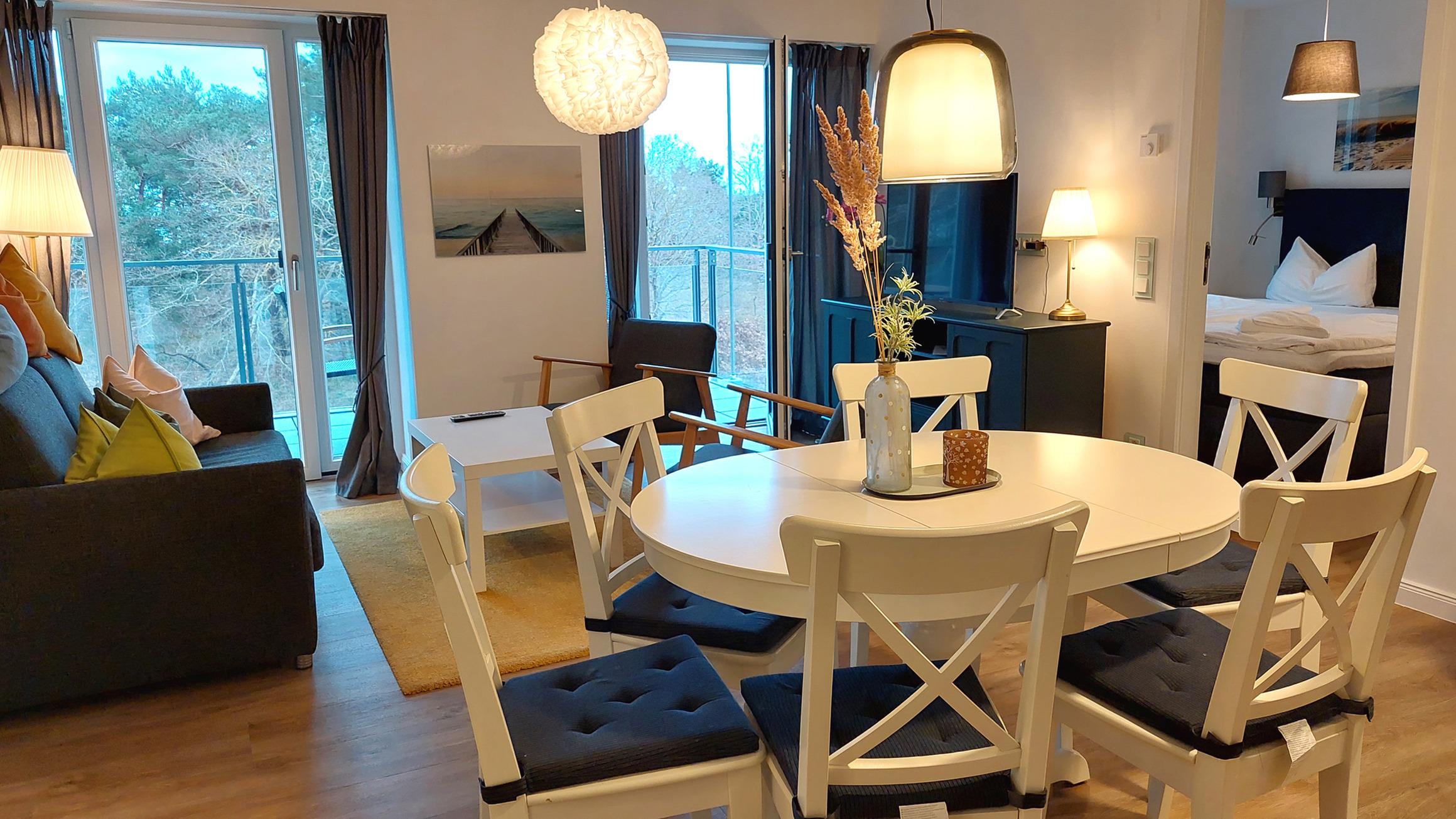 Das Wohn- und Esszimmer ist das Zentrum der Wohnung und lädt mit einer ausklappbaren Sofalandschaft zum Entspannen ein. Für Unterhaltung bei jedem Wetter gibt es einen Smart-TV und kostenfreies WLAN. Der Essbereich bietet Platz für 6 Personen und vom möblierten und überdachten Balkon aus hat man einen Blick auf den angrenzenden Küstenwald und die Ostseedünen.
