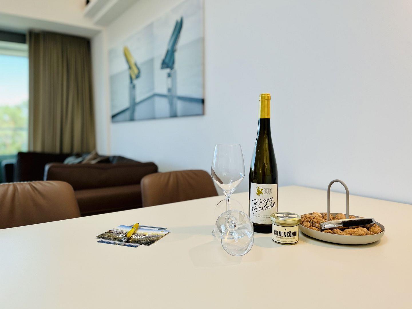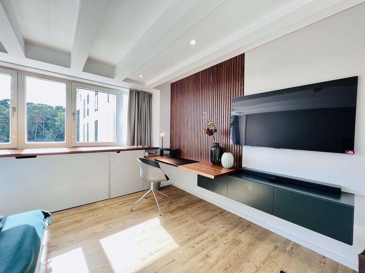 Das Maisonette-Appartement "Purbaltic" ist ein neu fertiggestelltes Juwel im 5. und 4. Obergeschoss von Haus Zudar in Prora. Mit 104 m² bietet es einen sonnigen Rückzugsort mit moderner Einrichtung und direktem Strandzugang. Zwei Schlafzimmer mit hochwertigen Doppel-Boxspringbetten und OLED-TVs bieten Komfort. Das Hauptschlafzimmer verfügt über eine luxuriöse Design-Sauna mit Blick auf die Ostsee und die Düne, während das zweite Schlafzimmer einen großzügigen Schreibtisch bietet. Kostenloses Internet und ein Stellplatz sind inklusive. Die voll ausgestattete Design-Küche, der Essbereich und der gemütliche Wohnbereich bieten einen herrlichen Blick auf die Terrasse, Kiefern und Ostsee. Zwei Balkone, einer mit Sitzgelegenheiten und einer mit Relaxliegen, laden zum Entspannen ein. Waschmaschine und Trockner sind ebenfalls vorhanden.