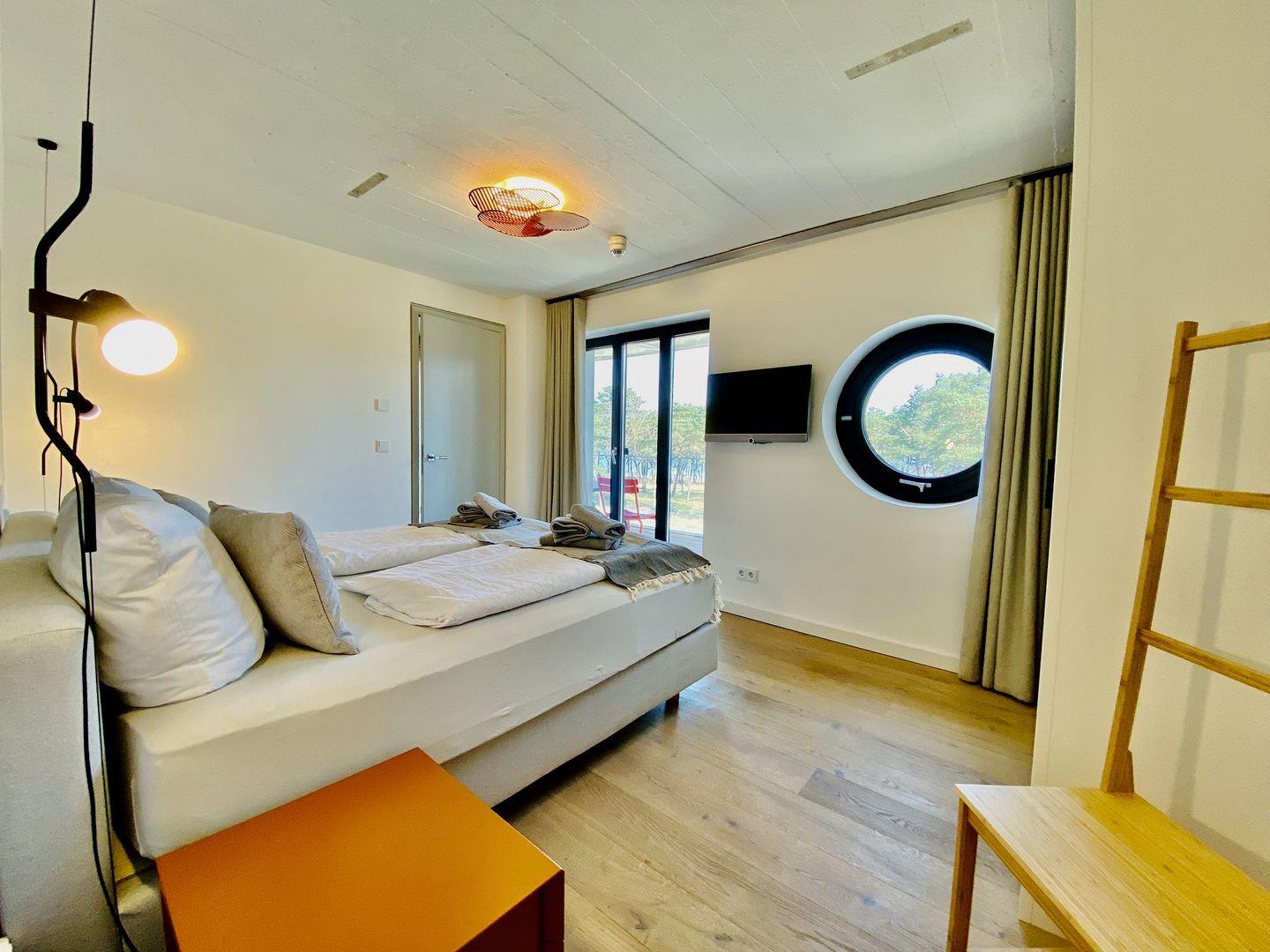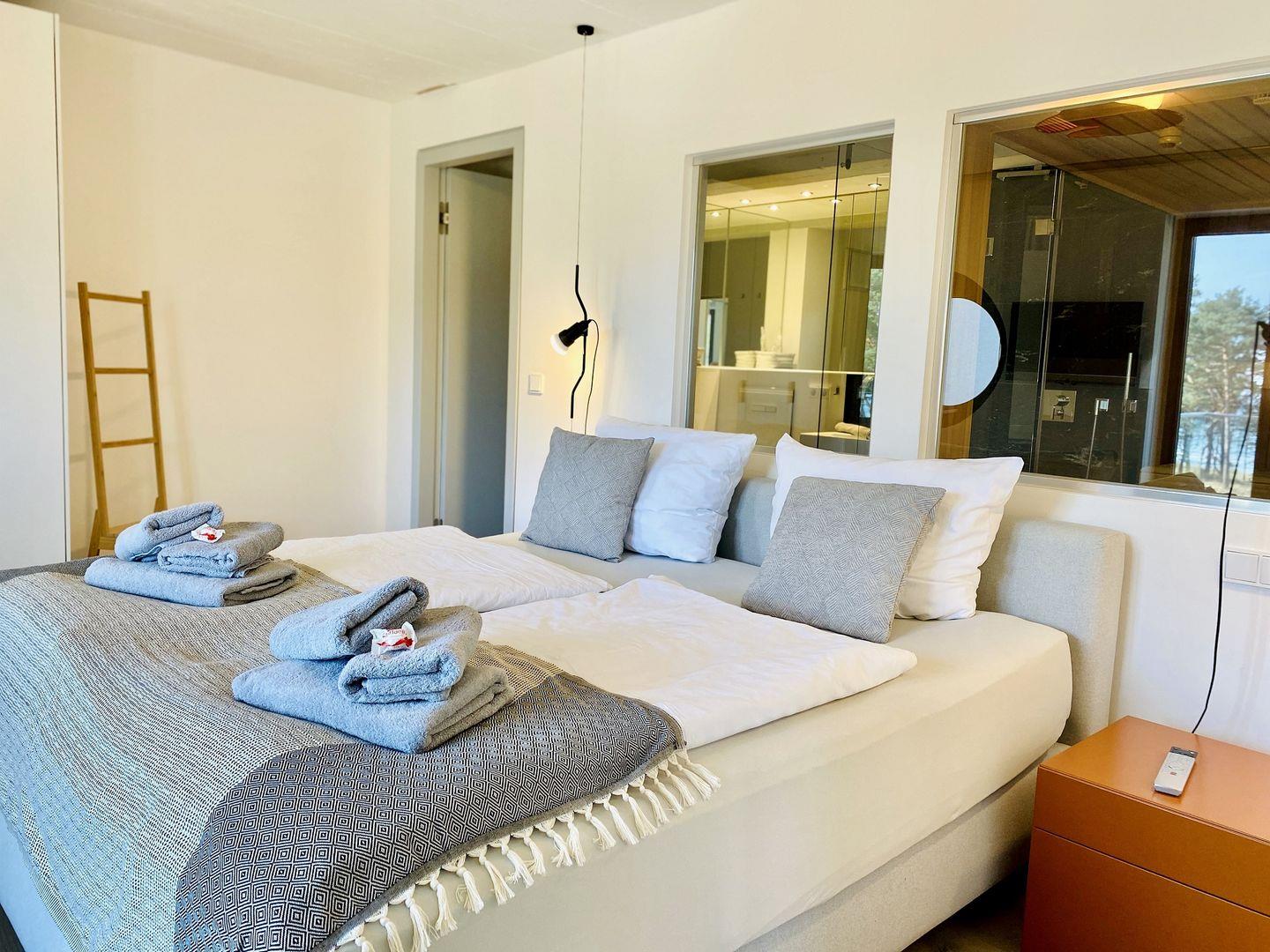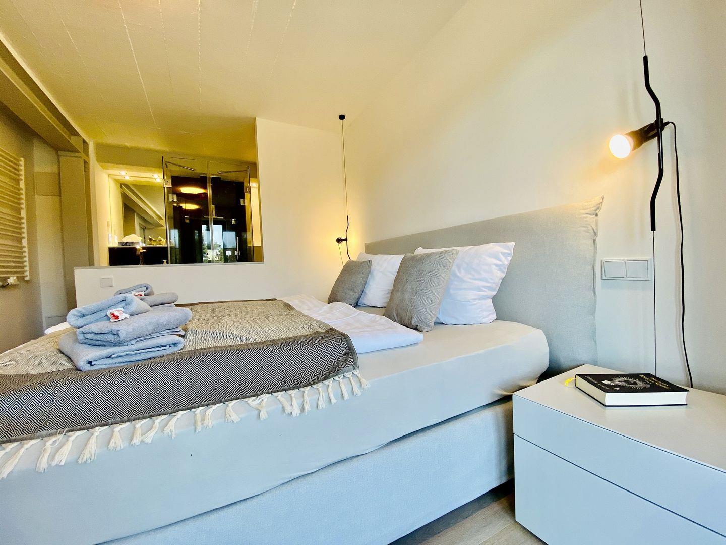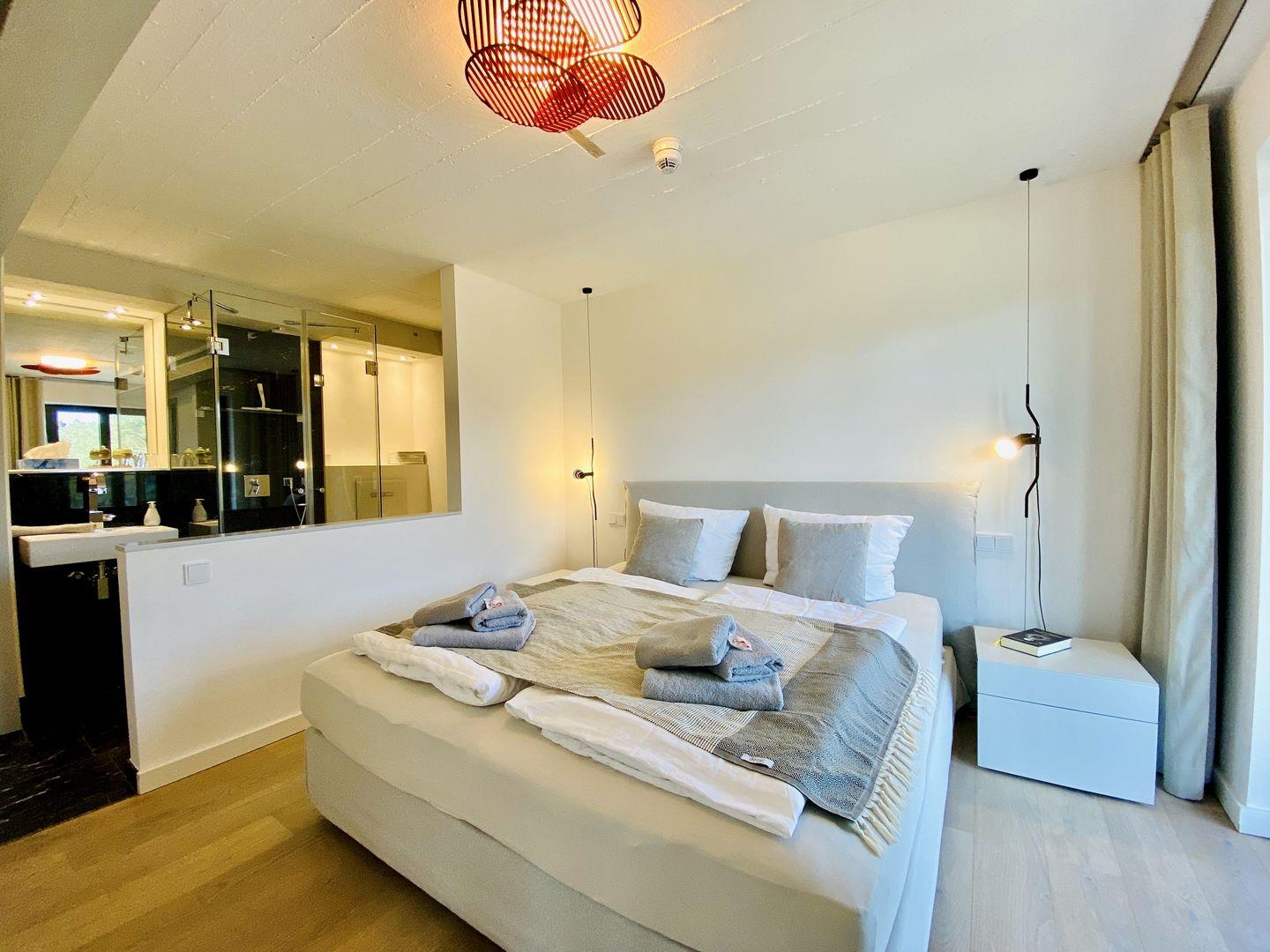 Beide Schlafzimmer versprechen erholsame und entspannende Nächte. In den großen Boxspringdoppelbetten der Marke Schramm wird das Schlafen zum Vergnügen. Die beiden Seeblick-Schlafzimmer haben jeweils ein En-Suite Badezimmer mit ebenerdiger Regendusche, Waschtisch und WC. Ein Schlafzimmer verfügt über einen Flachbild-Fernseher.