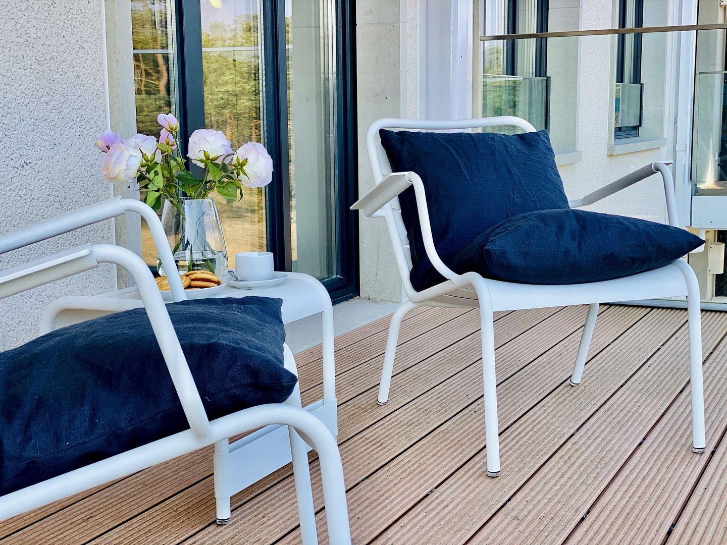 Der Fahrstuhl bringt Sie direkt in die dritte Etage der Düne 7. Ein wunderschönes und großzügiges Meerblick-Appartement in stilvollem Design wartet hier auf Sie. Auf 105 m² können es sich bis zu vier Personen und ein Kind richtig gut gehen lassen, gemeinsam den Urlaub genießen und eine unvergesslich schöne Zeit auf der Insel Rügen verbringen. Die Einrichtung der 3-Raum-Wohnung besticht durch ihre schlichte und moderne Eleganz. Nordisches Design und dezente Accessoires vermitteln Wohnlichkeit, die jeden Gedanken an Stress vergessen lässt. Die offene und helle Wohnungsdecke ist im Stil der Vergangenheit belassen und etwas ganz Besonderes. Das große Wohnzimmer hat bodentiefe Balkonfenster Richtung Meer und Richtung Süden, die viel Licht ins Innere der Ferienwohnung lassen. Ein stylischer Gas-Kamin sorgt für Wärme und kuschelige Behaglichkeit. Auf dem gemütlichen Dreisitzer-Sofa und in den beiden bequemen Sesseln haben Sie beste Plätze für ruhige Abende und beruhigende Blicke durch die Kiefernschonung hindurch auf den hauseigenen Pool, den Strand und das Meer. Treten Sie hinaus auf den Balkon und genießen Sie den Blick auf die Ostsee und lauschen Sie dem Toben der Wellen und den Schreien der Möwen. In diesem Urlaubsdomizil entspannen Sie mit allen Sinnen. In der voll ausgestatteten Eckküche finden Sie alles, was das Herz begehrt. Hochwertige Markengeräte von Bosch und WMF, erlesenes Geschirr – da wird das Kochen zu einem richtigen Urlaubs-Event. Essen können Sie am wunderschönen, filigranen weißen Tisch auf komfortablen Lederstühlen. Für Kaffeeliebhaber bietet die Küche eine Kaffeefiltermaschine und eine Nespressomaschine inklusive einiger Starter-Kapseln für den ersten Kaffeegenuss am Anreisetag.