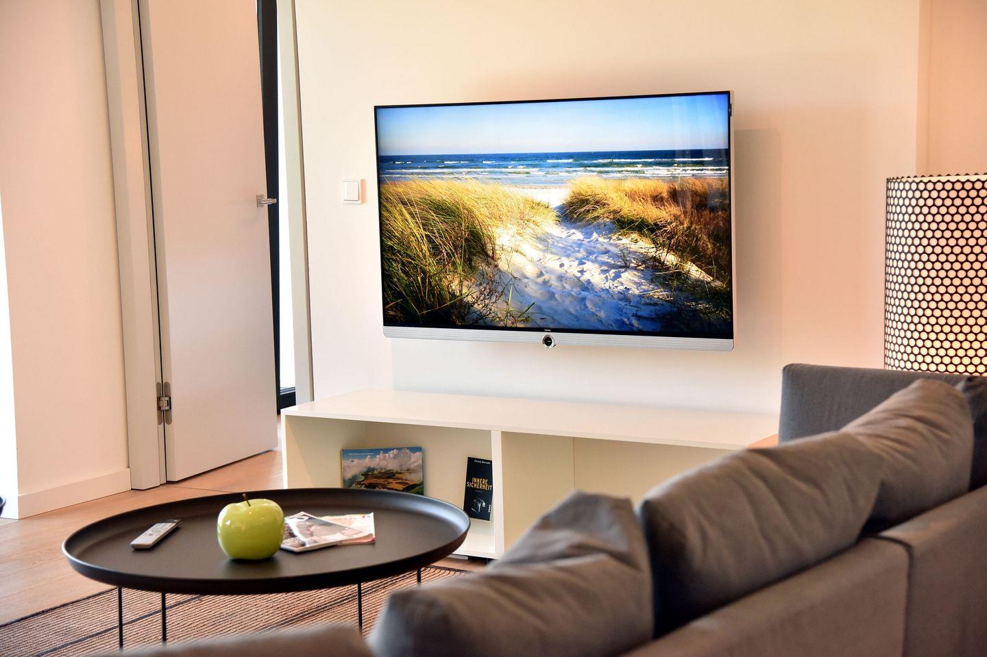 Ein Gäste-WC ist vom Wohnzimmer aus zugänglich. Die Handtücher liegen bereit und auch die Betten sind bei der Anreise bereits bezogen. Das WLAN ist kostenfrei und im 2. Obergeschoss des Hauses gibt es einen Waschmaschinen- und Trocknerraum zur kostenlosen Nutzung durch Gäste des Hauses. Außerdem ist für Ihr Auto ein kostenfreier Stellplatz im Parkhaus reserviert und Sie können viele SKY Sender kostenfrei auf dem Wohnzimmer Fernseher schauen. In den Sommermonaten stehen Ihnen der unbeheizte Pool vor dem Haus, Sonnenliegen am Pool und ein Strandkorb direkt am Strandabschnitt vor dem Haus zur Verfügung.