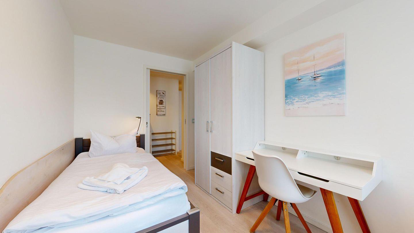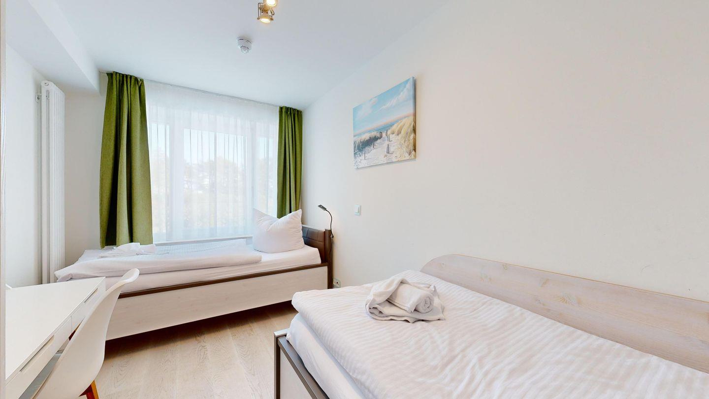 * 1 Schlafzimmer mit zwei Einzelbetten und Schreibtisch