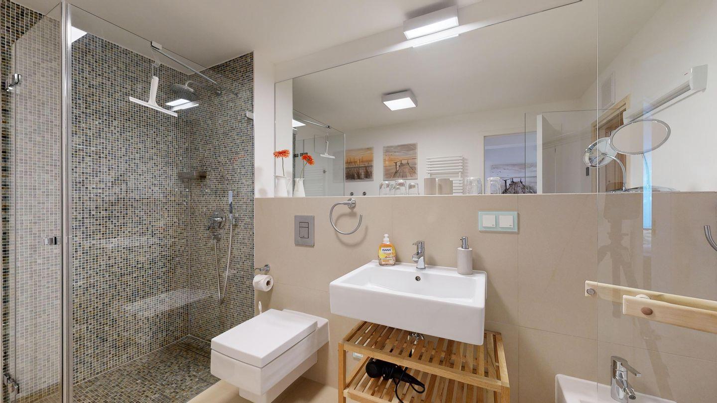 * 1 Badezimmer mit Dusche, Sauna, WC, BD, Föhn und großem Spiegel