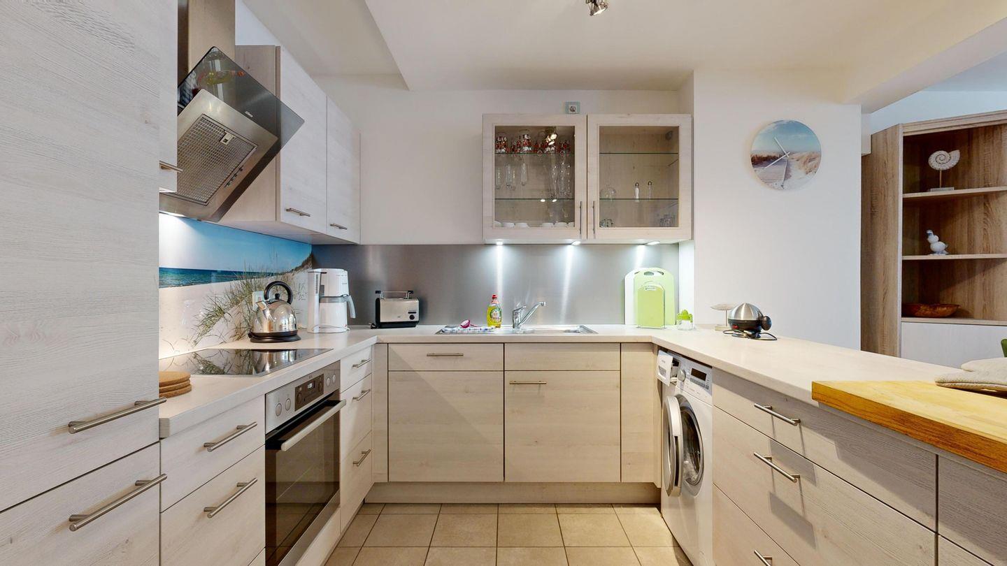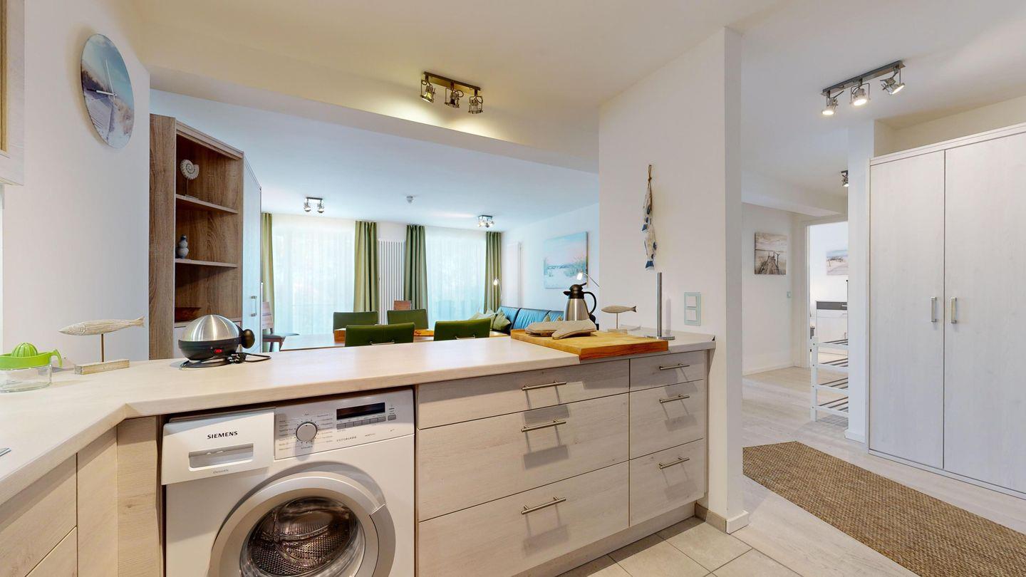 * Offene Küche: Moderne Küchenzeile mit Induktionsherd, Backofen, Spülmaschine, Wasserkocher, Waschmaschine, Filterkaffeemaschine und Toaster