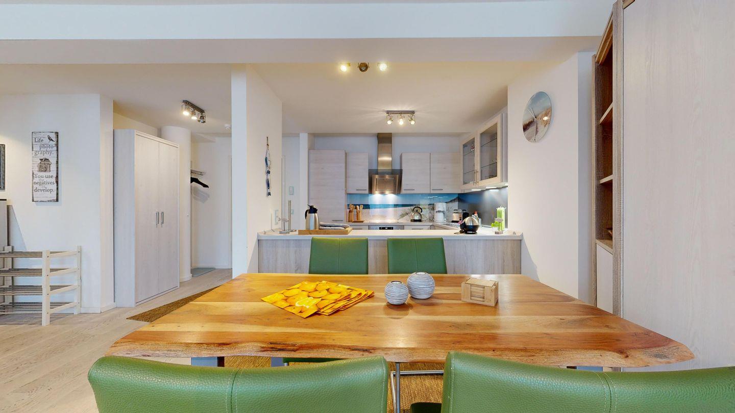 * Großer Wohnraum: Couchgarnitur (Schlafcouch für 1-2 Personen), großer Flachbildschirm, Internetzugang (WLAN inkl.), Esstisch für 4-6 Personen, Schrank für Stauraum