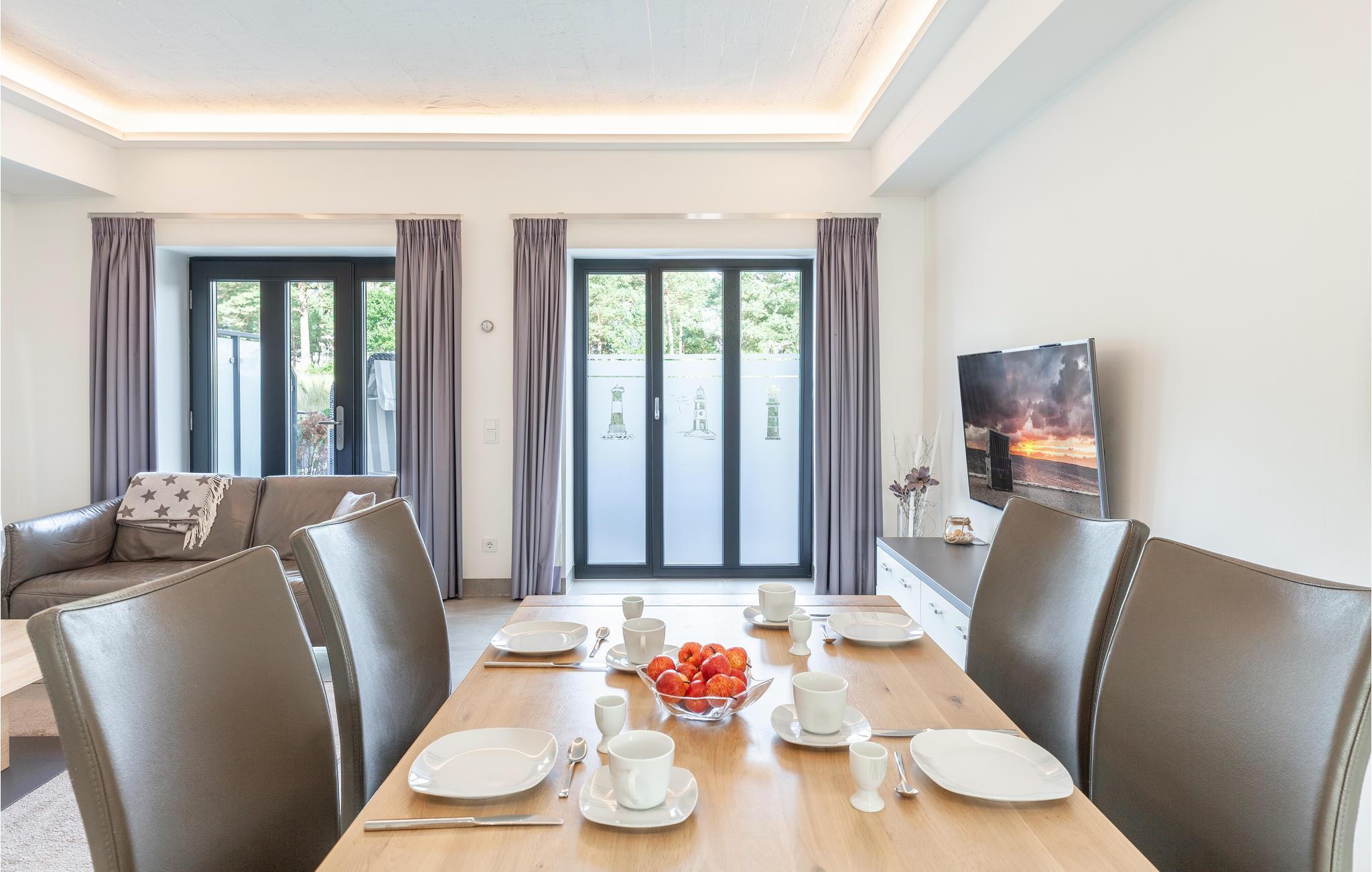 Die Ferienwohnung verspricht eine hochwertige Genuss- und Wohlfühlatmosphäre. Exklusive Möbel wurden perfekt aufeinander abgestimmt und stehen für ein Lebensgefühl, das Harmonie und Eleganz vereint. Jedes Möbelstück und Wohnaccessoire ist sorgfältig ausgewählt, nichts wurde dem Zufall überlassen. Insbesondere auf ein gesundes Raumklima und allergikerfreundliche Materialen wurde geachtet. Dank der drei Meter hohen Decken genießen Sie hier ein ganz besonders großzügiges Wohngefühl. Die mit fast 40m2 besonderes großzügig gestaltete Terrasse bietet genügend Platz, um die abendliche Ostseeluft im Kreise Ihrer Lieben ganz privat genießen zu können.