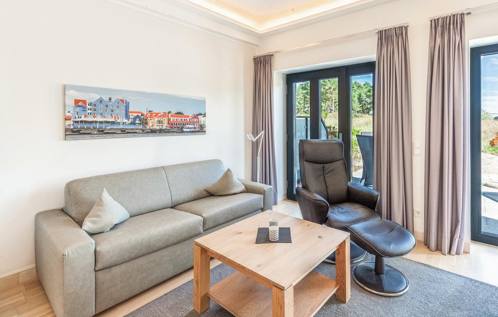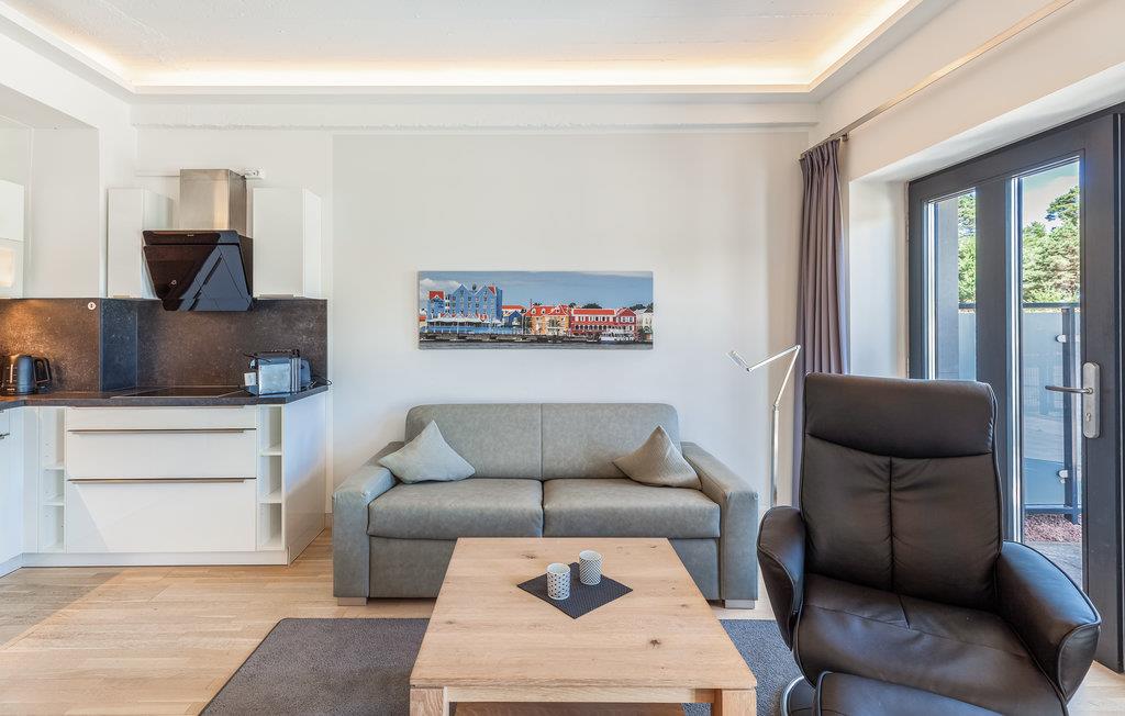 Vom besonders großzügigen Schlafzimmer im 1. Stock aus haben Sie direkten Zugang zum Balkon. Von hier aus können Sie einen herrlichen Blick über den Park und den Kiefernwald bis hin zur Ostsee genießen und die Seele baumeln lassen. Das Sofa im Wohnbereich lässt sich in zwei bequeme Schlafmöglichkeiten umwandeln (1,60 x 2,00 m).