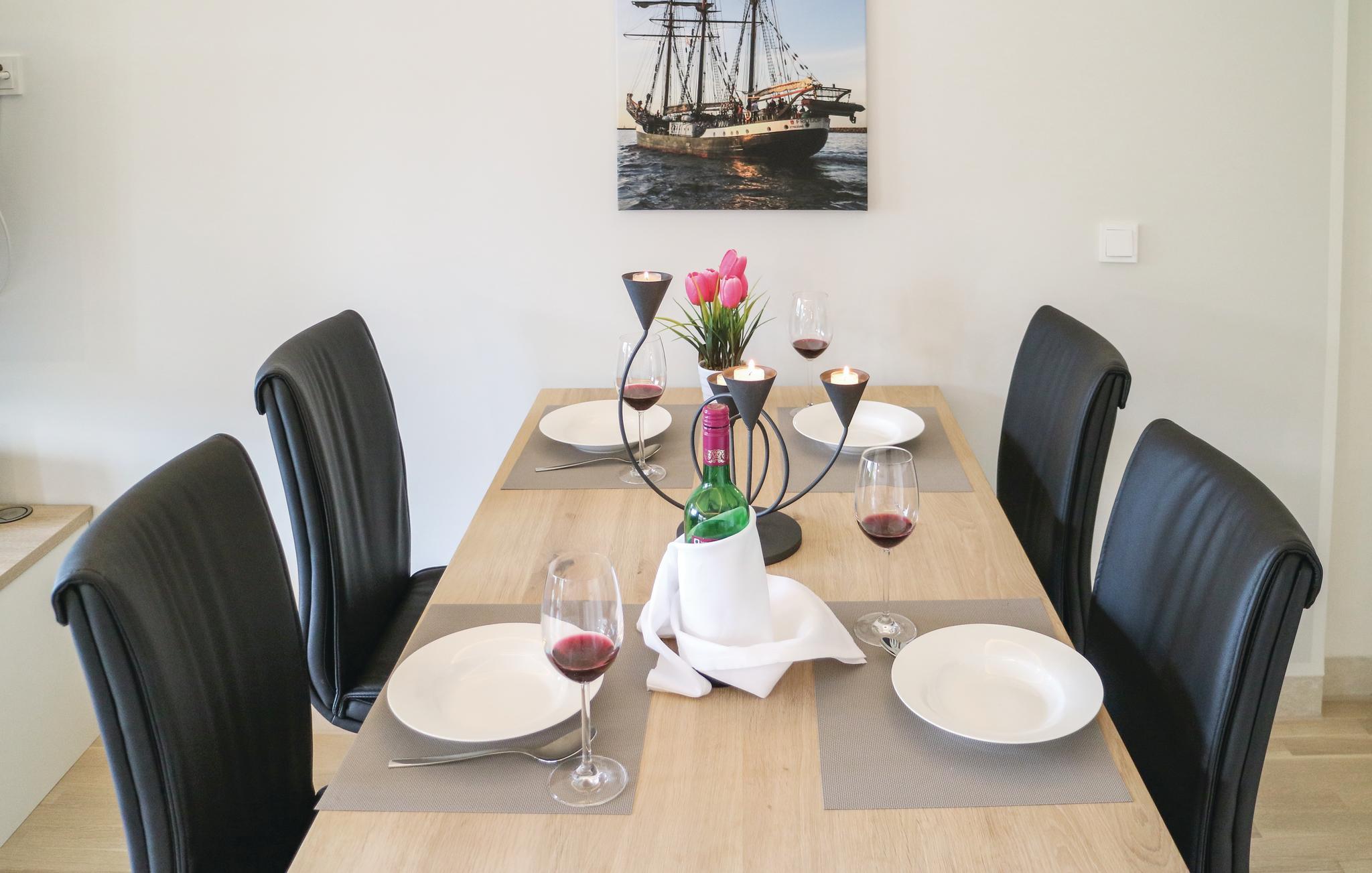 Die Ferienwohnung über zwei Etagen (EG und 1. OG) verspricht eine hochwertige Genuss- und Wohlfühlatmosphäre. Sie liegt am Südende des Gebäudeteils und bietet dank eines separaten Eingangs besonders viel Privatsphäre. Exklusive Möbel wurden perfekt aufeinander abgestimmt und stehen für ein Lebensgefühl, das Harmonie und Eleganz vereint. Jedes Möbelstück und Wohnaccessoire ist sorgfältig ausgewählt, nichts wurde dem Zufall überlassen. Insbesondere auf ein gesundes Raumklima und allergikerfreundliche Materialen wurde geachtet. Sowohl auf der teilweise überdachten, 17 m² großen Terrasse als auch auf dem kleinen Balkon lässt sich abendliche Ostseeluft ganz privat genießen. Beides ist natürlich mit hochwertigen Gartenmöbeln ausgestattet.