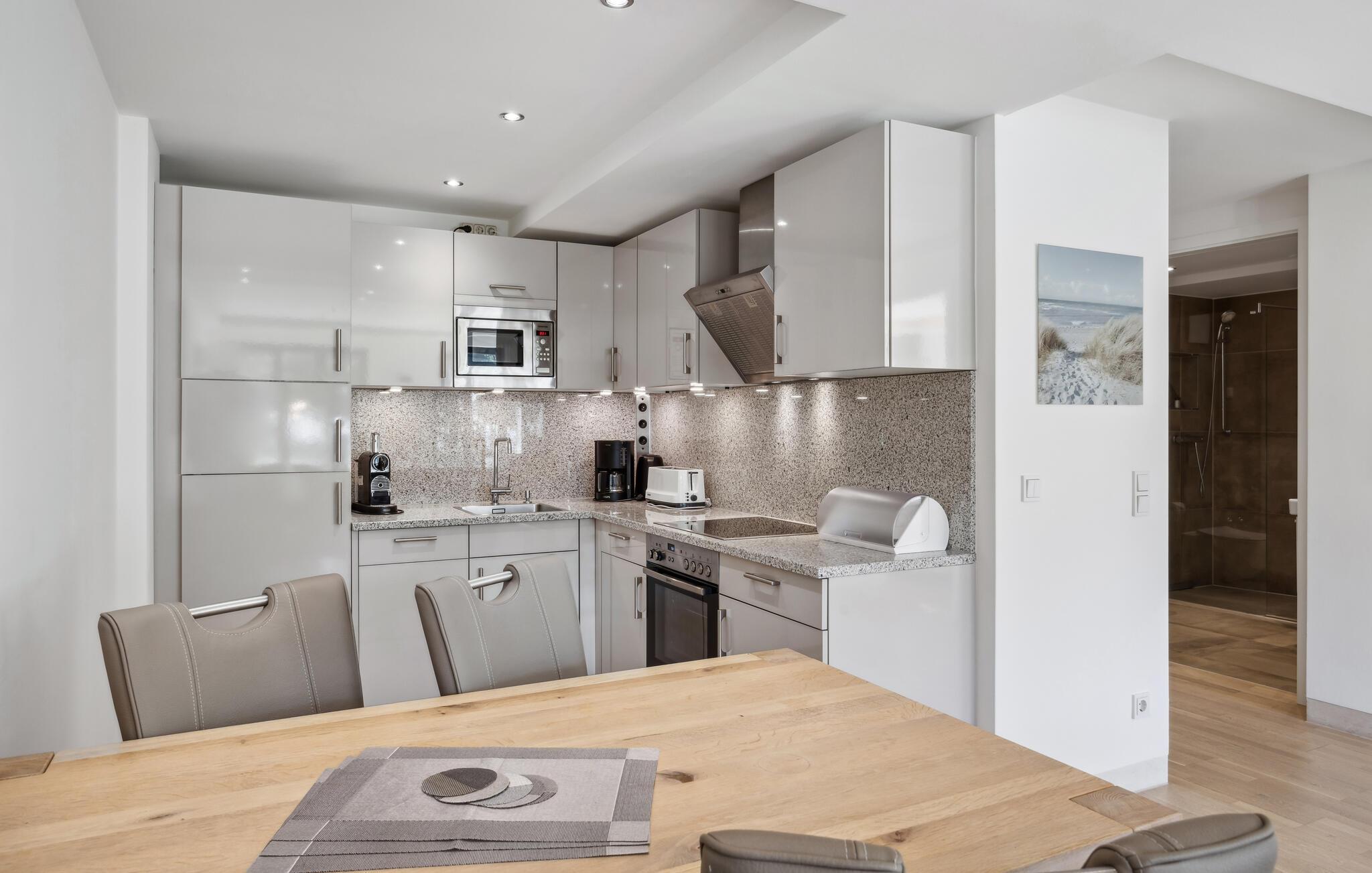 Besonders im großen Schlafzimmer erwartet Sie dank eines separaten Ankleidezimmers, eines eigenen TVs und des King-Size Bettes (2x2 m) viel Komfort. Auf dem Balkon lässt sich abendliche Ostseeluft ganz privat genießen. Von hier aus können Sie den Blick über den Garten von Prora Solitaire über den Kiefernwald bis hin zur Ostsee schweifen lassen. Die top ausgestattete Küche lässt ebenfalls keine Wünsche offen und lädt zu Kochabenden im Kreise Ihrer Lieben ein. Kaffeeliebhaber freuen sich sicherlich über die bereitstehende Nespresso-Maschine (Kapseln bitte mitbringen).