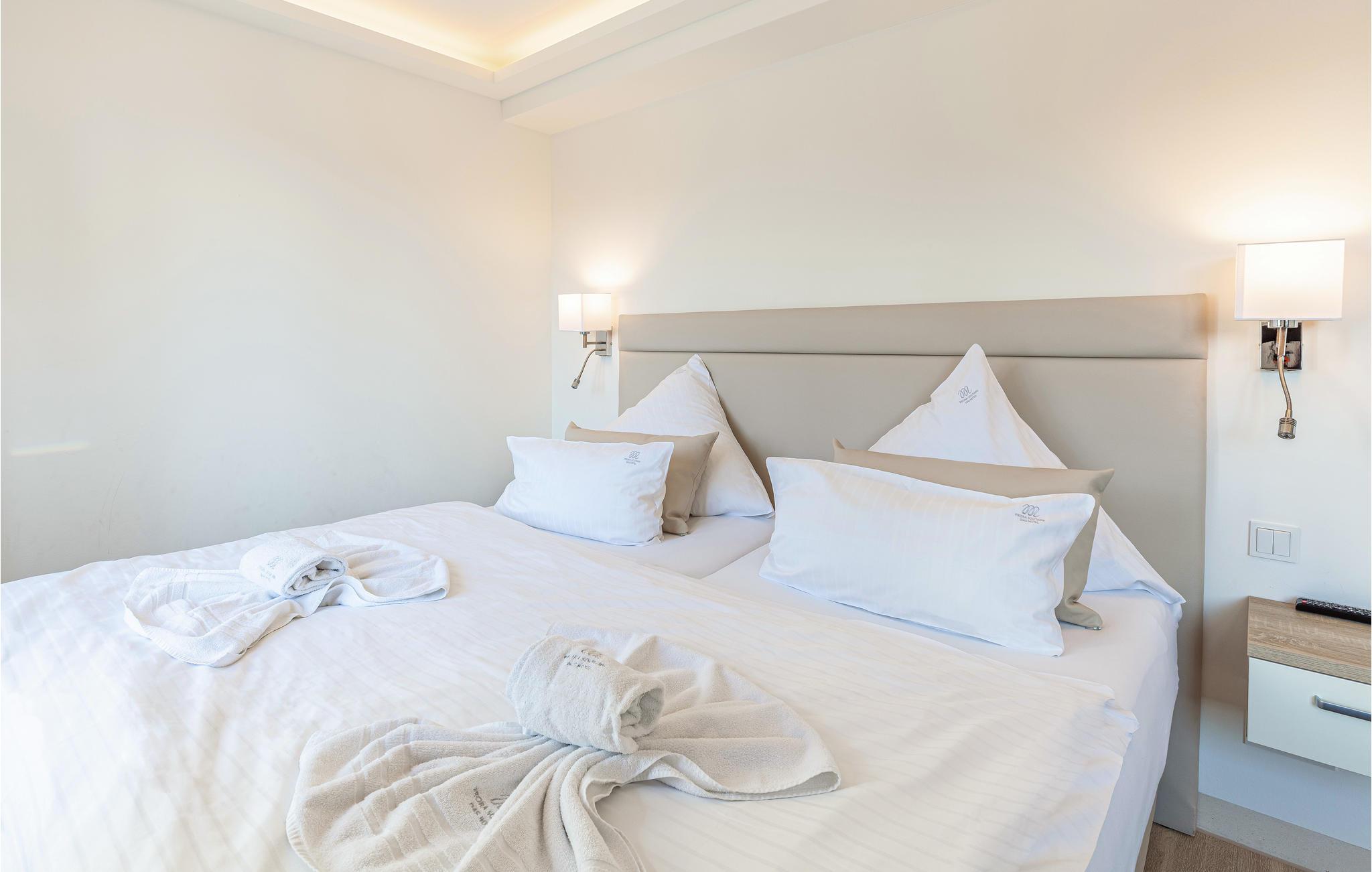 Auf über 75 m2 ist hier Platz für die ganze Familie. Mit zwei Schlafzimmern und zwei Bädern ist es ebenso perfekt geeignet für befreundete Paare geeignet, die gemeinsam verreisen. Vom großen Balkon aus können Sie einen schönen Blick auf die nur wenige Meter entfernte Ostsee mit ihrem fast karibisch anmutenden türkisen Wasser genießen. Vom Master-Schlafzimmer aus (mit besonders großen Bett, 2 x 2 m) haben Sie direkten Zugang zum Balkon, so dass Sie gleich morgens als erstes die Panoramaaussicht genießen können. Die Wohnung liegt am Ende dieses denkmalgeschützen Gebäudeteils, so dass sie sowohl nach Osten zum Meer als auch nach Westen zum Inselinneren hin Fensterfronten hat und besonders hell und lichtdurchflutet ist. Die Wohnung ist mit hochwertiger Unterhaltungstechnik ausgestattet: beide Schlafzimmer verfügen über einen eigenen Fernseher, und im Wohnzimmer garantiert eine hochwertige Marken-Stereoanlage den perfekten Sound.