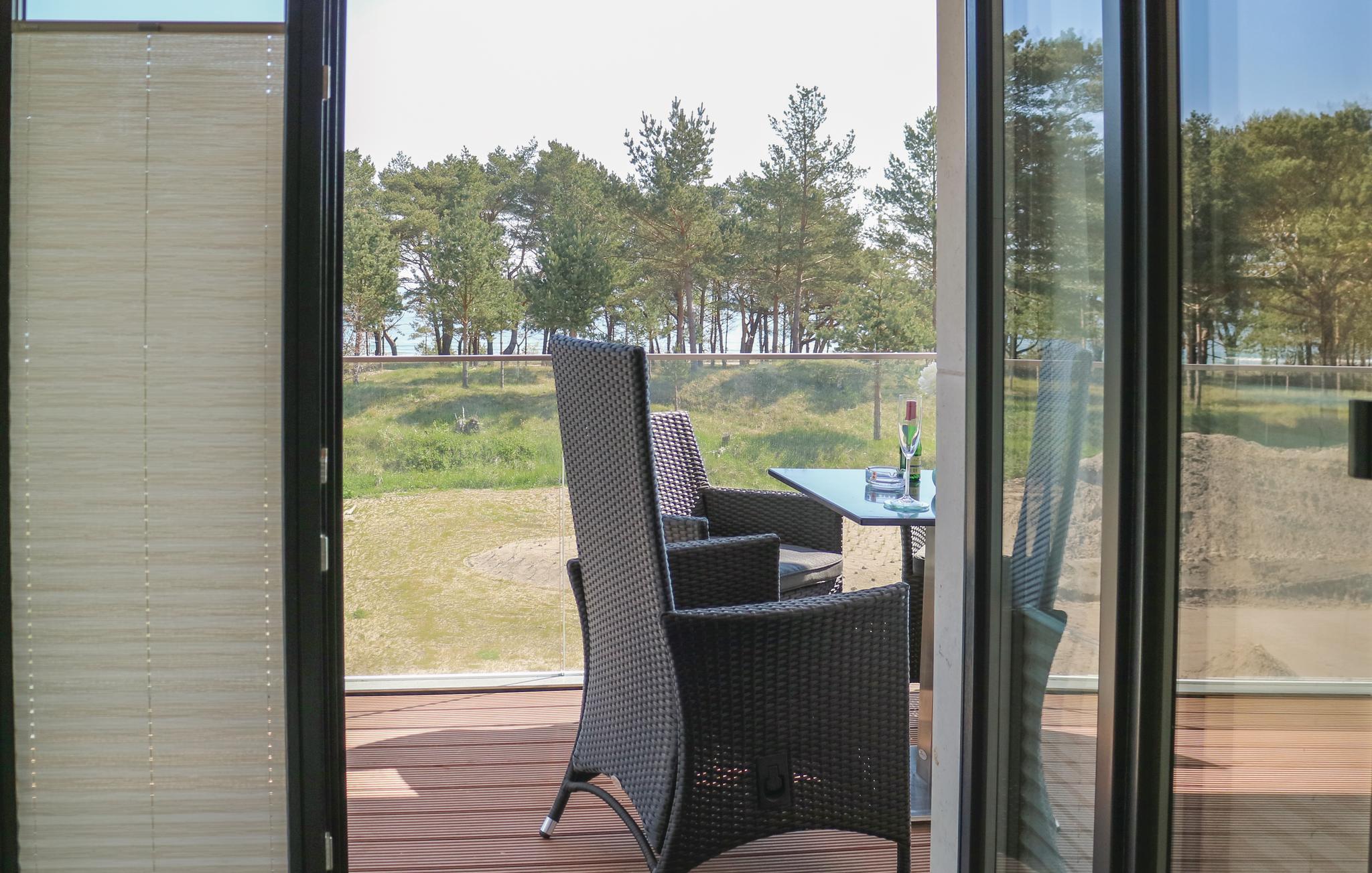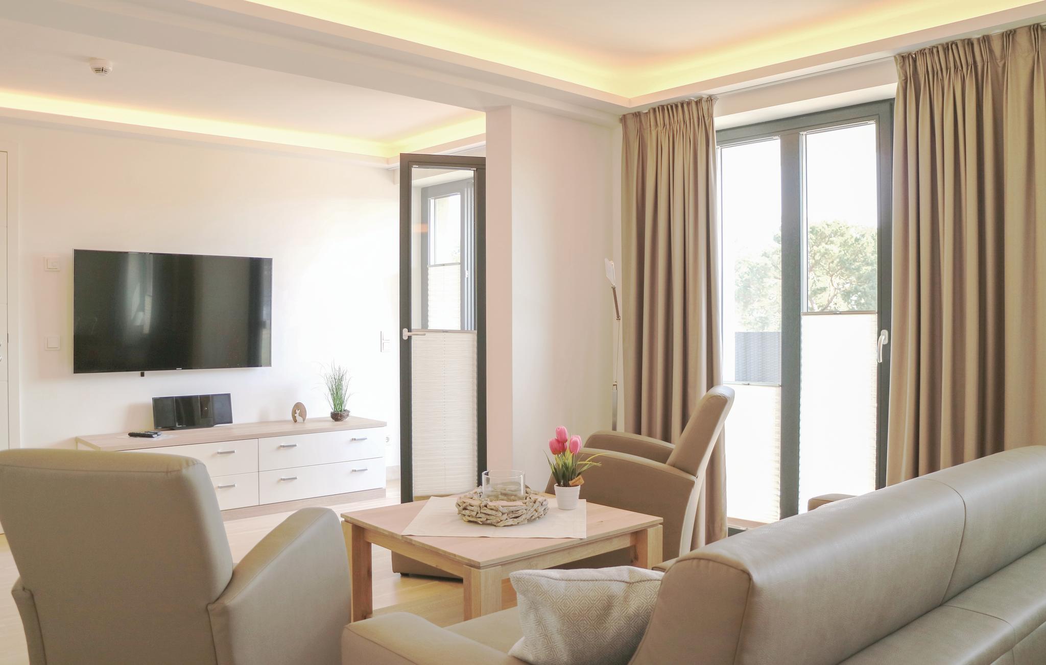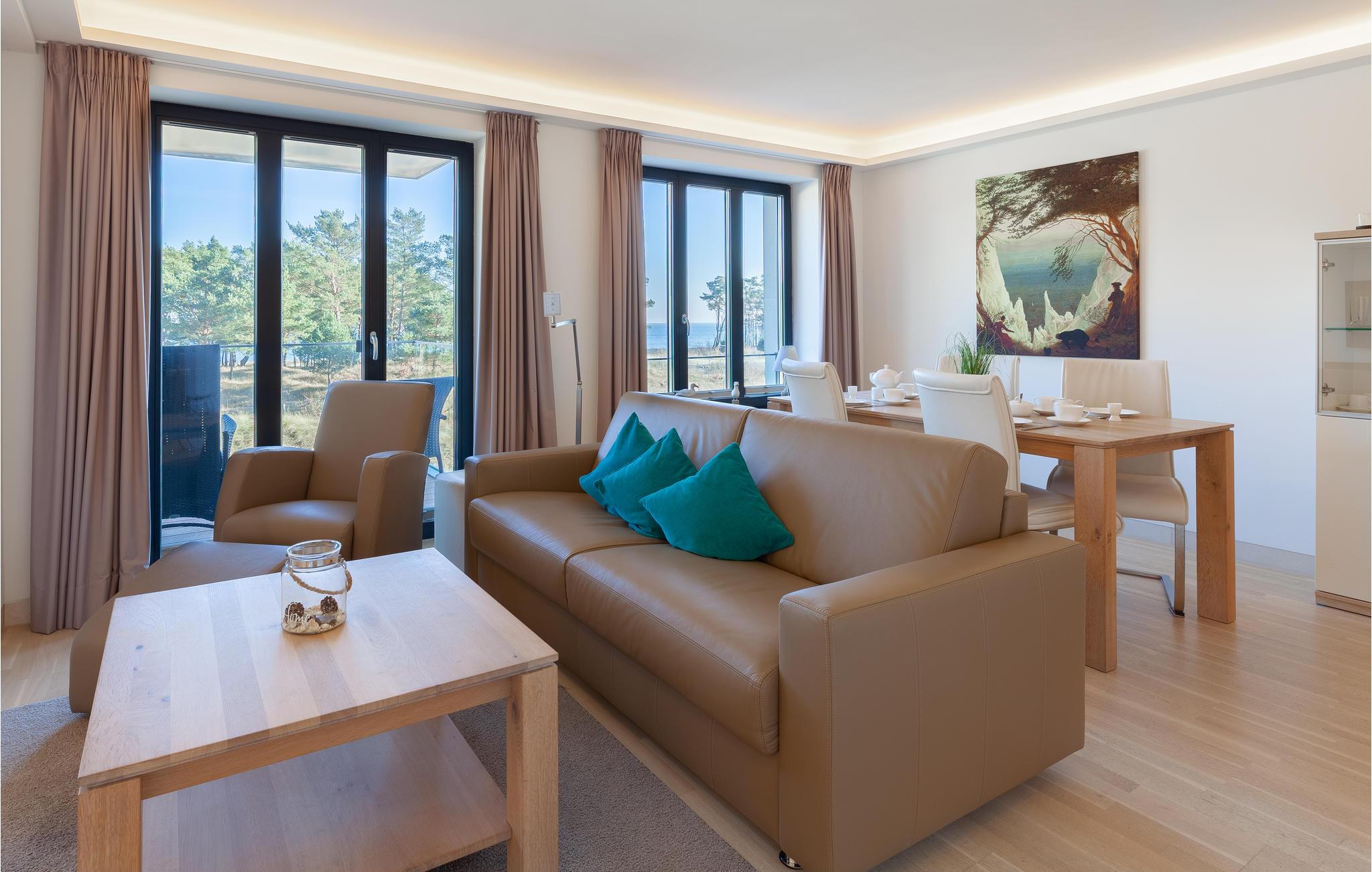 Moderne Ferienwohnung in Prora mit Meerblick, Pool, Wellnessbereich und direktem Strandzugang für erholsame Urlaubstage.
