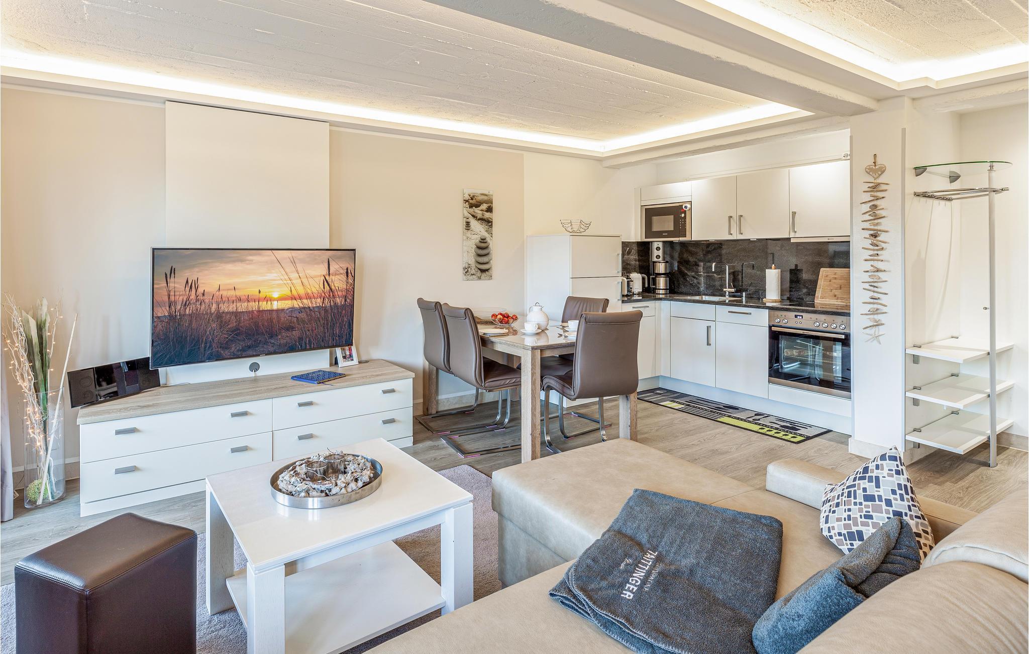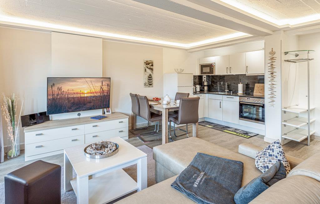 Die Ferienwohnung verspricht eine hochwertige Genuss- und Wohlfühlatmosphäre. Exklusive Möbel wurden perfekt aufeinander abgestimmt und stehen für ein Lebensgefühl, das Harmonie und Eleganz vereint. Jedes Möbelstück und Wohnaccessoire ist sorgfältig ausgewählt - nichts wurde dem Zufall überlassen. Insbesondere auf ein gesundes Raumklima und allergikerfreundliche Materialien wurde geachtet. Auf über 40m² finden Sie hier alle Annehmlichkeiten. Der großzügige, offene Wohnbereich ist dank der großen Fensterfronten lichtdurchflutet, der Blick öffnet sich und kann über den kleinen Kiefernwald bis hin zum türkisen Wasser der Ostsee schweifen. Zwei große Türen erlauben Zugang zum fast 10m² großen Balkon. Entspannung pur! Der separate Schlafbereich ist mit einem eigenen TV-Gerät ausgestattet und durch eine moderne Schiebetür vom Wohnraum getrennt. Das Sofa im Wohnbereich kann in zwei weitere komfortable Schlafplätze umgewandelt werden (1,60 x 2,00 m)
