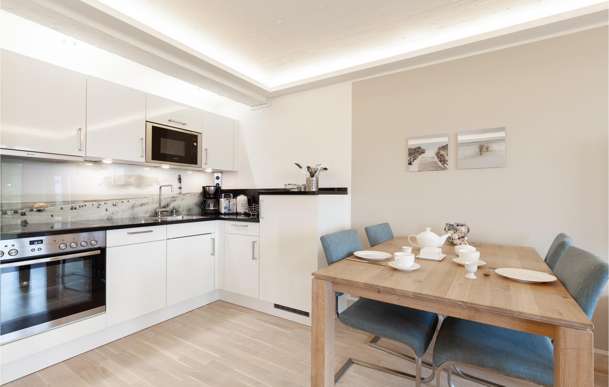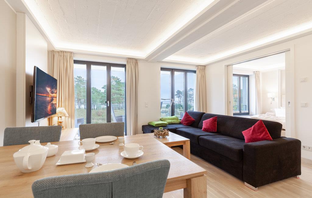 Die Ferienwohnung verspricht eine hochwertige Genuss- und Wohlfühlatmosphäre. Exklusive Möbel wurden perfekt aufeinander abgestimmt und stehen für ein Lebensgefühl, das Harmonie und Eleganz vereint. Jedes Möbelstück und Wohnaccessoire ist sorgfältig ausgewählt - nichts wurde dem Zufall überlassen. Insbesondere auf ein gesundes Raumklima und allergikerfreundliche Materialien wurde geachtet. Auf über 40m2 finden Sie hier alle Annehmlichkeiten. Der großzügige, offene Wohnbereich ist dank der großen Fensterfronten lichtdurchflutet, der Blick öffnet sich und kann über den kleinen Kiefernwald bis hin zum türkisen Wasser der Ostsee schweifen. Zwei große Türen erlauben Zugang zum fast 10m2 großen Balkon mit hochwertigen Gartenmöbeln. Entspannung pur! Der separate Schlafbereich ist mit einem eigenen TV-Gerät ausgestattet und durch eine moderne Schiebetür vom Wohnraum getrennt. Das Sofa im Wohnbereich kann in zwei weitere komfortable Schlafplätze umgewandelt werden (1,60 x 2,00 m)