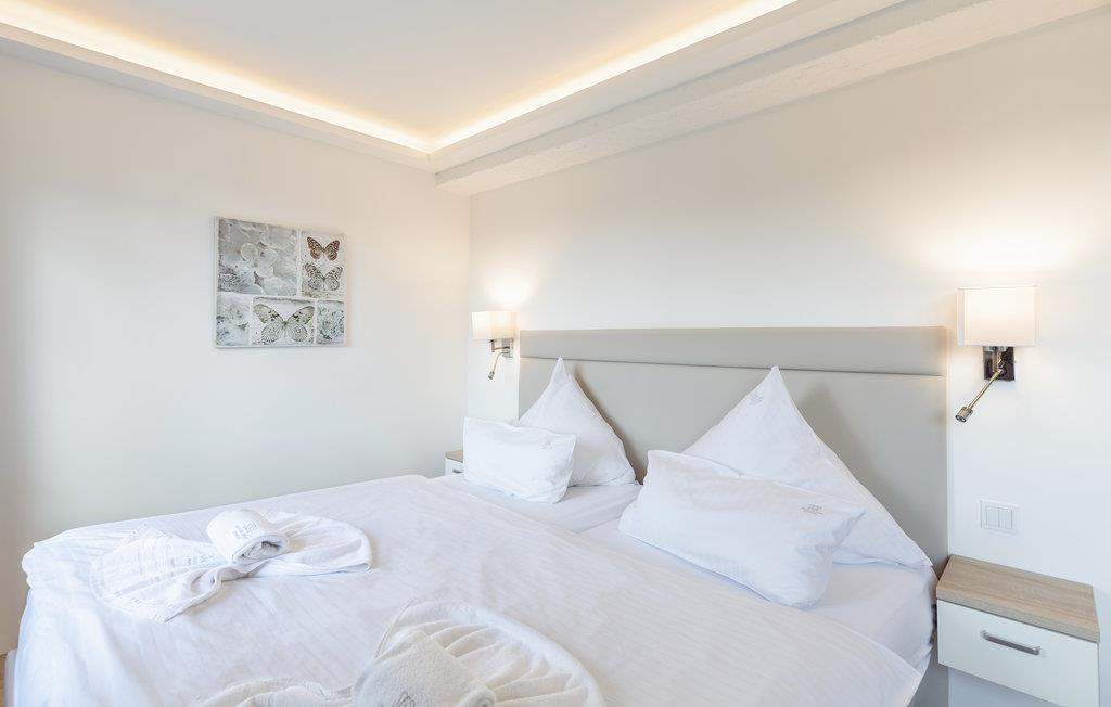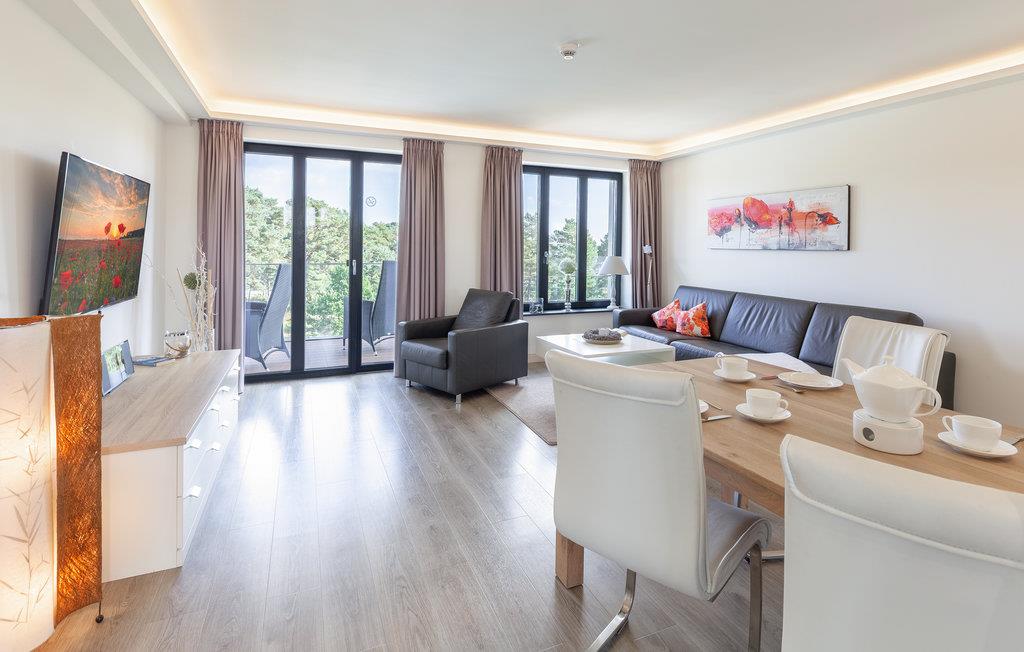 Auf über 75 m2 ist hier Platz für die ganze Familie. Mit zwei Schlafzimmern und zwei Bädern - eines davon mit Badewanne - ist es auch perfekt geeignet für befreundete Paare geeignet, die gemeinsam verreisen. Vom großen Balkon aus können Sie einen schönen Blick auf die nur wenige Meter entfernte Ostsee mit ihrem fast karibisch anmutenden türkisen Wasser genießen. Die Wohnung liegt am Ende dieses denkmalgeschützen Gebäudeteils, so dass sie sowohl nach Osten zum Meer als auch nach Westen zum Inselinneren hin Fensterfronten hat und somit besonders hell und lichtdurchflutet ist. Vom Master-Schlafzimmer aus haben Sie direkten Zugang zum Balkon und können morgens so direkt als erstes die Panoramaaussicht genießen. Auch vom großzügigen Wohn/Essbereich aus können Sie den Balkon betreten.