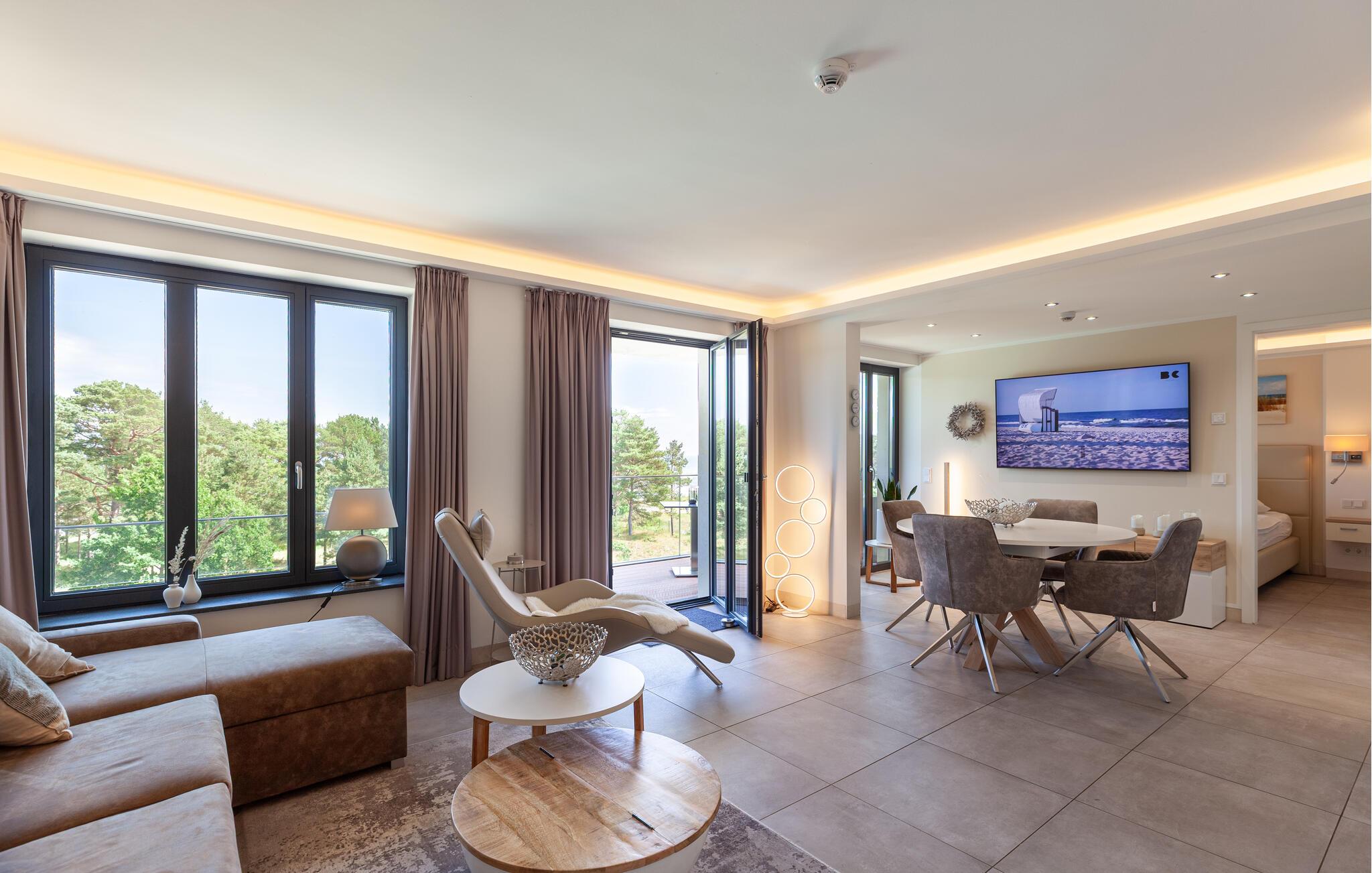Moderne Ferienwohnung in Prora mit Ostseeblick, Pool, Wellness und Strandnähe für erholsame Urlaubstage.