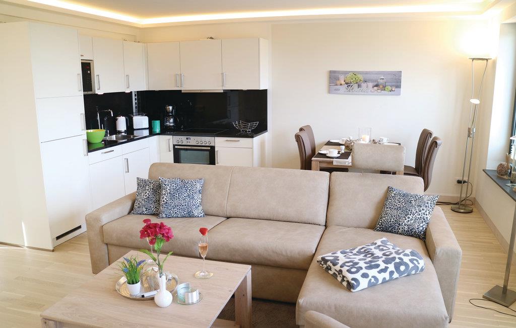 Vom lichtdurchfluteten, offenen Wohnbereich aus haben Sie Zugang zu Ihrem privaten, ca. 10m2 großen Balkon mit Blick bis hin zur Ostsee: die Wohnung liegt im 5. und somit obersten Stockwerk des denkmalgeschützen Gebäudes - der unverstellte Meerblick ist von hier aus einfach überwältigend. Genießen Sie den Ausblick auf das Treiben unter Ihnen, oder entspannen Sie einfach auf den zur Ausstattung gehörenden Sonnenliegen. Das Sofa im Wohnbereich lässt sich in zwei komfortable Schlafplätze umwandeln (1,60 x 2,00 m). Die top ausgestattete Küche lässt ebenfalls keine Wünsche offen und lädt zu Kochabenden im Kreise Ihrer Lieben ein. Kaffeeliebhaber freuen sich sicherlich über die bereitstehende Nespresso-Maschine (Kapseln bitte mitbringen).