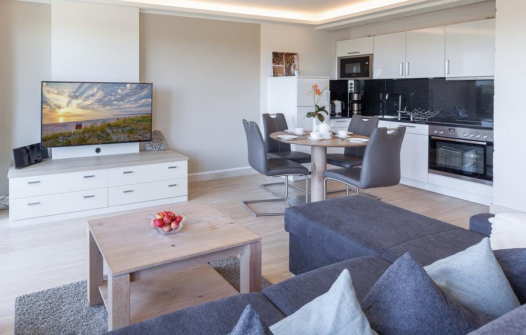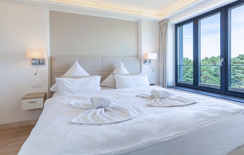 Auf über 40m2 finden Sie hier alle Annehmlichkeiten. Der großzügige, offene Wohnbereich ist dank der großen Fensterfronten lichtdurchflutet, der Blick öffnet sich und kann über den kleinen Kiefernwald bis hin zum türkisen Wasser der Ostsee schweifen. Zwei große Türen erlauben Zugang zum fast 10m2 großen Balkon mit hochwertigen Gartenmöbeln. Entspannung pur! Der separate Schlafbereich ist mit einem eigenen TV-Gerät ausgestattet und durch eine moderne Schiebetür vom Wohnraum getrennt. Das Sofa im Wohnbereich lässt sich bei Bedarf mit wenigen Handgriffen in zwei Schlafmöglichkeiten umwandeln (Liegefläche 1,20 x 2,00 m). Das Bad ist dank einer 90 cm breiten Tür und einer schwellenlosen Dusche auch für Gäste mit eingeschränkter Mobilität geeignet.