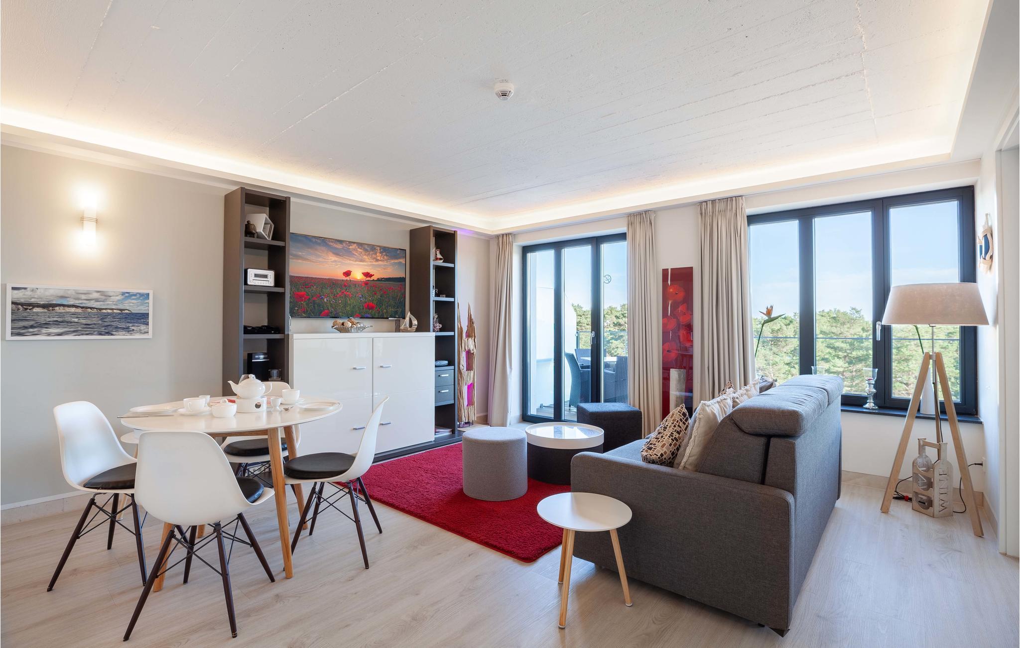 Die moderne Wohnung erwartet ihre Gäste nur wenige Schritte vom wunderschönen Strand entfernt. Machen Sie es sich in dem hochwertig ausgestatteten und hellen Apartment gemütlich und verbringen Sie einen unvergesslichen Urlaub in ansprechendem Ambiente. Der großzügige, offene Wohnbereich ist dank der großen Fensterfronten lichtdurchflutet, der Blick öffnet sich und kann über den kleinen Kiefernwald bis zur Ostsee schweifen.