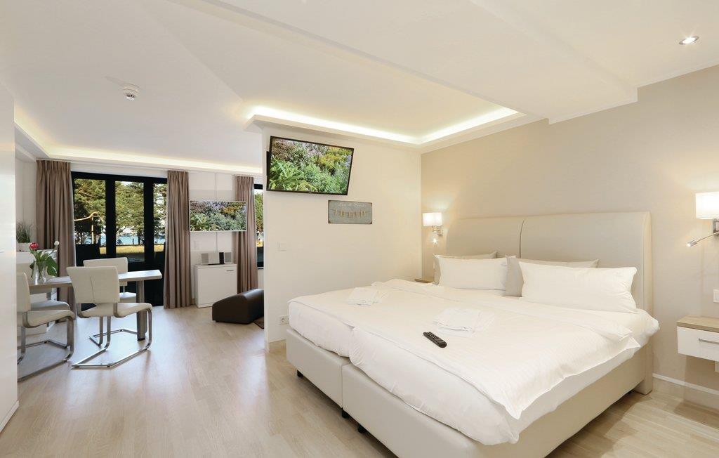Das exklusive Studio-Apartment ist das perfekte Domizil für einen traumhaften Urlaub zu zweit oder zu viert auf der schönen Insel Rügen. Das Apartment ist raffiniert gestaltet, so dass sich auf kleinem Raum alles finden lässt, was Sie für einen entspannten Urlaub benötigen: die praktische Küchenzeile samt Esstisch, ein Schlafbereich mit hochwertigem Boxspringbett, ein gemütlicher, heller Wohnbereich und natürlich das Highlight des Studios: der private Balkon mit Blick auf die parkähnliche Gartenanlage, den urigen Kiefernwald und die dahinter funkelnde Ostsee.