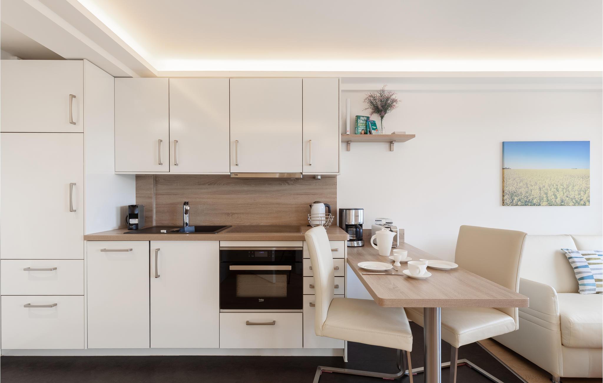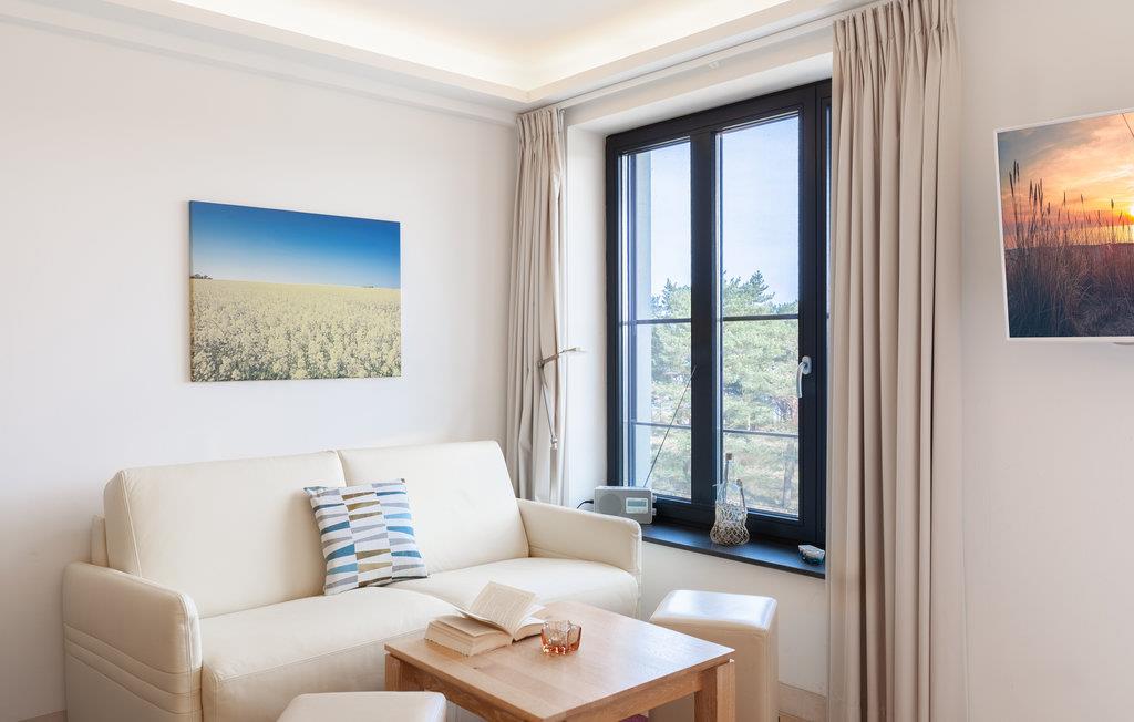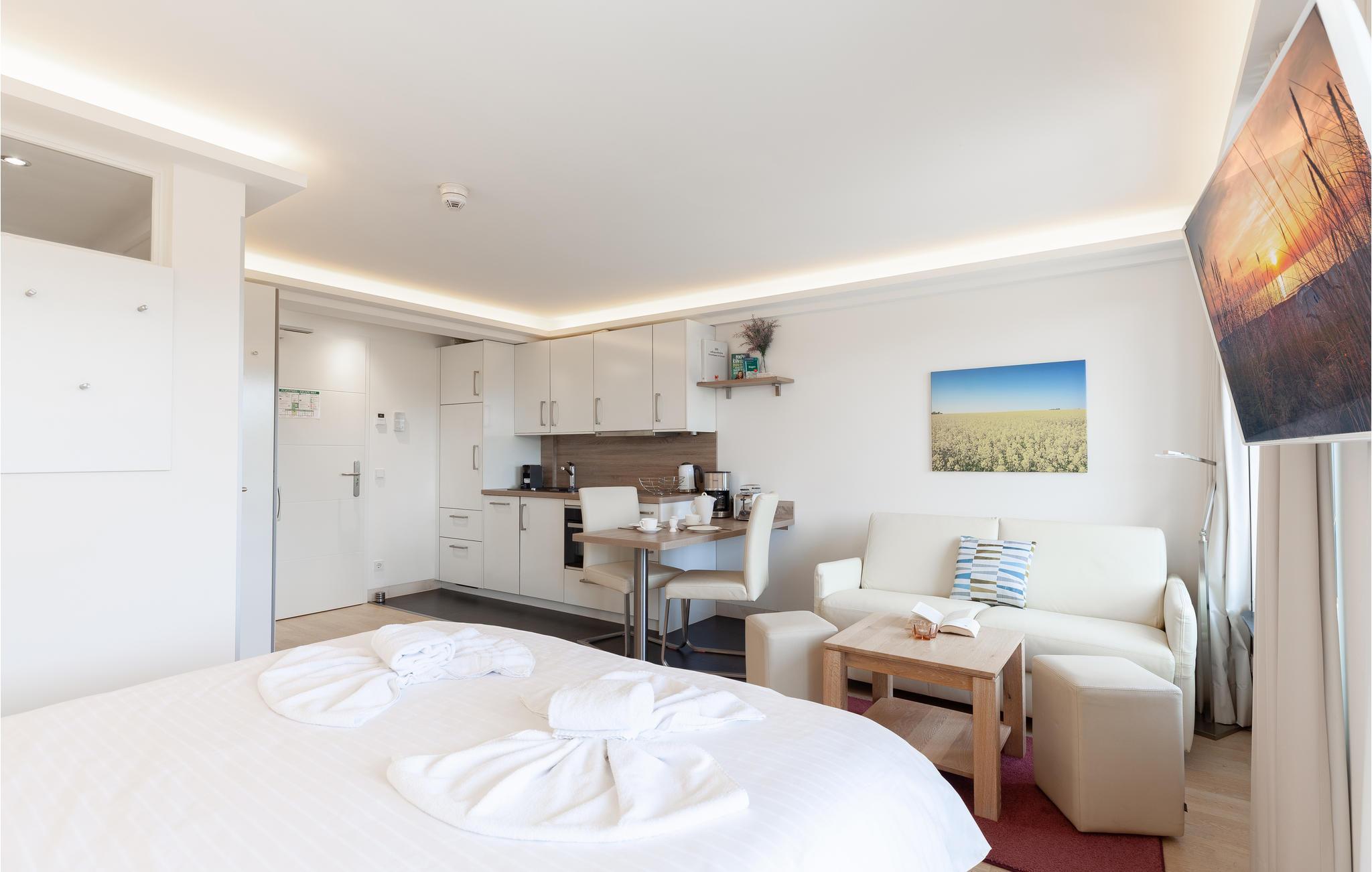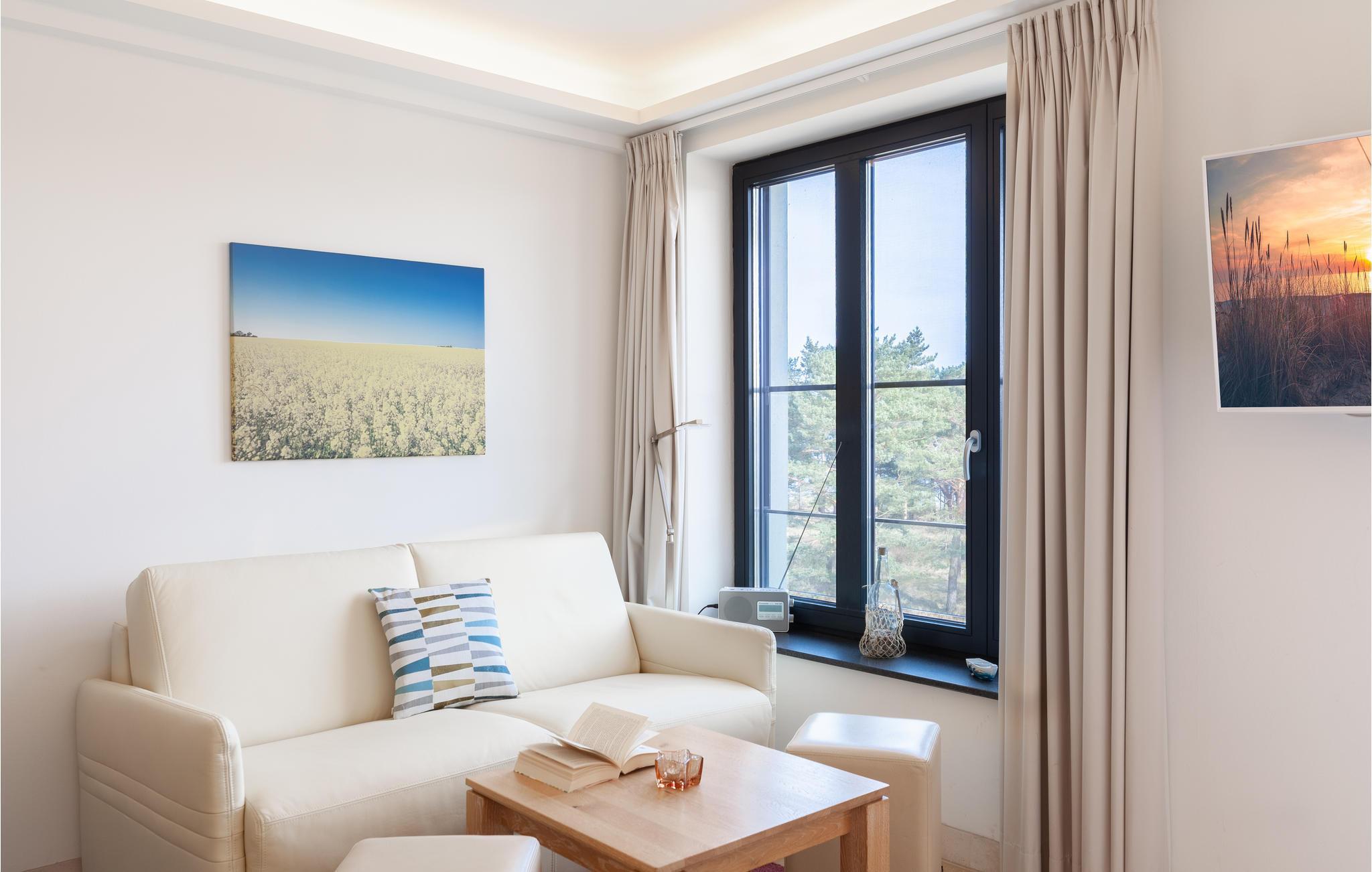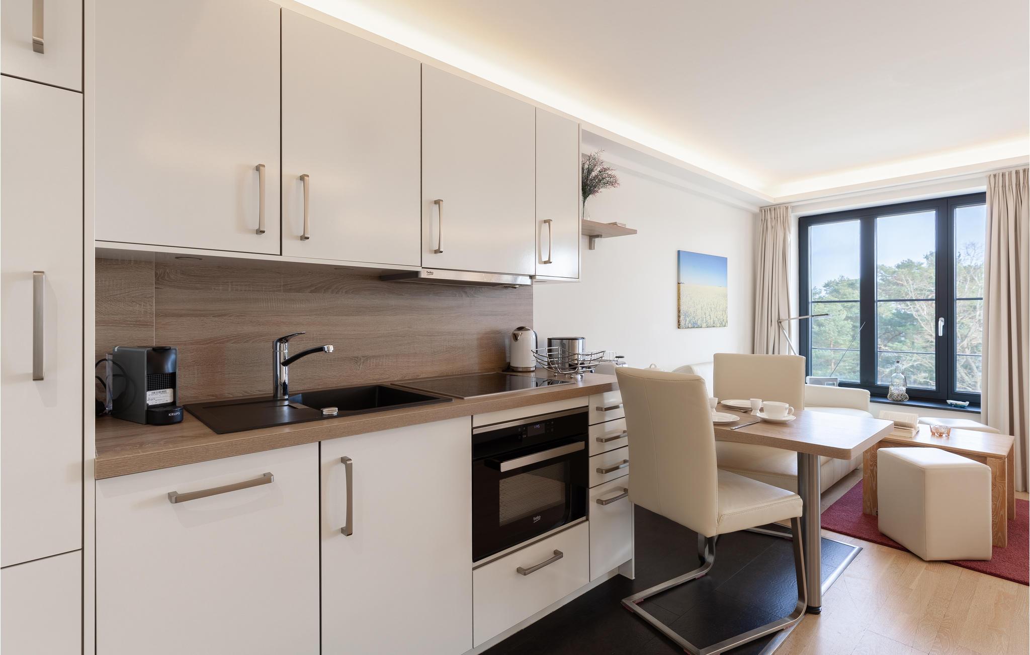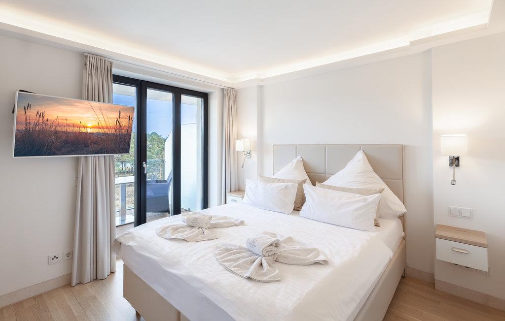Die kleinen Studio-Apartments mit großem Effekt sind perfekt für den Urlaub zu zweit. Hier aus dem 4. Stock können Sie einen herrlichen Blick auf die Gartenanlage, den Kiefernwald und die glitzernden Wellen der Ostsee genießen. Auf 28 m2 können Sie in dieser edlen und modernen Wohnung den perfekten Urlaub an der Ostsee verbringen. Eine kleine Küchenzeile steht zur Verfügung, wenn Sie keines der Restaurants und Cafés der Ferienanlage nutzen möchten, sondern Ihr Abendessen oder Frühstück selbst zubereiten und vielleicht auf dem wunderbaren kleinen Balkon genießen möchten, der zur Wohnung gehört. Große Panoramafenster bringen viel Licht in das helle Studio und das hochwertige Boxspringbett garantiert Ihren erholsamen Schlaf.