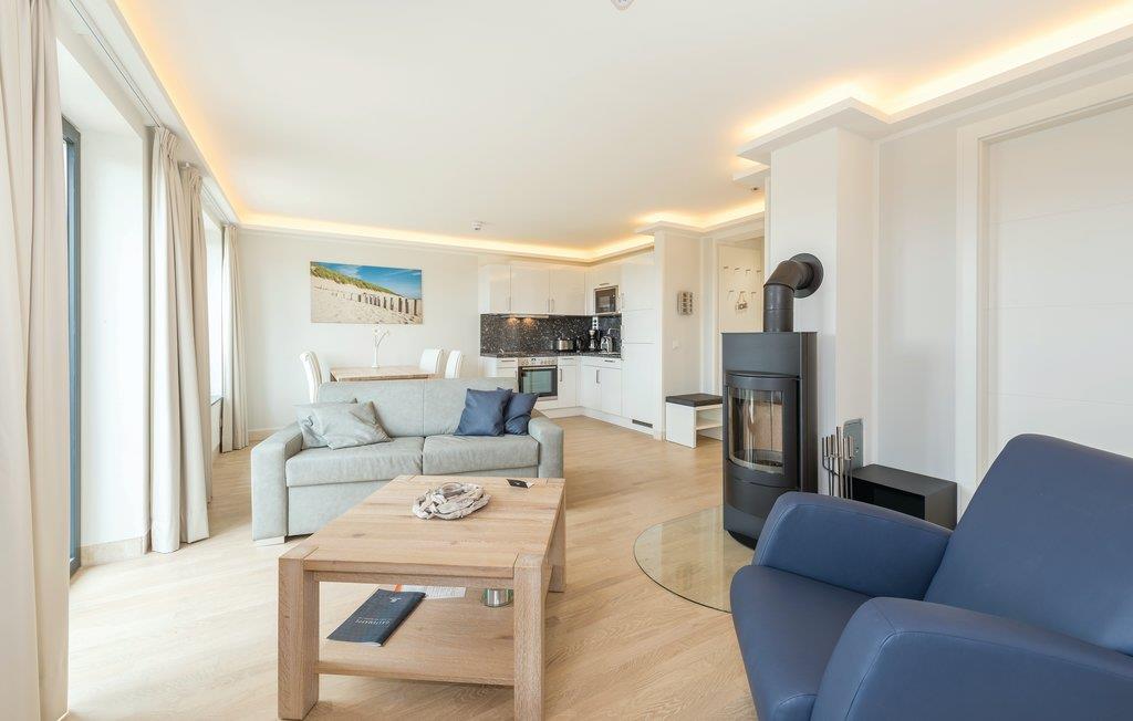 Vom lichtdurchfluteten, offenen Wohnbereich aus haben Sie Zugang zu Ihrem privaten, ca. 10 m² großen Balkon mit traumhaftem Panoramablick aus dem 5. Stock über den kleinen Kiefernwald bis hin zur Ostsee. Im Winter können Sie es sich vor dem Kaminfeuer im Wohnzimmer richtig gemütlich machen, während Sie den Blick über Rügen schweifen lassen. Das Master-Schlafzimmer ist besonders großzügig geschnitten und mit einem Boxspringbett ausgestattet (Doppelbett mit 2 m Länge). Das Sofa im Wohnbereich lässt sich in zwei komfortable Schlafplätze umwandeln.