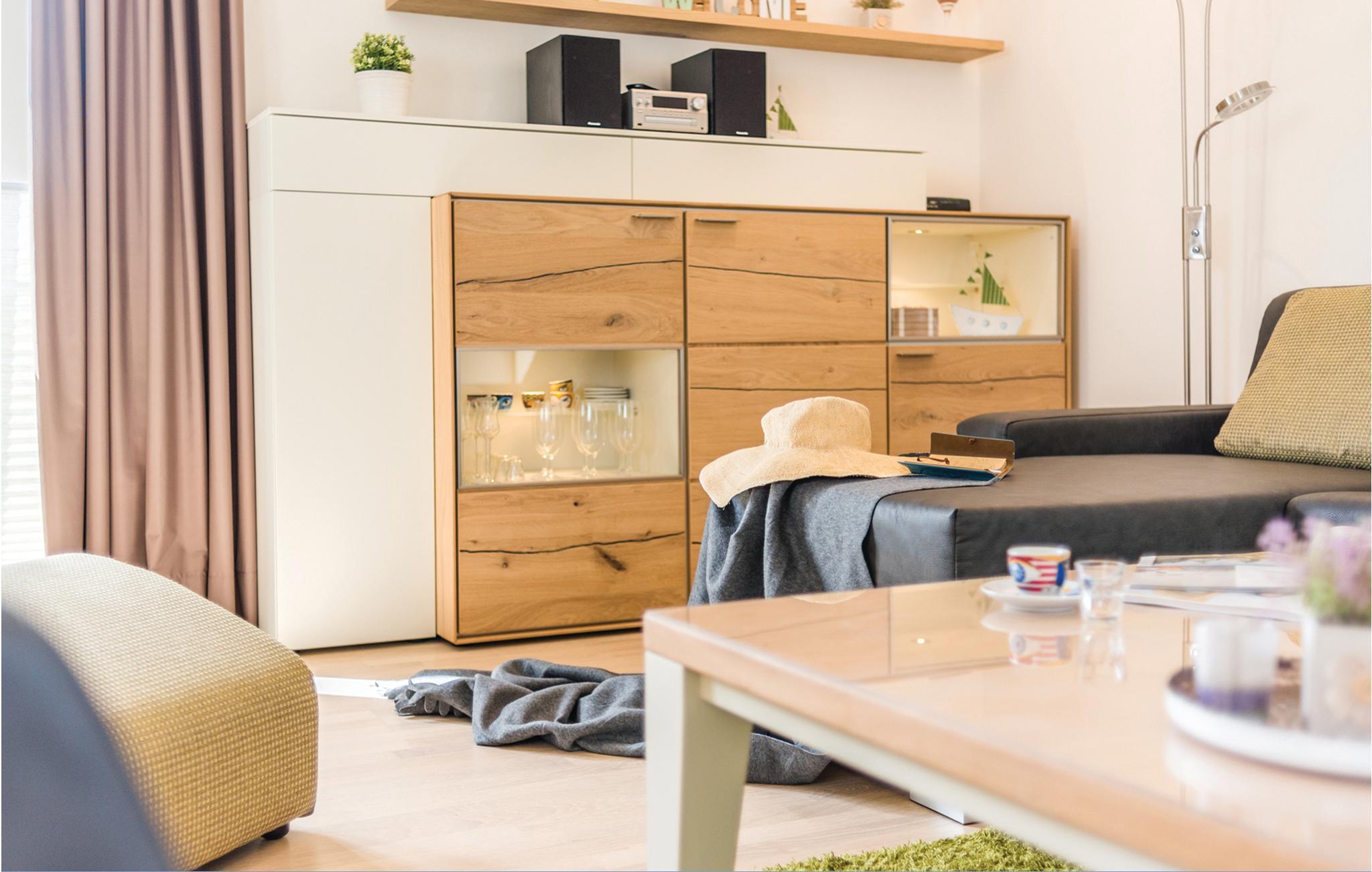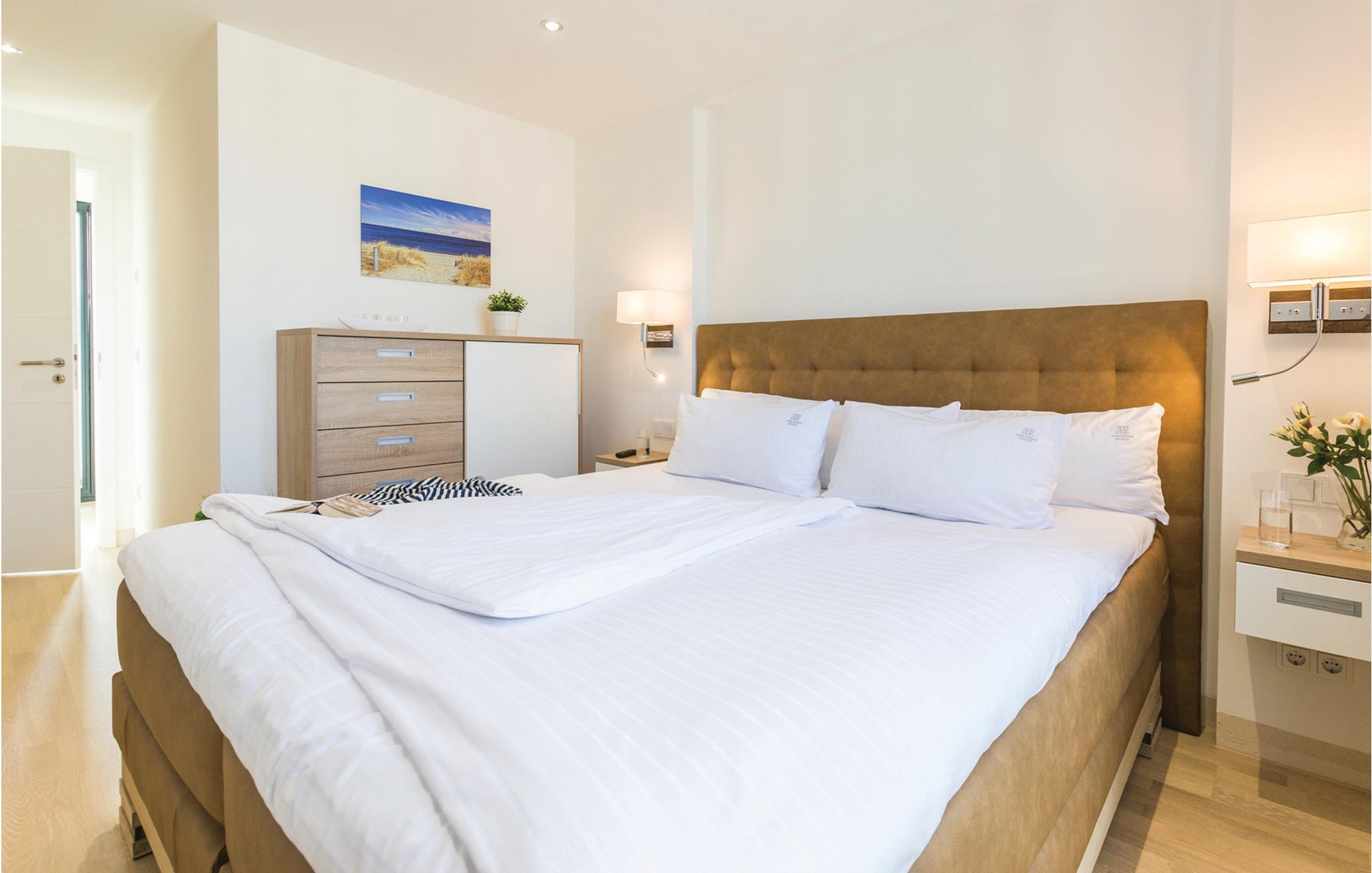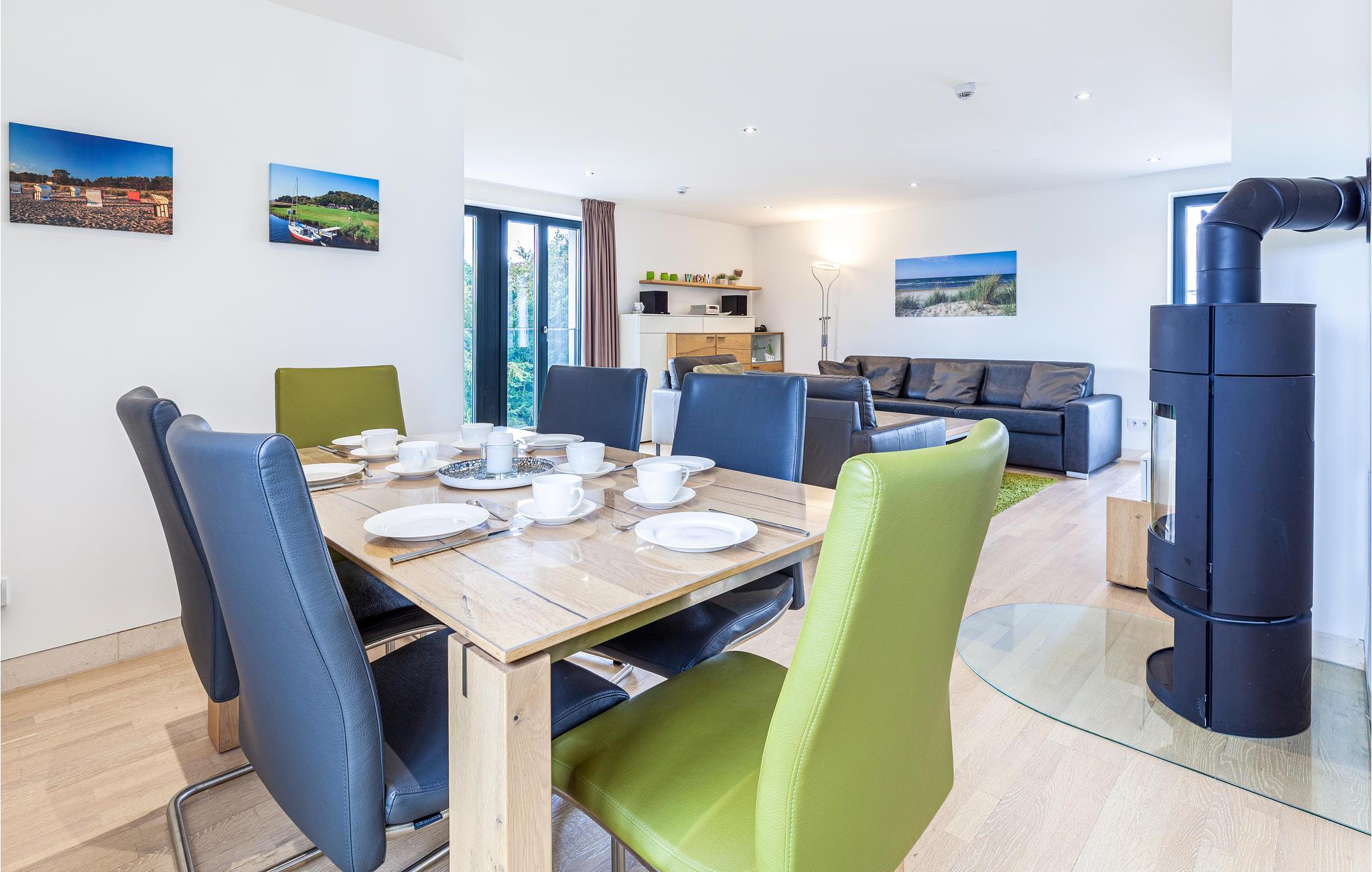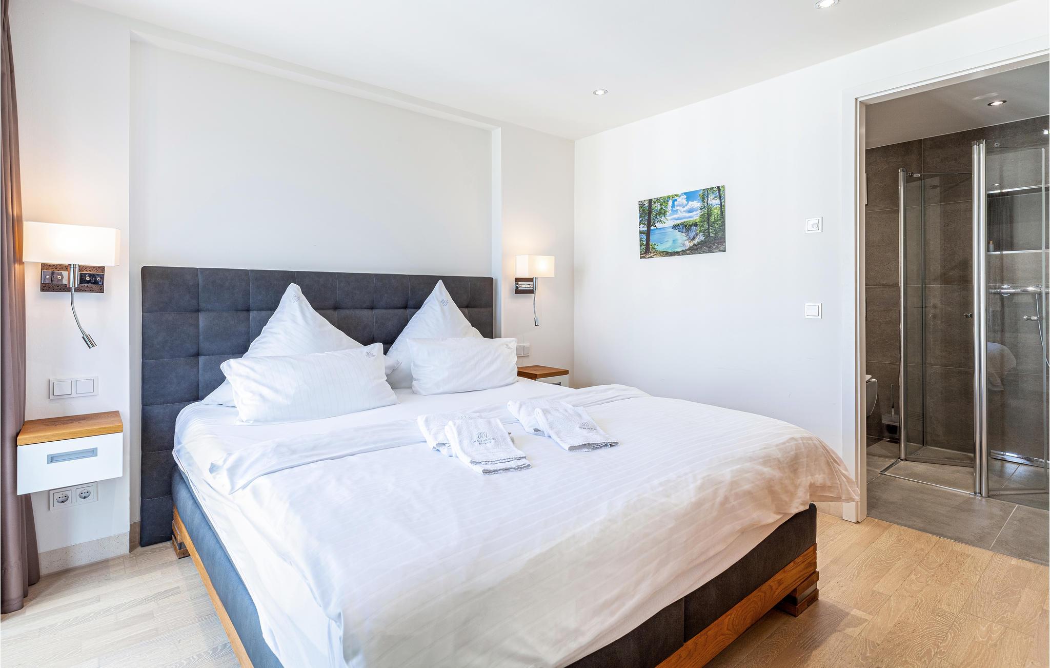 Die moderne Wohnung erwartet ihre Gäste nur wenige Schritte vom wunderschönen Strand entfernt im Seitenflügel des denkmalgeschützten Gebäudes. Machen Sie es sich in dem hochwertig ausgestatteten und lichtdurchfluteten Apartment gemütlich, dank Fenstern an drei Seiten können Sie fast einen Rundumblick über die Insel Rügen genießen. Nach Norden, Westen und Süden können Sie die Aussicht über die Wald- und Heideflächen bewundern. Machen Sie es sich an kühleren Abenden vor dem knisternden Kaminfeuer bequem.