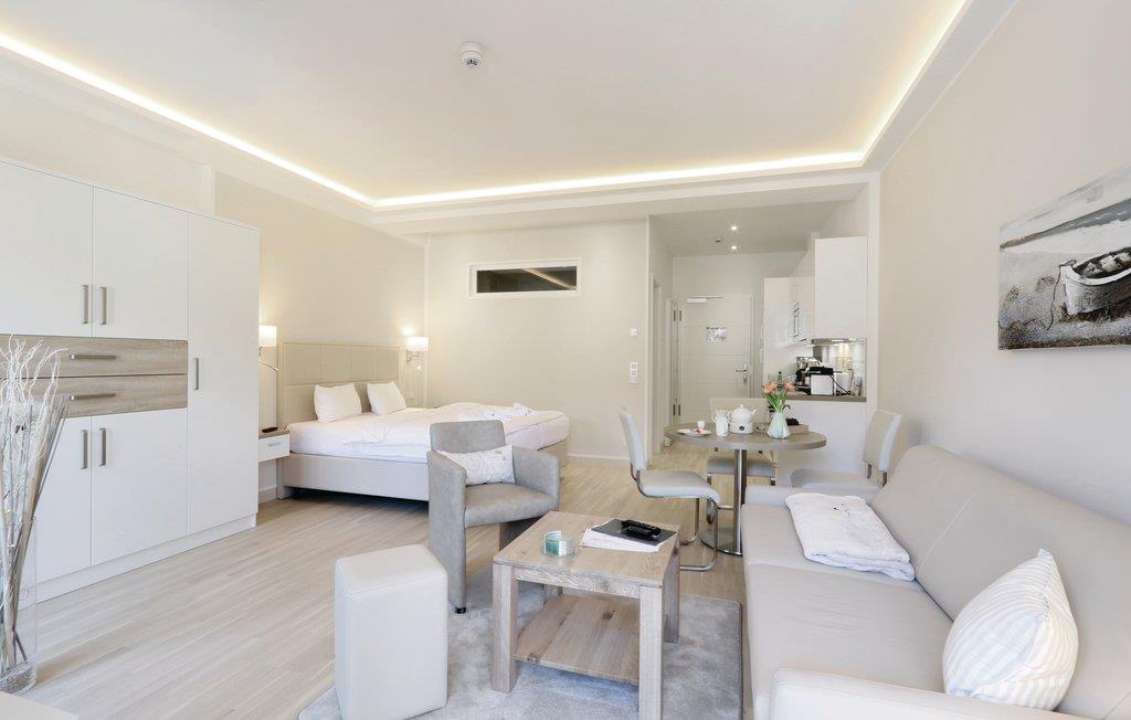 Das exklusive Studio-Apartment ist das perfekte Domizil für einen traumhaften Urlaub zu zweit auf der schönen Insel Rügen. Das Apartment ist raffiniert gestaltet, so dass sich auf kleinem Raum alles finden lässt, was Sie für einen entspannten Urlaub benötigen: die praktische Küchenzeile samt Esstisch, ein Schlafbereich mit hochwertigem Boxspringbett, ein gemütlicher, heller Wohnbereich und natürlich das Highlight des Studios: die eigene Terrasse in direkter Strandnähe.