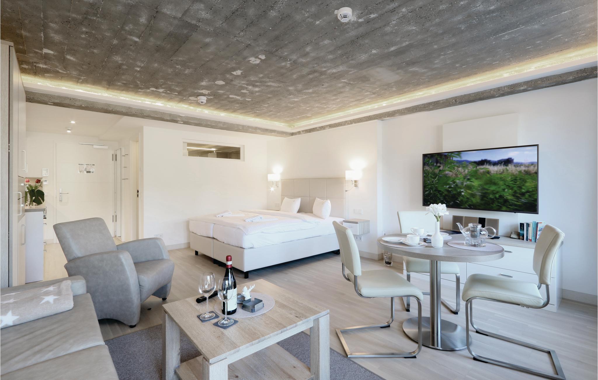 Das exklusive Studio-Apartment ist das perfekte Domizil für einen traumhaften Urlaub zu zweit auf der schönen Insel Rügen. Das Apartment ist raffiniert gestaltet, so dass sich auf kleinem Raum alles finden lässt, was Sie für einen entspannten Urlaub benötigen: die praktische Küchenzeile samt Esstisch, ein Schlafbereich mit hochwertigem Boxspringbett, ein gemütlicher, heller Wohnbereich und natürlich das Highlight des Studios: der Balkon mit Blick über die Bäume bis hin zur Ostsee. Hochwertige Ledermöbel im Essbereich sowie ein komforables Schlafsofa (1,60 m x 2,00 m) komplettieren die Ausstattung.