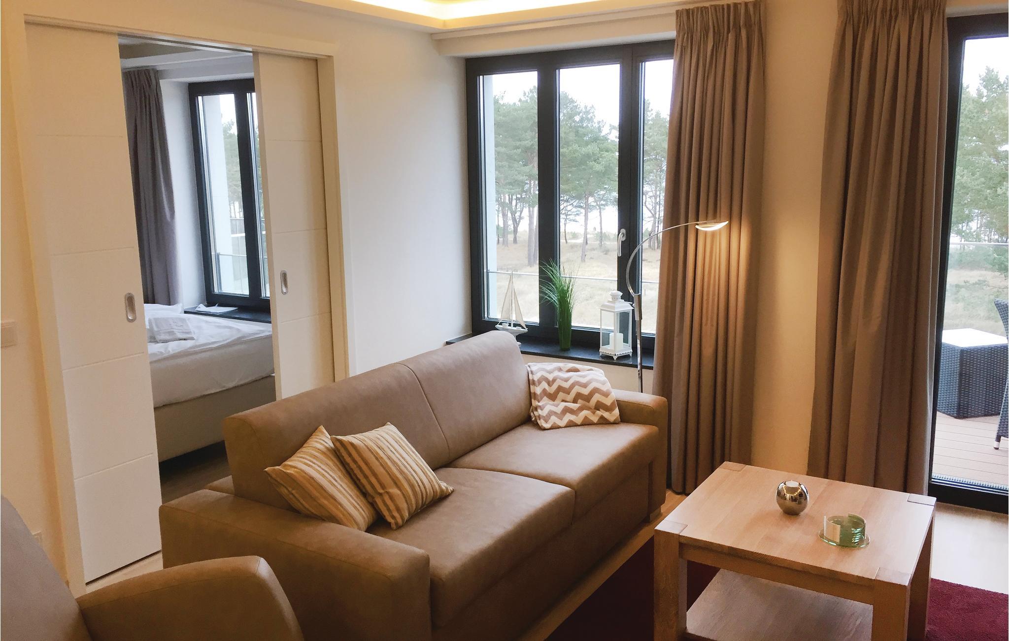 Die Ferienwohnung verspricht eine hochwertige Genuss- und Wohlfühlatmosphäre. Exklusive Möbel wurden perfekt aufeinander abgestimmt und stehen für ein Lebensgefühl, das Harmonie und Eleganz vereint. Jedes Möbelstück und Wohnaccessoire ist sorgfältig ausgewählt, nichts wurde dem Zufall überlassen. Insbesondere auf ein gesundes Raumklima und allergikerfreundliche Materialien wurde geachtet. Die top ausgestattete Küche lässt ebenfalls keine Wünsche offen und lädt zu Kochabenden im Kreise Ihrer Lieben ein. Kaffeeliebhaber freuen sich sicherlich über die bereitstehende Nespresso-Maschine (Kapseln bitte mitbringen). Auf über 40m² finden Sie hier alle Annehmlichkeiten. Der großzügige, offene Wohnbereich ist dank der großen Fensterfronten lichtdurchflutet, der Blick öffnet sich und kann über den kleinen Kiefernwald bis hin zum türkisen Wasser der Ostsee schweifen.