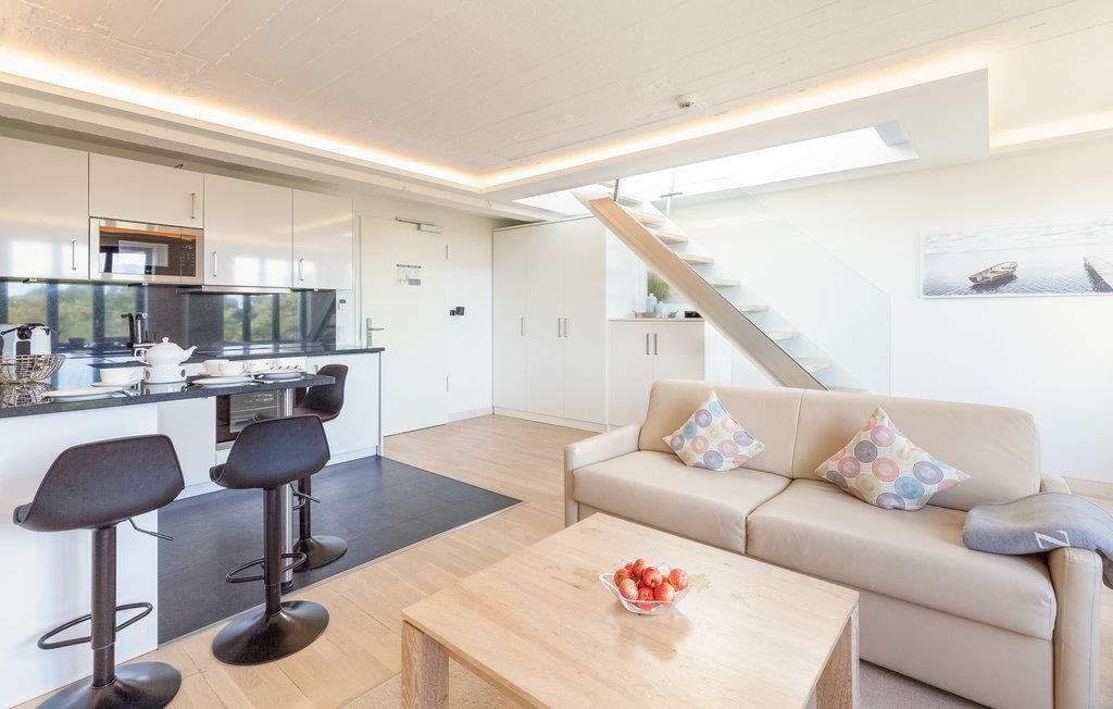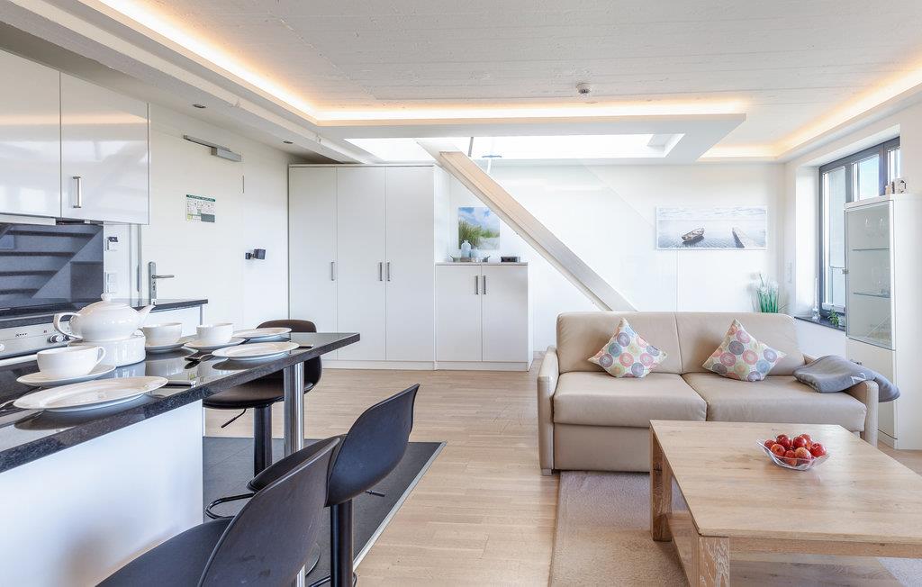Dank der großen Panoramafenster können Sie natürlich auch vom Wohn- und Schlafzimmer den Blick über die Ostsee genießen. Ein Dachfenster lässt noch zusätzlich Sonne und Licht in den Essbereich fließen. Das hochwertige Schlafsofa im Wohnbereich lässt sich mit wenigen Handgriffen in zwei Schlafgelegenheiten umwandeln. Getoppt wird die Panoramaaussicht aus dem Wohnbereich nur noch vom Rundum-Blick über die Insel und das Meer, der sich Ihnen bietet, wenn Sie die Treppe zu Ihrer privaten Dachterrasse hinaufsteigen.