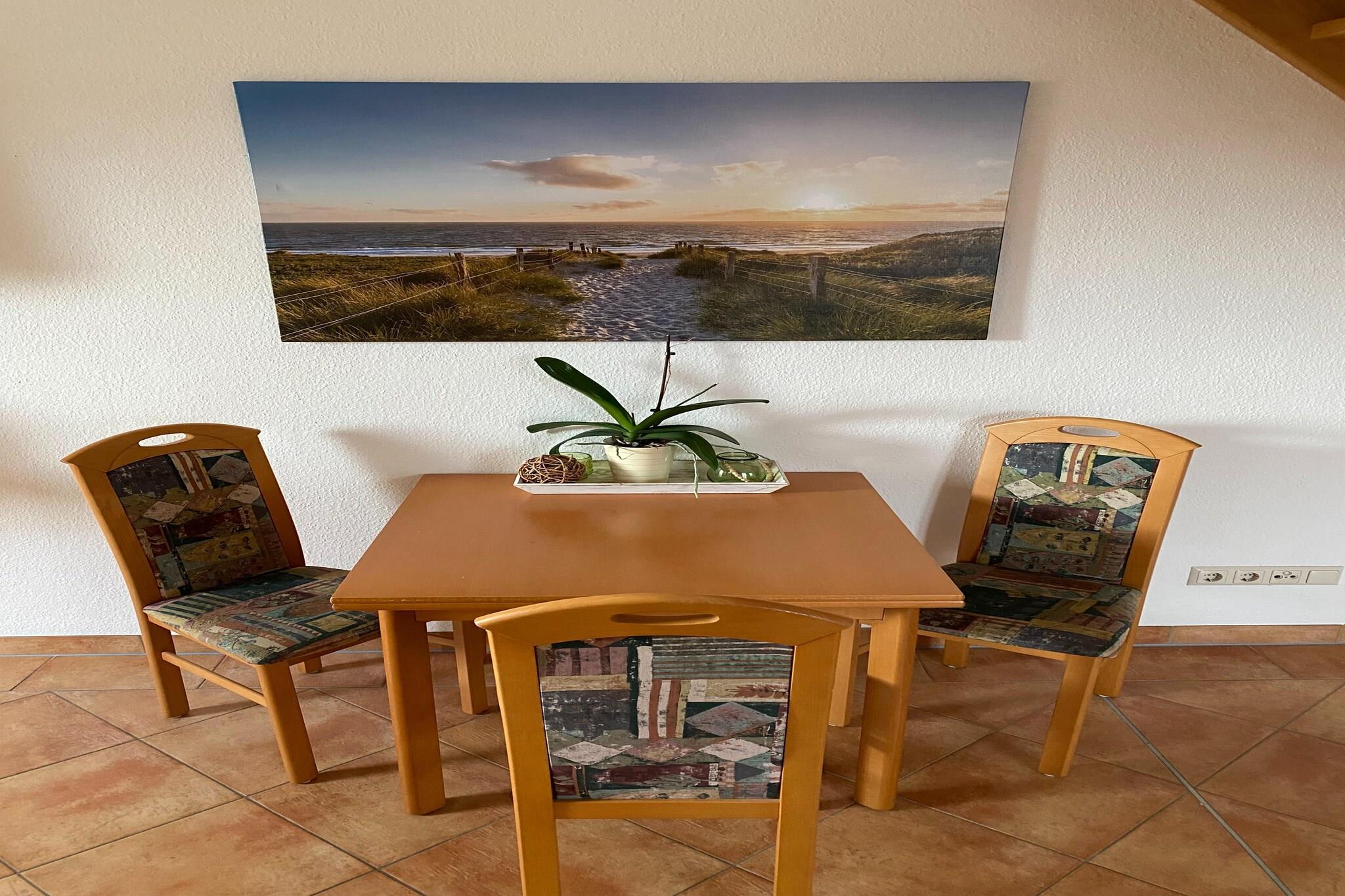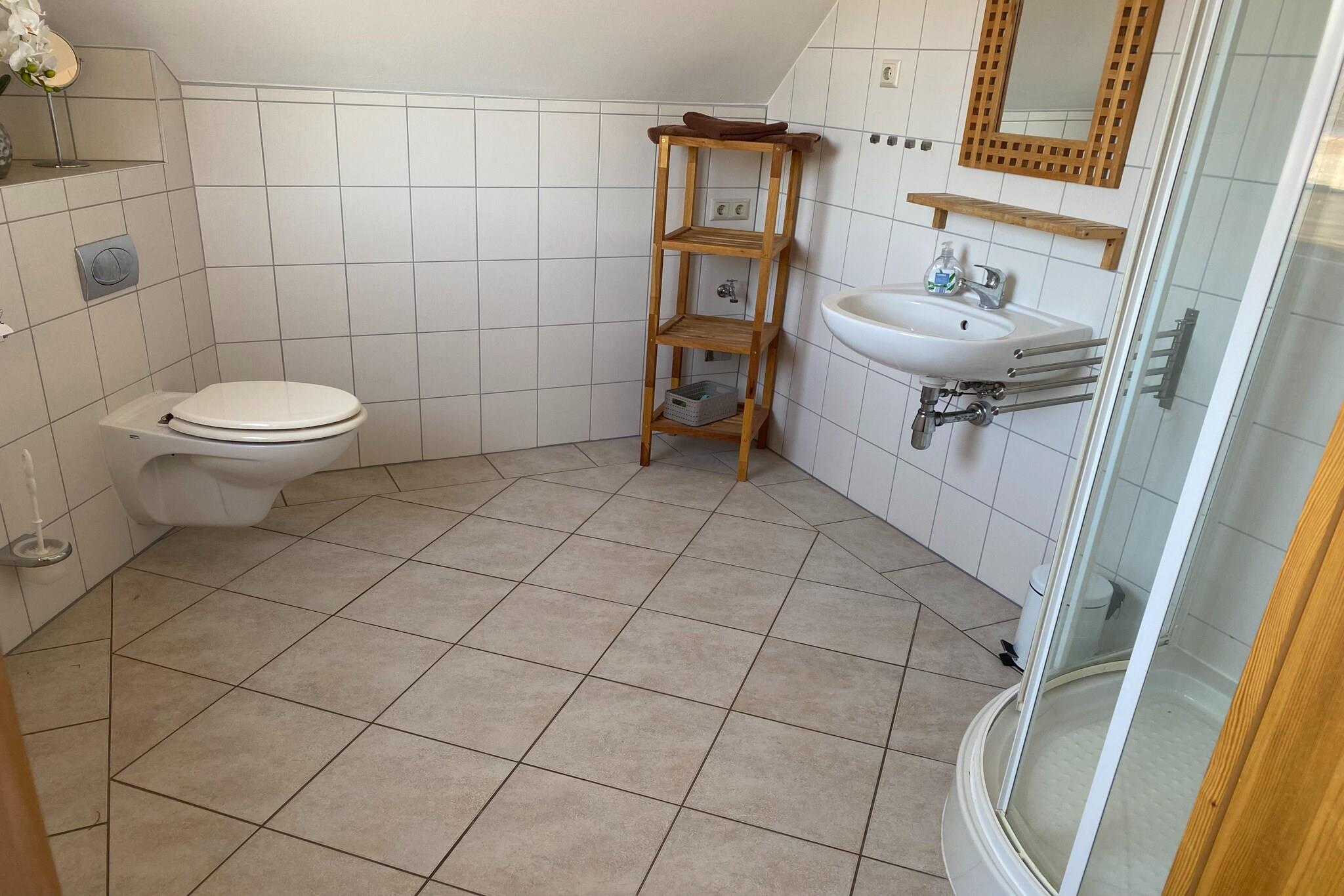 In der 1. Etage: (Wohnzimmer(Schlafcouch 1 Pers., TV, Esstisch, Sitzecke), offene Küche(Wasserkocher, Kochherd, Dunstabzugshaube, Kaffeemaschine, Backofen, Mikrowelle, Spülmaschine, Kühl-/Gefrierkombination), Badezimmer(Dusche, Waschbecken, Toilette), Kinderbett) Dachgeschoss: (Schlafzimmer(Doppelbett)) Eingang(über Außentreppe), Terrasse, Garten, Gartenmöbel, Grill, Parkplatz