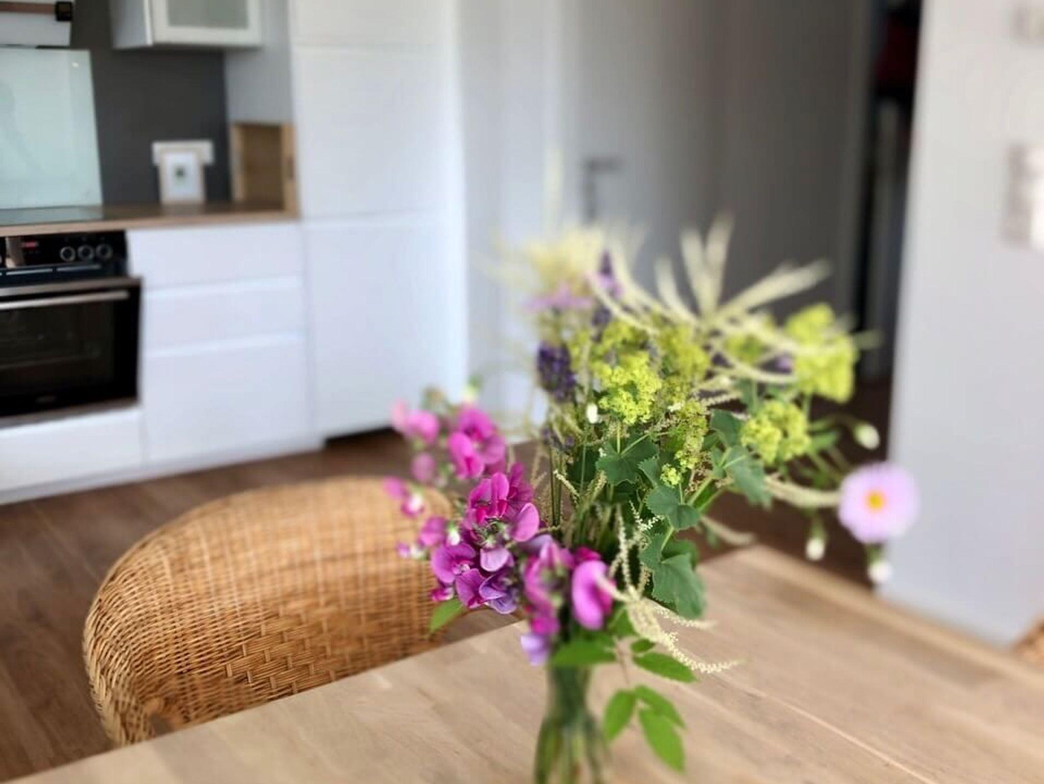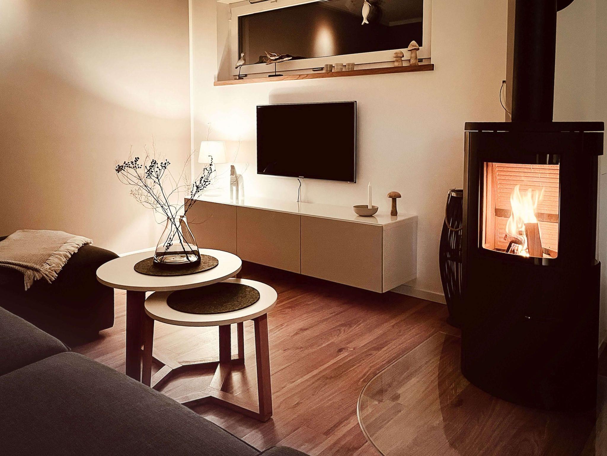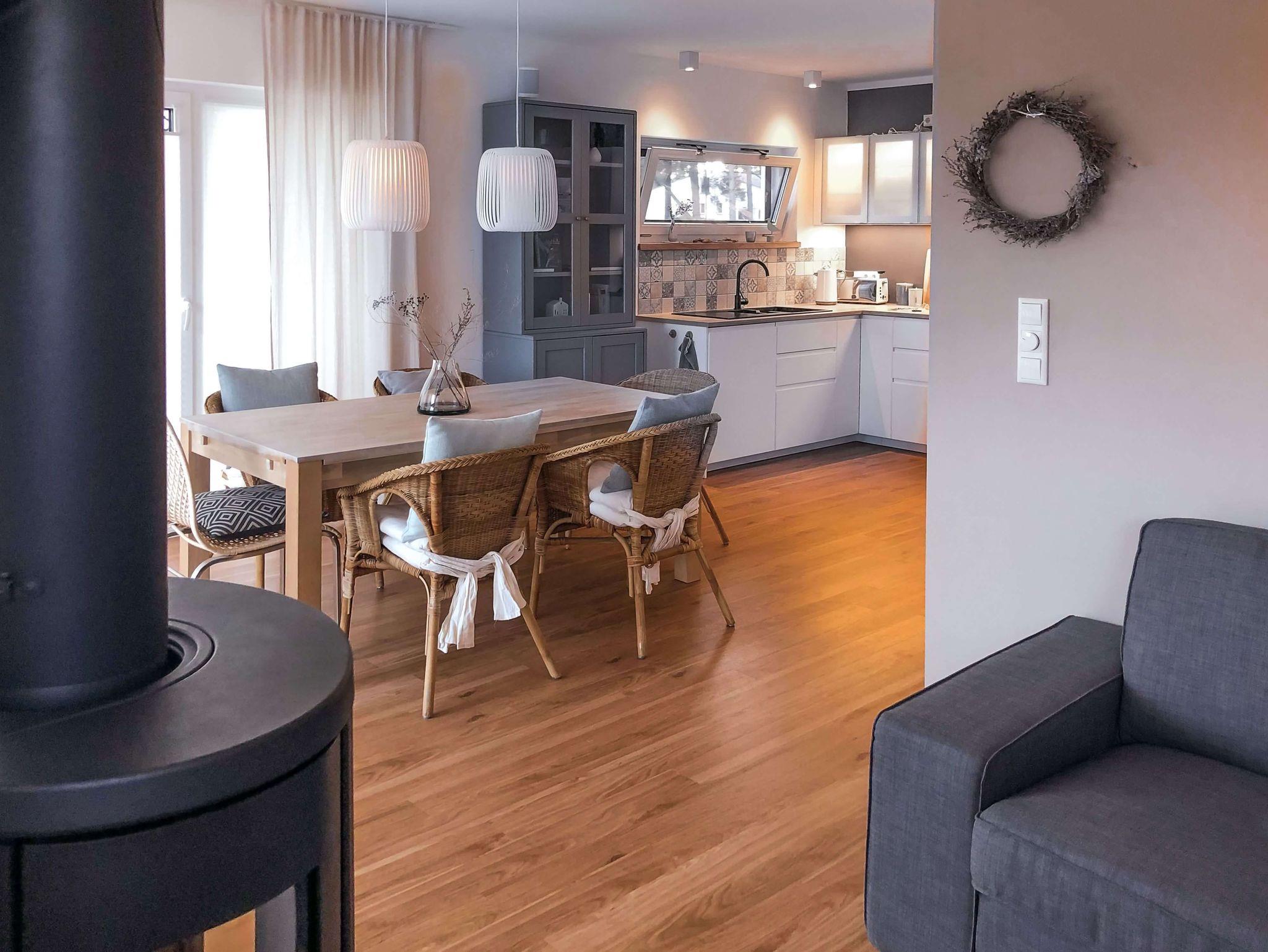 • Wohnen & Genießen: Der offene Wohn- und Essbereich im Erdgeschoss bildet das Herzstück des Hauses. Ein großer Esstisch lädt zu Spieleabenden ein, während die voll ausgestattete Design-Küche (inkl. Geschirrspüler, Gefrierfach, French Press & Espressokocher) keine Wünsche offen lässt. Für das perfekte Ambiente sorgen der knisternde Kaminofen und das hochwertige SONOS-WLAN-Soundsystem.