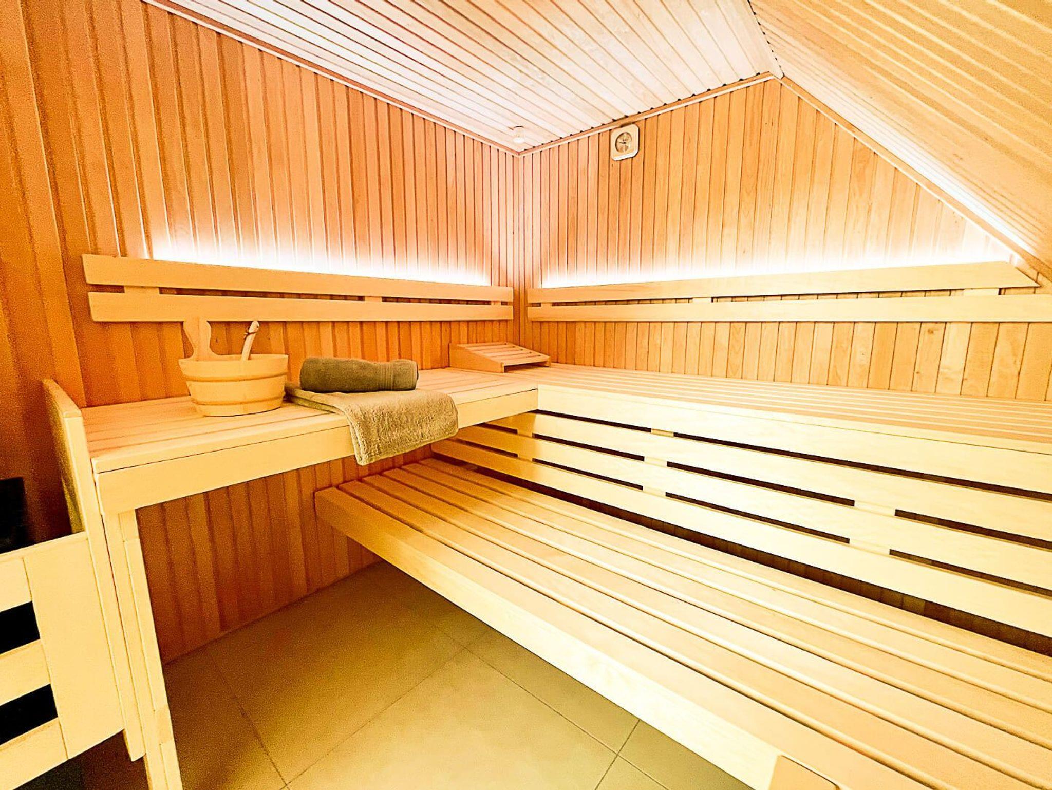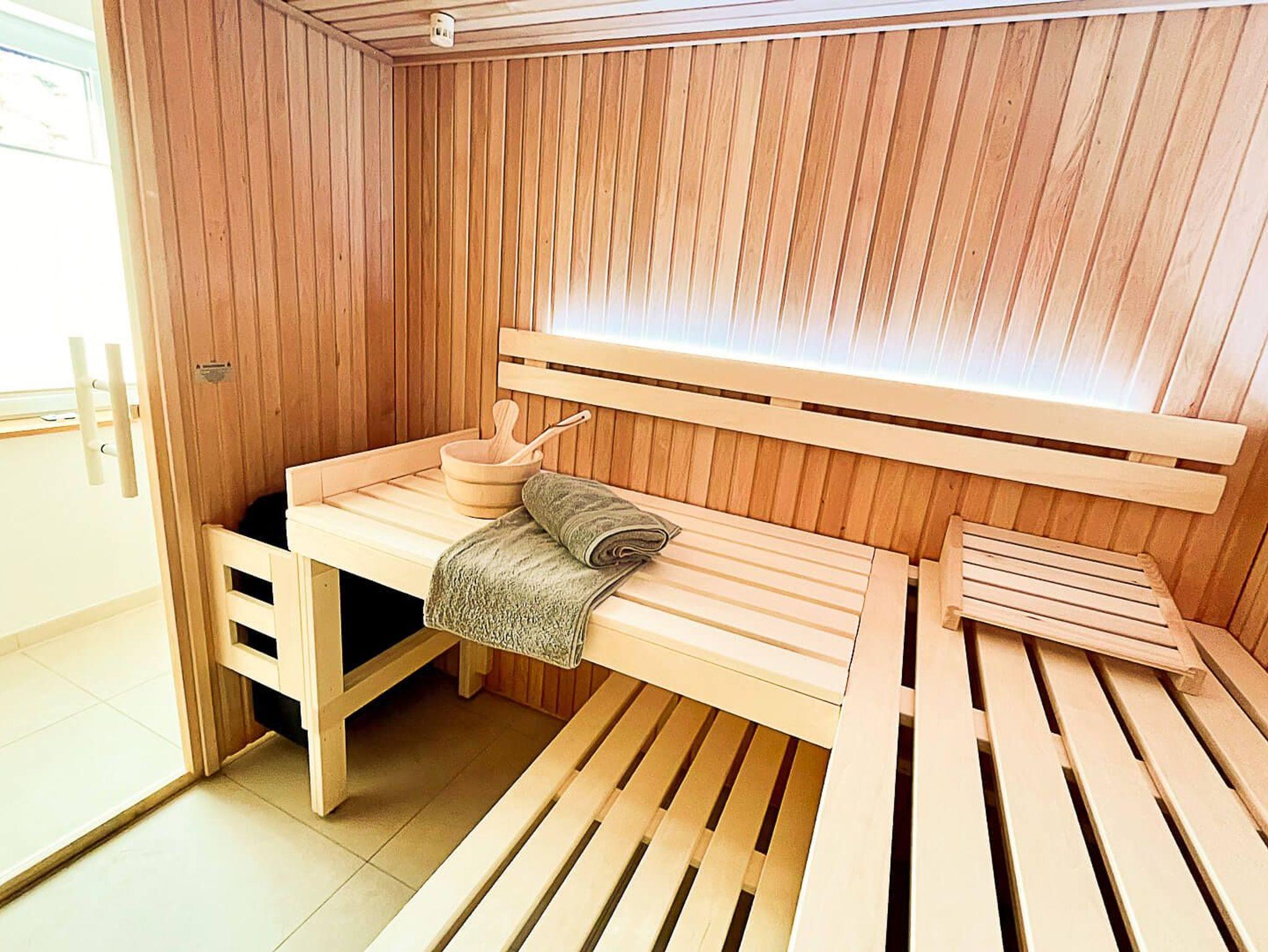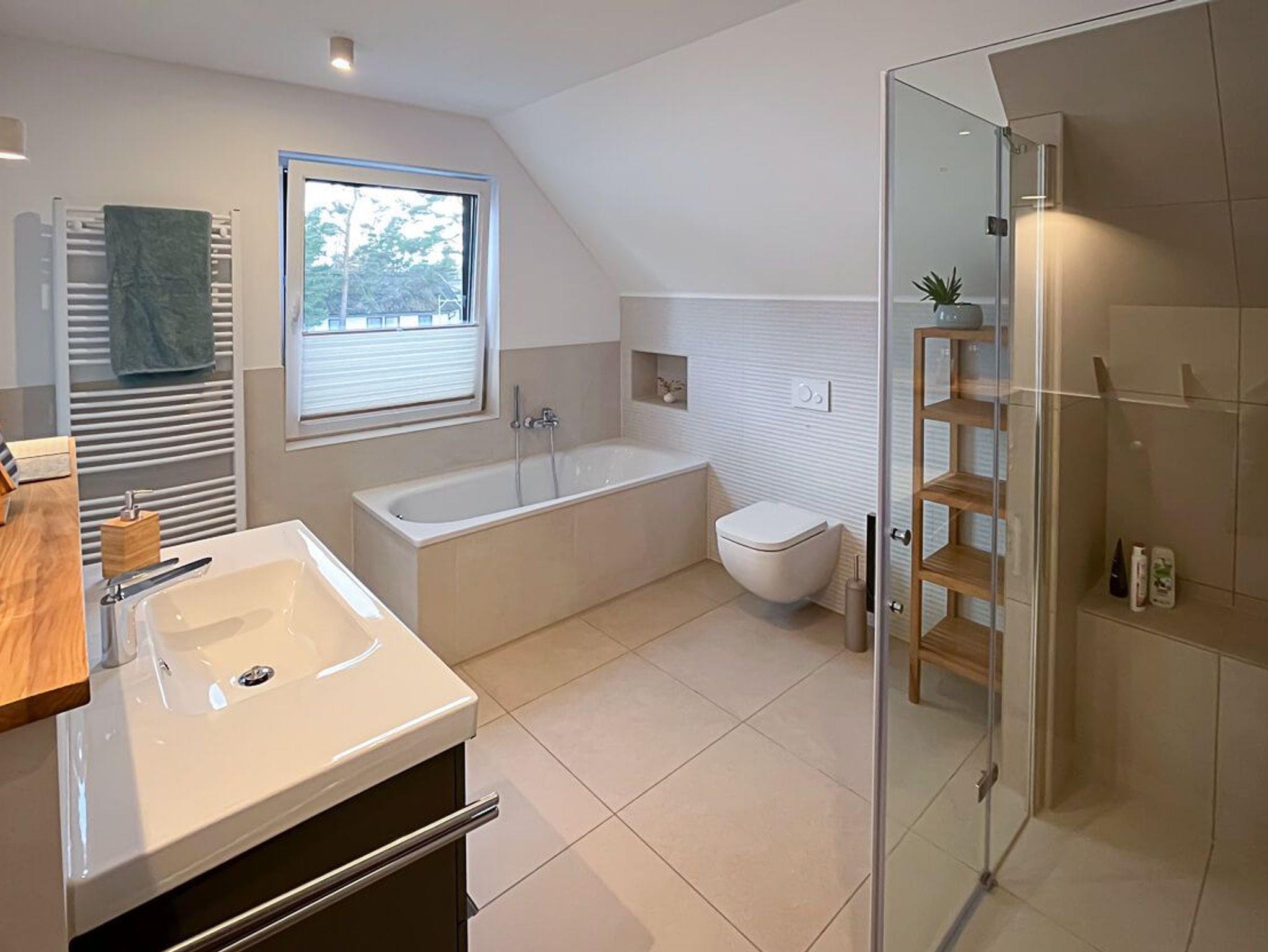 • Wellness-Oase: Das geräumige Bad im Obergeschoss ist Ihre private Spa-Zone. Neben einer bodengleichen Dusche und einer Badewanne erwartet Sie eine eigene Sauna für bis zu 4 Personen. Das gesamte Haus ist für Ihr Wohlbefinden mit einer Fußbodenheizung ausgestattet. Ein Gäste-WC befindet sich im Erdgeschoss.