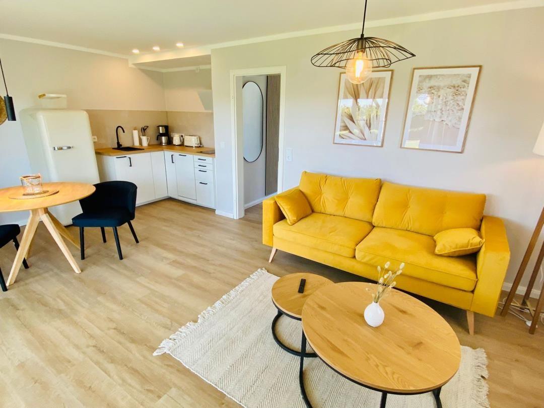 Die geschmackvoll und stylisch eingerichtete Wohnung ist sehr komfortabel und ist für 2 Personen (+ Kleinkind) geeignet. Sie verfügt über ein Wohnzimmer mit integrierter Küche, ein Schlafzimmer, ein modernes Bad mit großer Dusche und Fenster, Flur und Terrasse. Die Küche ist voll ausgestattet und bietet alles zur Selbstverpflegung. Ein kostenloser WLAN-Zugang steht für unsere Gäste zur Verfügung.
