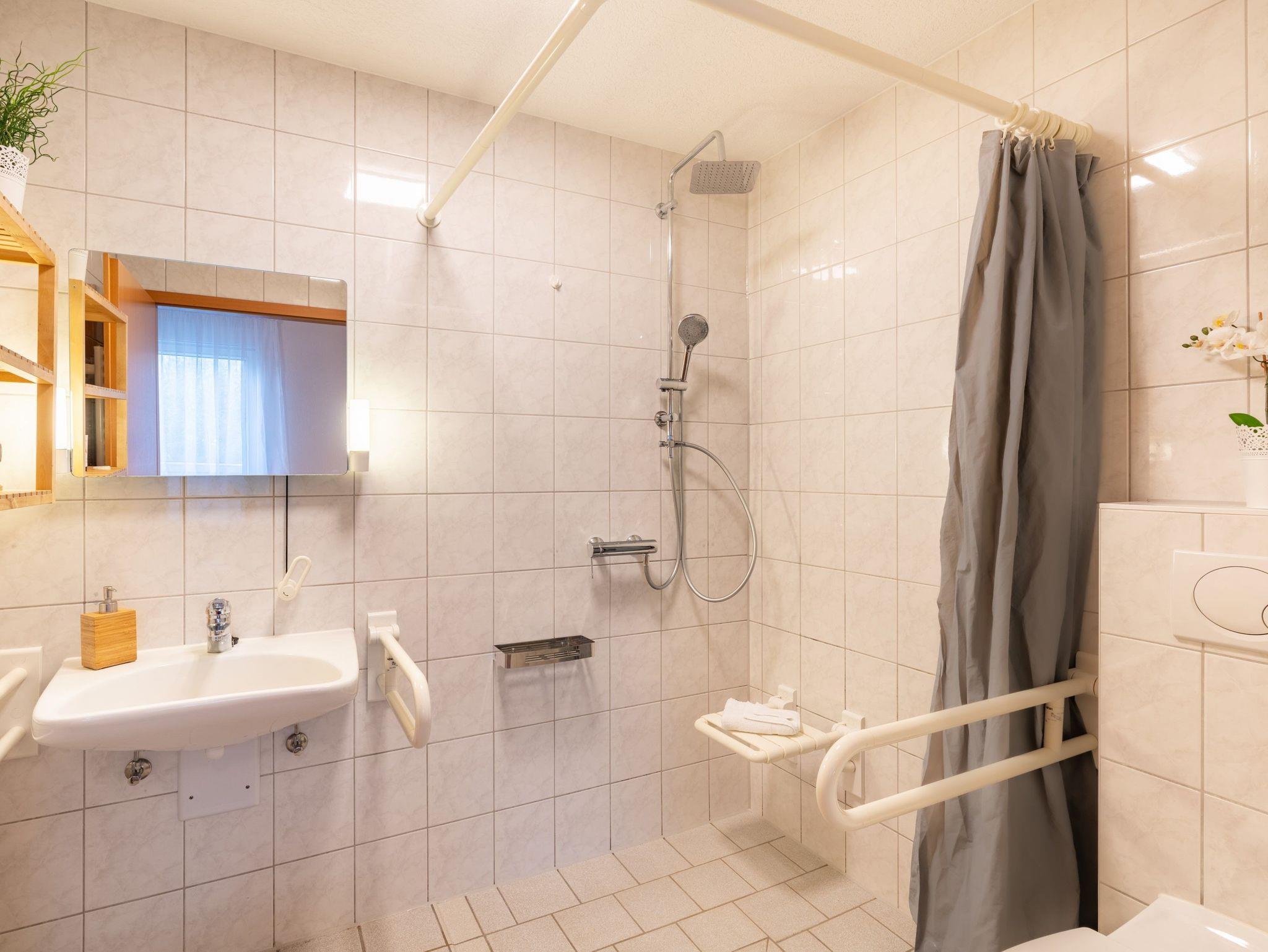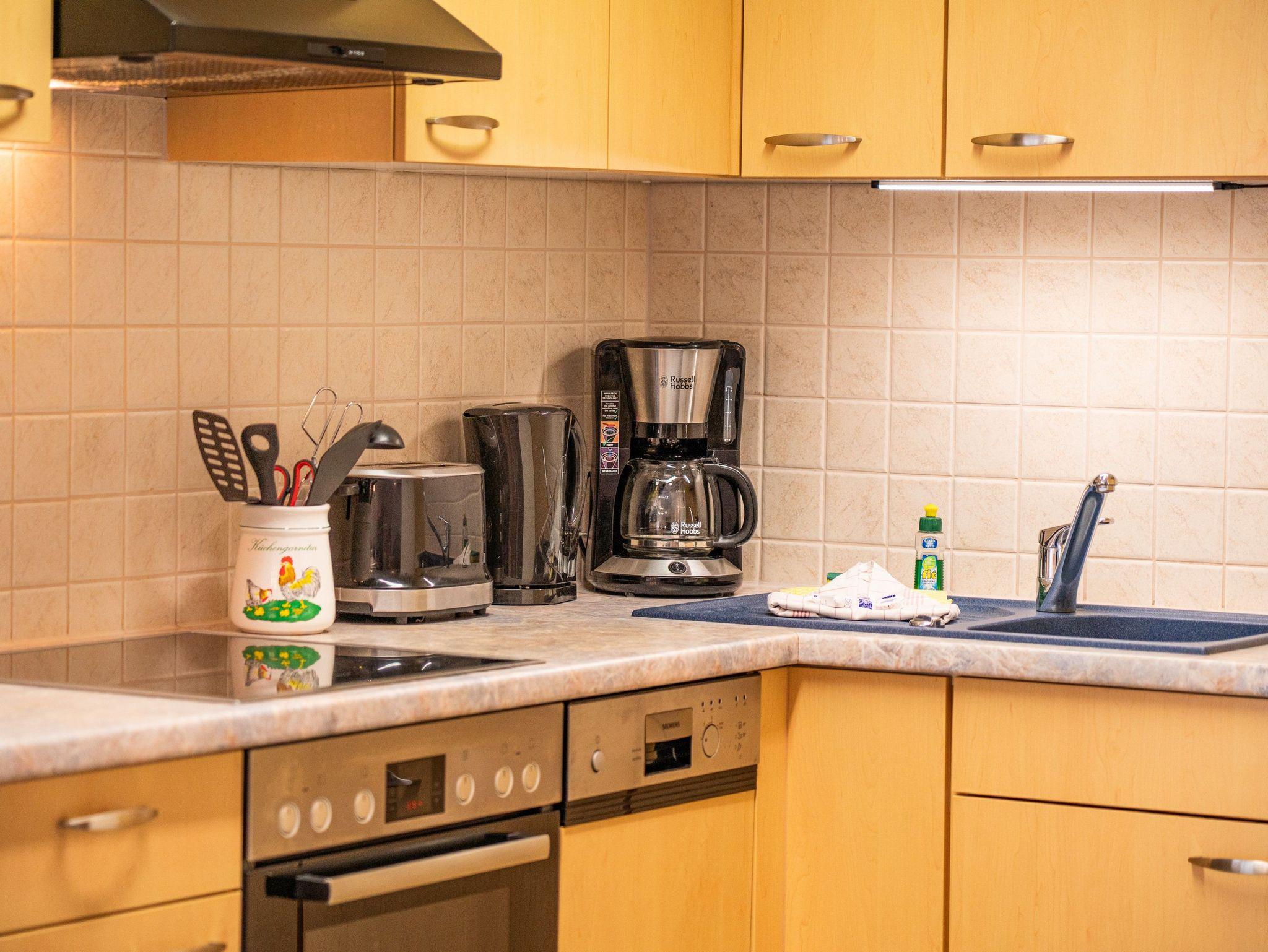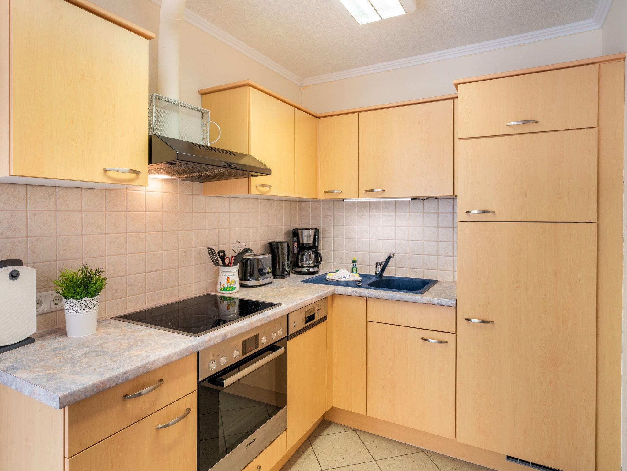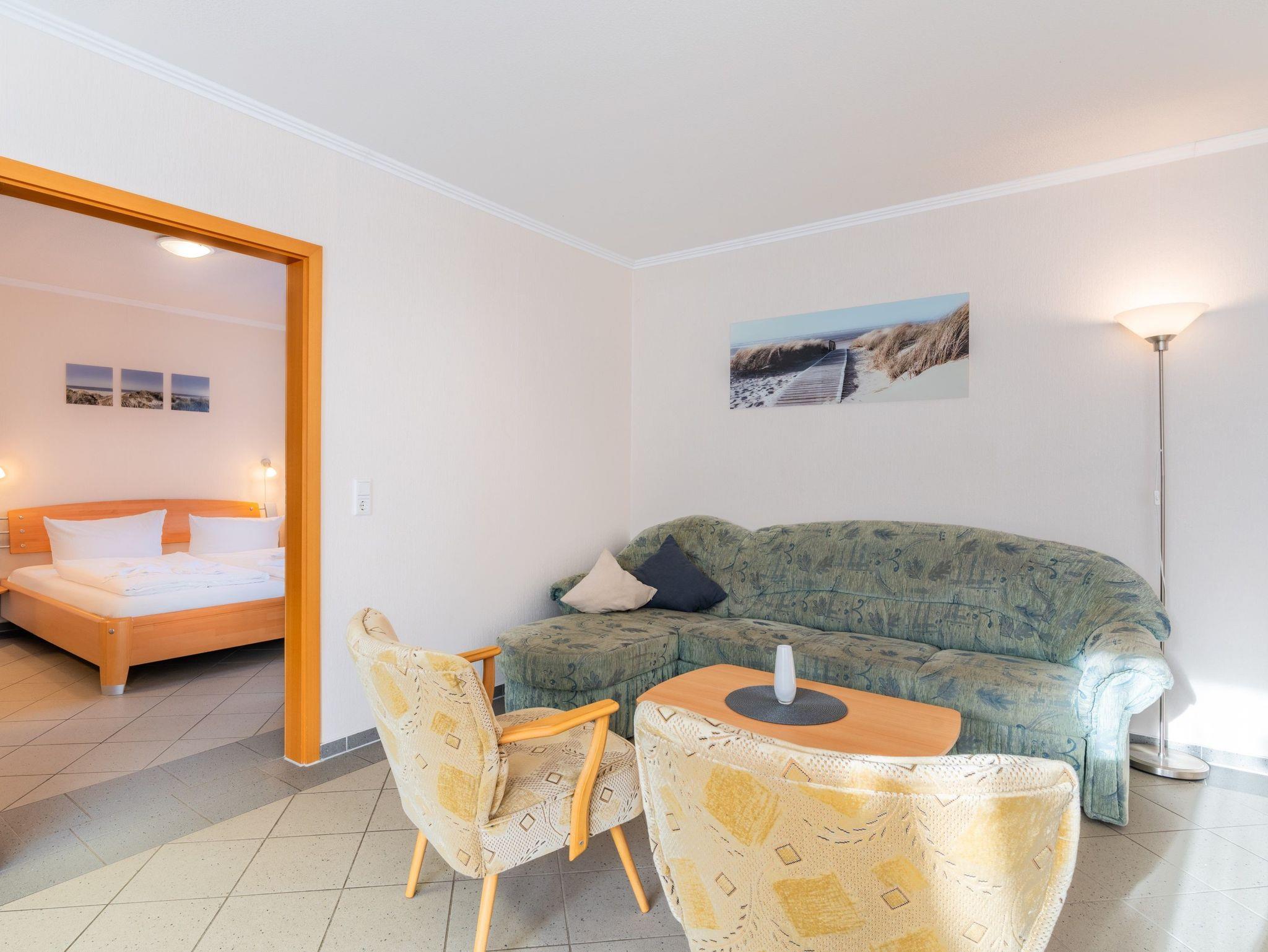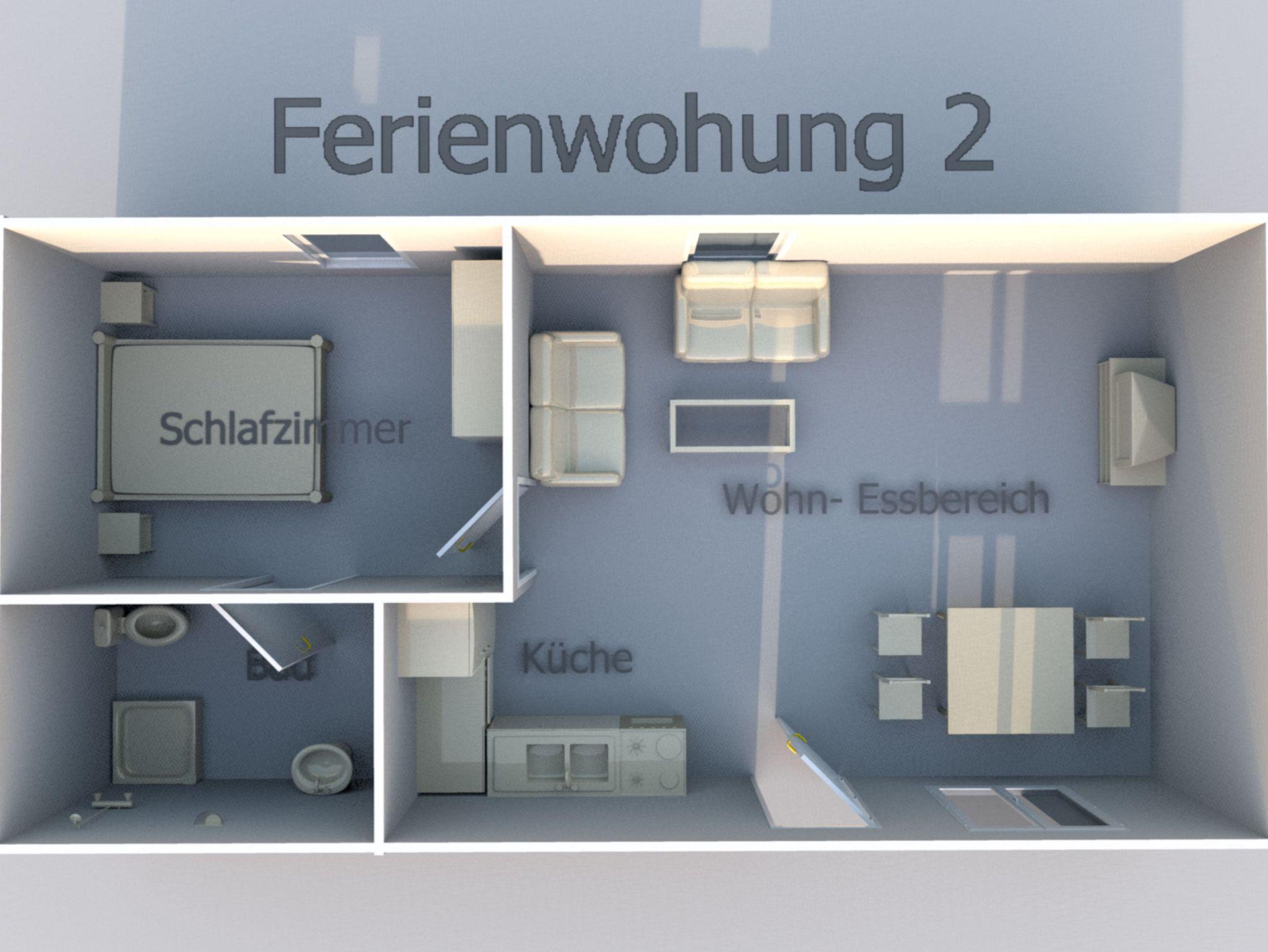 Die circa 45 m² große Ferienwohnung ist ideal für zwei Erwachsene und Kind. Sie verfügt über ein Schlafzimmer mit einem 180 cm breiten Doppelbett und einem großen Kleiderschrank mit Spiegeltür. Der Wohnraum unterteilt sich in einen gemütlichen Sitz- und Essbereich mit Schlafcouch sowie die offene Küche, die mit Herd, Backofen, Kaffeemaschine, Wasserkocher , Kühlschrank und Geschirrspüler ausgestattet ist. Das Badezimmer bietet Ihnen eine geräumige, bodengleiche Dusche mit einem klappbarem Duschsitz. Die Wohnung ist barrierefrei und rollstuhlgerecht. Eine Fußbodenheizung sorgt an kühleren Tagen für wohlige Wärme.