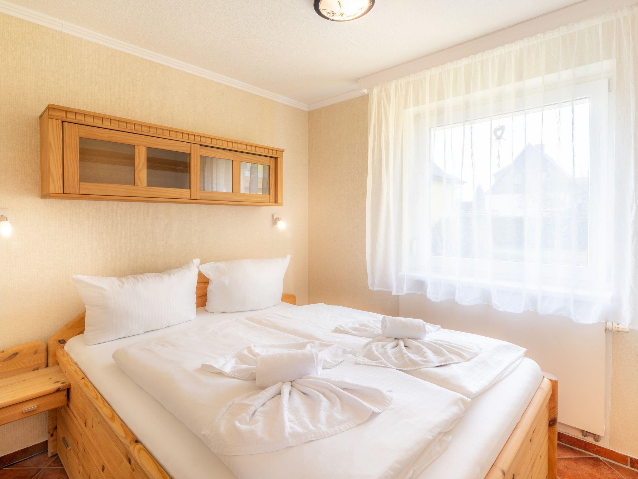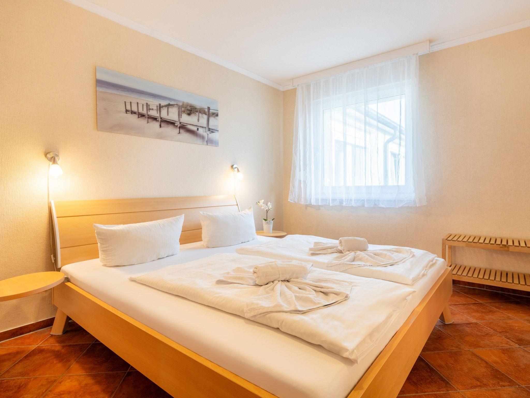 Die circa 50 m² große Ferienwohnung ist ideal für zwei Erwachsene und zwei Kinder. Sie verfügt über ein Schlafzimmer mit einem 180 cm breiten Doppelbett und einem großen Kleiderschrank mit Spiegeltür. Das zweite Schlafzimmer verfügt über ein 140 cm breites französisches Bett.