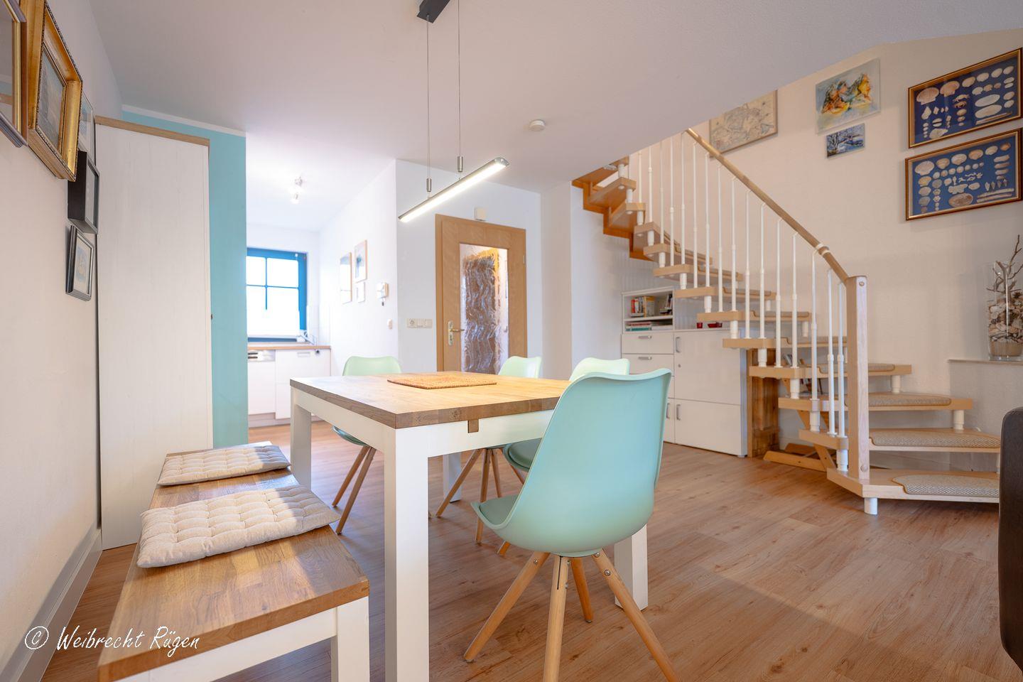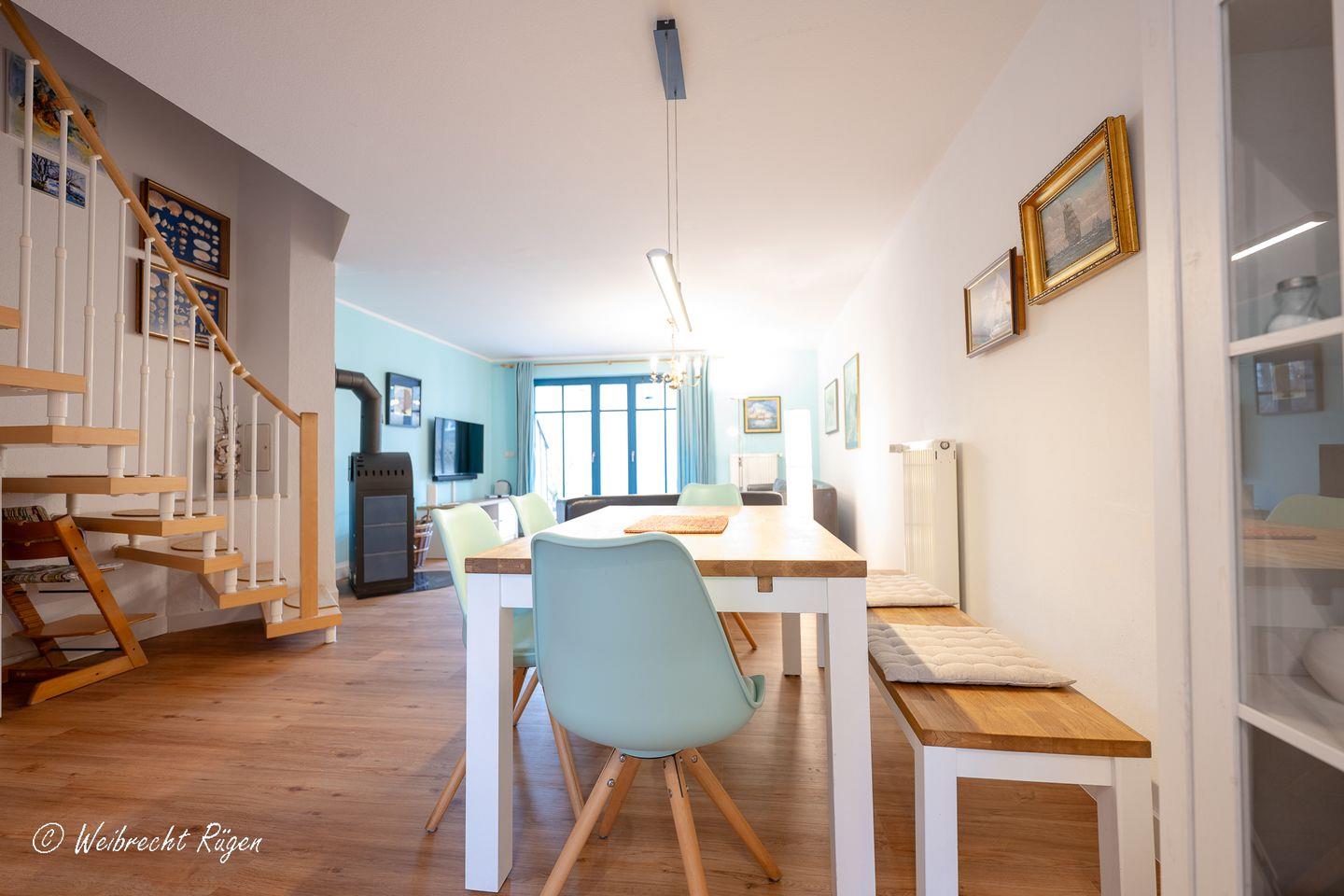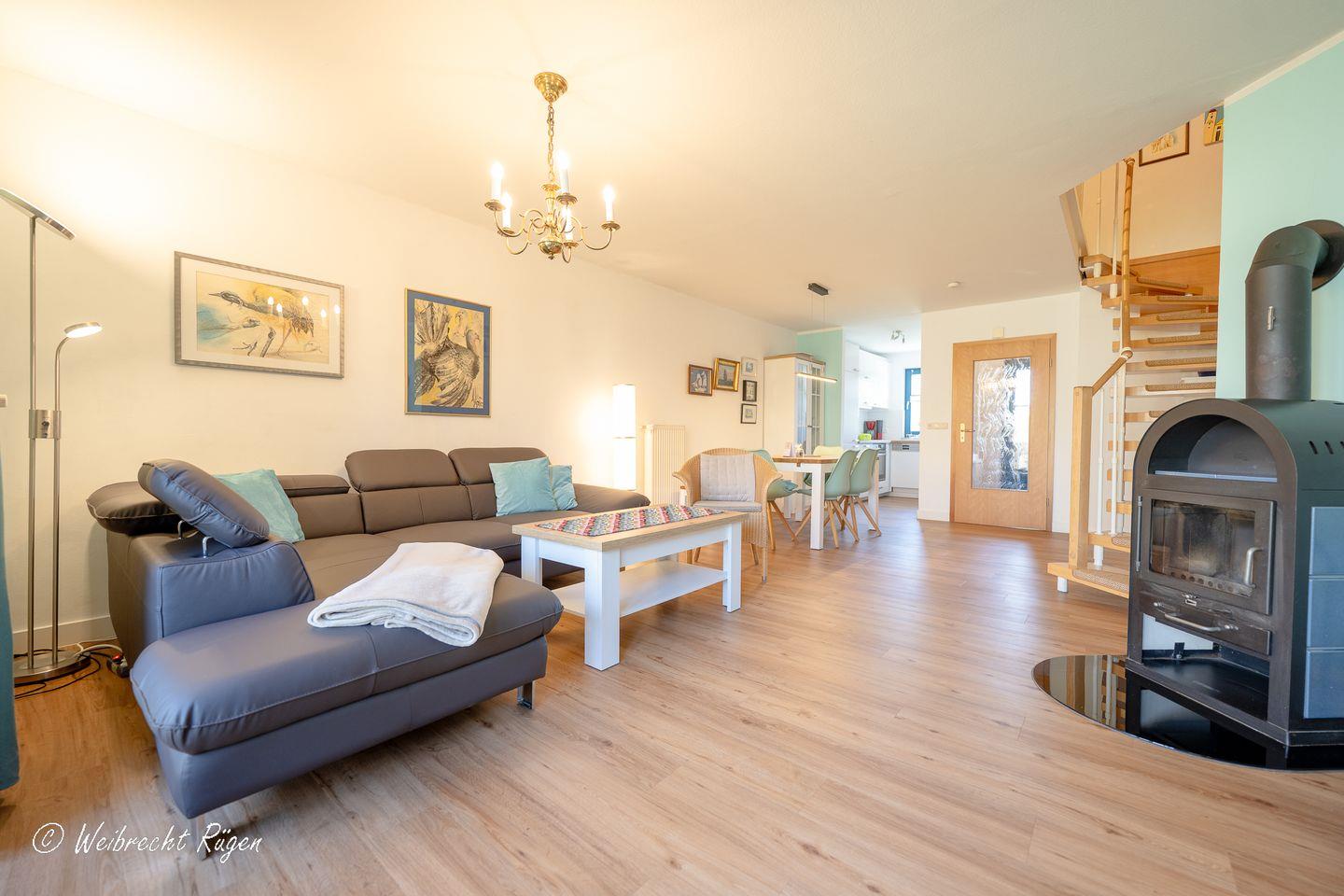 Auf drei Etagen bietet das Haus Platz für bis zu sechs Gäste. Im offenen Wohnbereich im Erdgeschoss lädt die gemütliche Sofaecke mit Kaminofen und Flachbild-TV zu entspannten Stunden ein, während die angrenzende, voll ausgestattete Küche und der Essbereich das Herz des Familienlebens bilden. Von hier gelangen Sie auf die sonnige Westterrasse, perfekt für den Nachmittagskaffee oder ein Glas Wein am Abend.