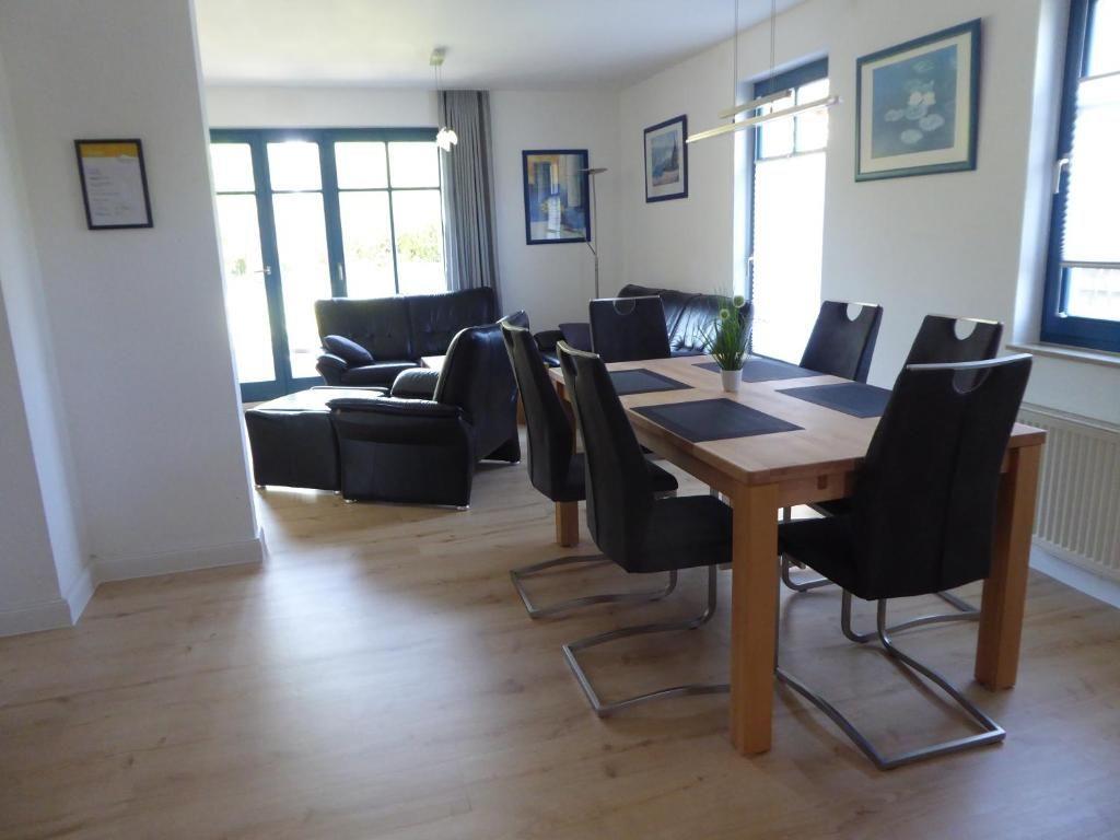 Das Haus bietet auf drei Etagen Platz für bis zu sechs Gäste. Im Erdgeschoss lädt der offene Wohnbereich mit gemütlicher Sofaecke, Kaminofen und Flachbild-TV zum Entspannen ein. Die angrenzende voll ausgestattete Küche und der helle Essbereich machen das gemeinsame Kochen und Essen zum Vergnügen. Von hier aus gelangen Sie auf die sonnige Terrasse – ein wunderbarer Ort, um die Seele baumeln zu lassen oder den Tag ausklingen zu lassen.