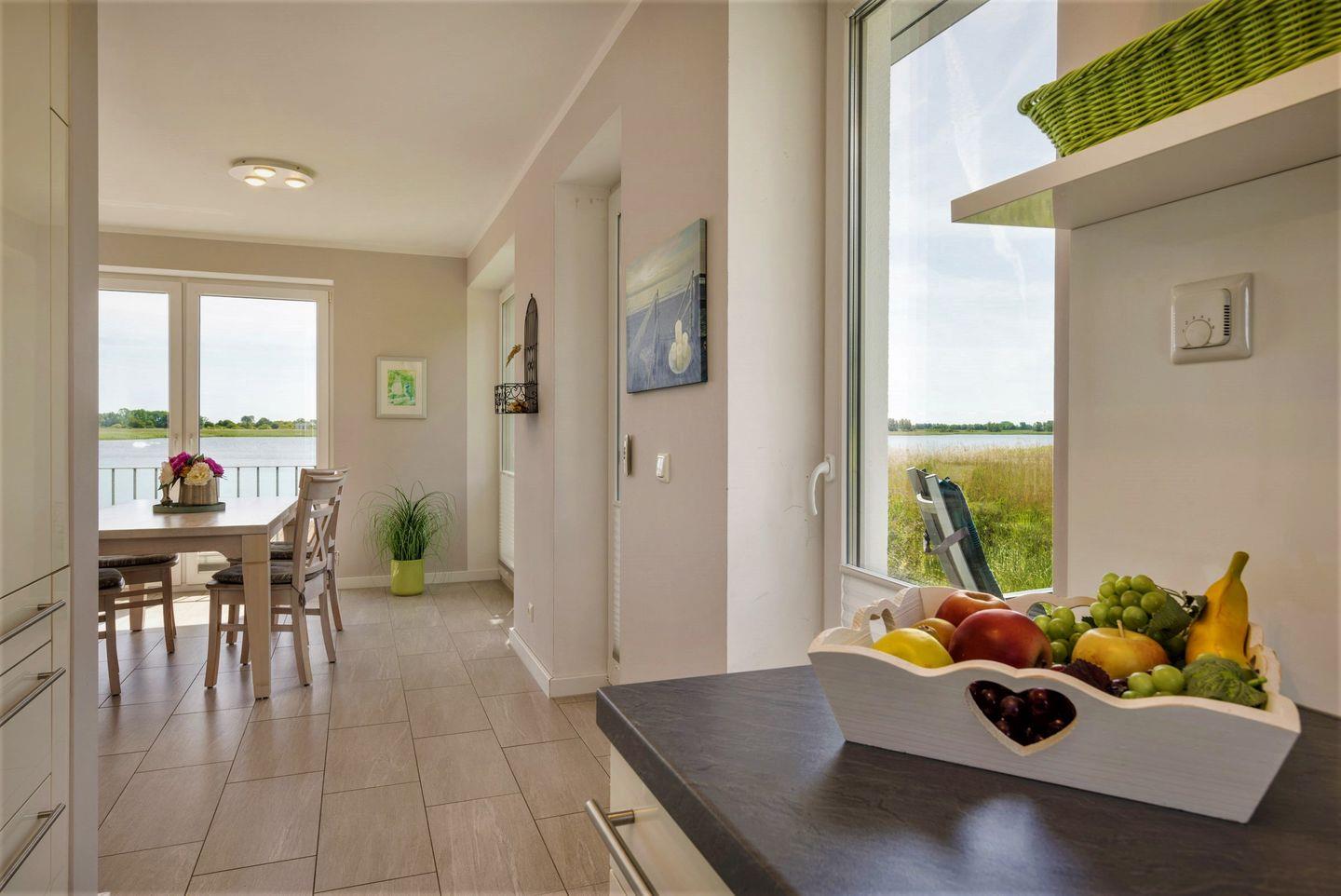 Mit Blick auf den Bodden und Ihren Bootsanlegeplatz verbringen Sie herrliche Momente und ruhige Stunden in wohliger Atmosphäre des Wohn- und Essbereichs. In der offenen Küche, die mit vielen Küchenutensilien bestückt ist, lassen sich zauberhafte Mahlzeiten zubereiten.