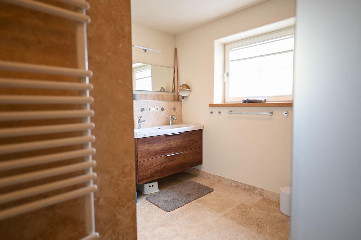Unterstützt wird dieses gesunde Raumklima durch eine energieeffiziente Flächenheizung, die von einer leisen Luft-Wärmepumpe betrieben wird, sowie einen wasserführenden Kamin, der wohlige Wärme spendet. Auch die Materialwahl folgt einem klaren Konzept: Auf Fliesen wurde bewusst verzichtet – stattdessen wurde edler Travertinstein aufwendig verarbeitet, was dem Haus eine natürliche, warme Atmosphäre verleiht.