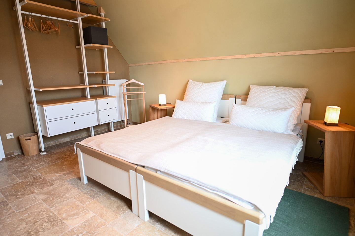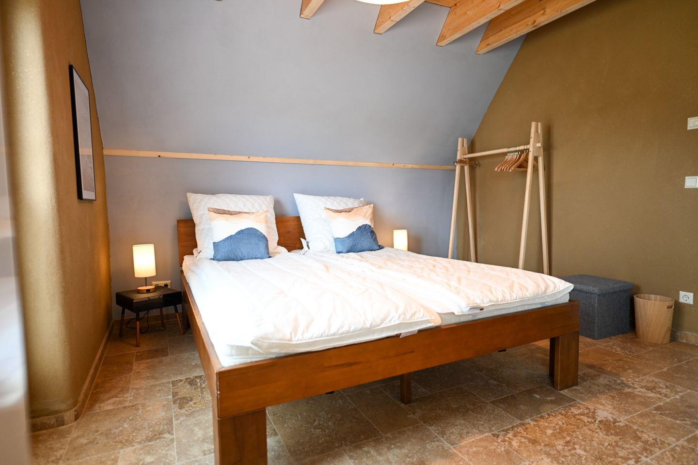 Im Obergeschoss befinden sich drei weitere Schlafzimmer – zwei mit Doppelbett und eines mit zusammenstellbaren Einzelbetten – sowie ein komfortables Vollbad. Ein besonderes Highlight ist der ausgebaute Dachgiebel mit herrlichem Ausblick: ideal als Rückzugsort zum Lesen, Arbeiten oder Spielen.