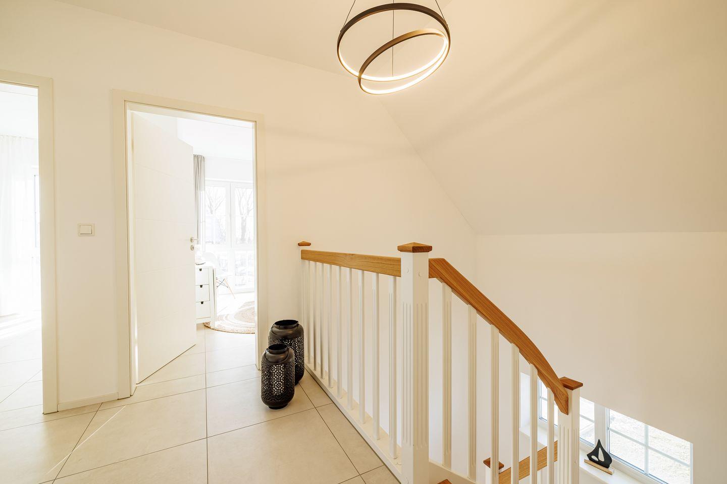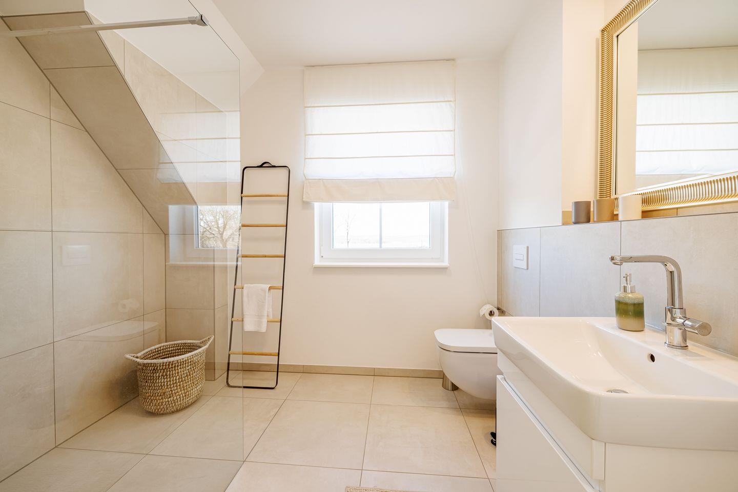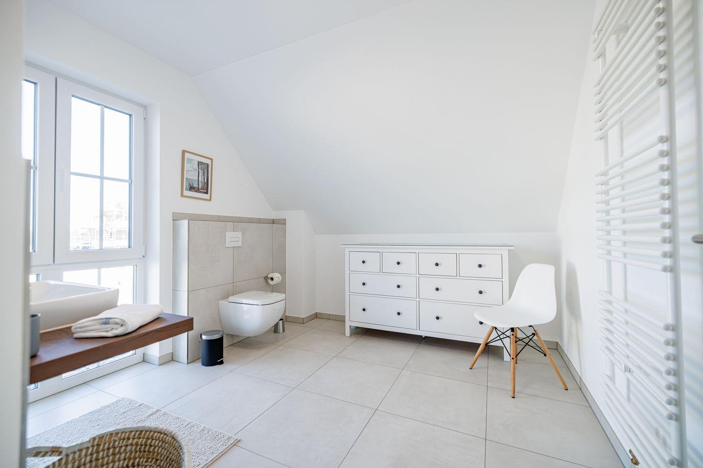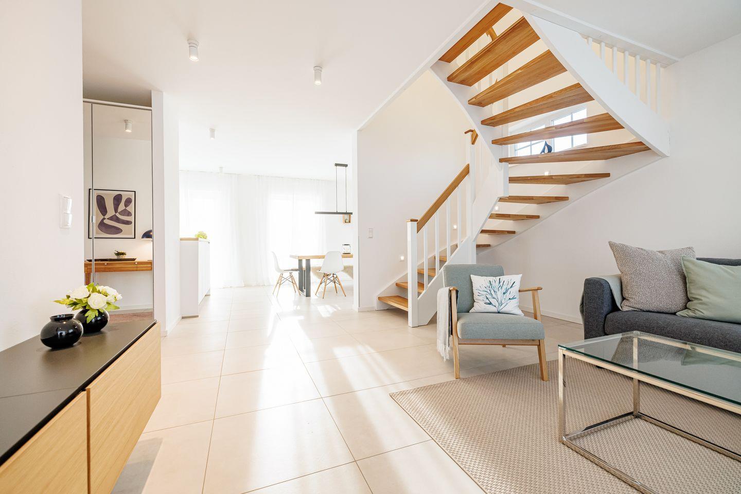 Das Erdgeschoss ist offen und lichtdurchflutet gestaltet. Bodentiefe Fenster holen die Sonne ins Haus und öffnen den Blick in den liebevoll angelegten Garten. Der Wohnbereich lädt mit einer gemütlichen Sofaecke, viel Raum und unmittelbarer Nähe zum Koch- und Essbereich zu gemeinsamen Urlaubsmomenten ein. Die hochwertige Küche ist bestens ausgestattet – perfekt für entspannte Kochabende. Ein Gäste-WC und ein Hauswirtschaftsraum mit Waschmaschine ergänzen diese Ebene.