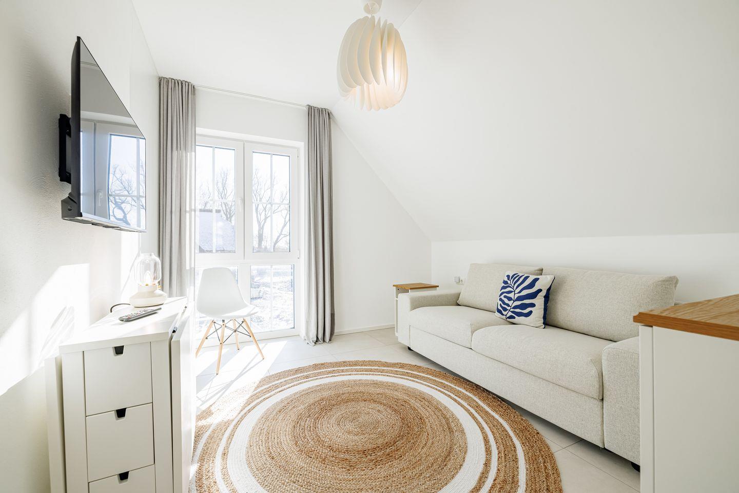 Zusätzlich steht ein weiterer Raum mit Sofa zur Verfügung – ideal als kleiner Rückzugsort, Fernsehzimmer oder ruhiger Arbeitsplatz für alle, die unterwegs zwischendurch einmal konzentriert arbeiten möchten. Ein zweites Duschbad bietet weiteren Komfort.