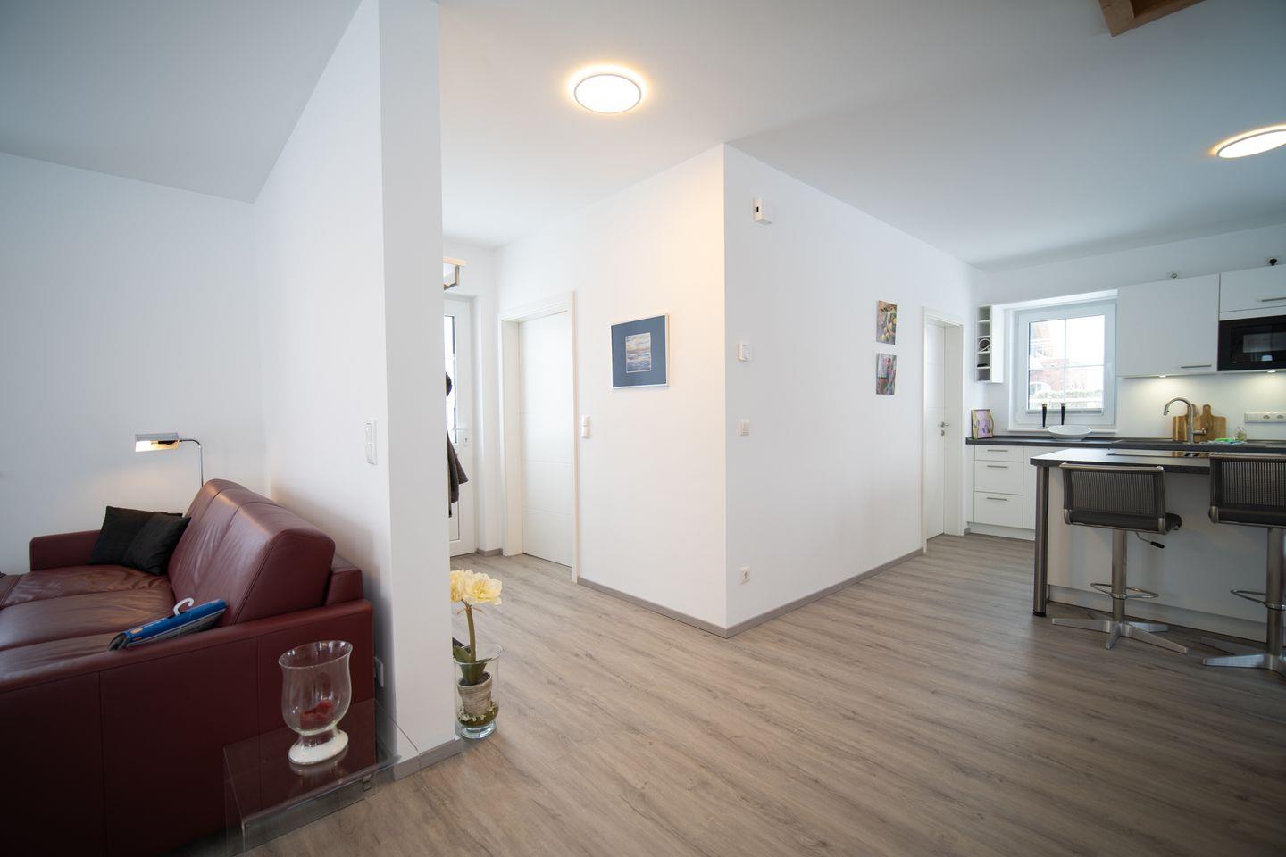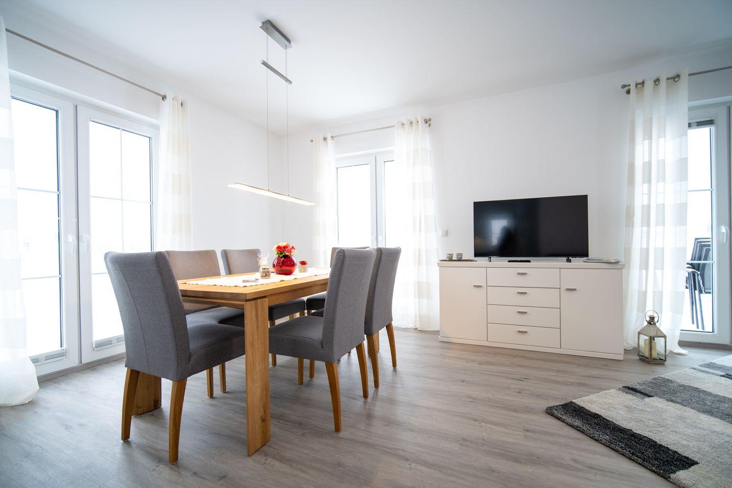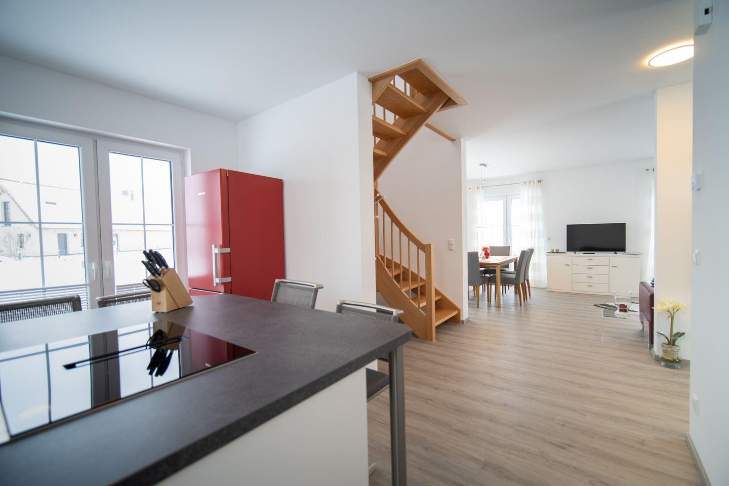 Das Haus erstreckt sich über zwei Ebenen und bietet Platz für bis zu 6 Personen – ideal für Familien oder gemeinsam reisende Paare. Im Erdgeschoss erwartet Sie ein großzügiger, offener Wohn- und Essbereich. Durch die bodentiefen Fenster flutet Licht hinein und eröffnet den Blick auf das schöne Grundstück. Ob gemeinsame Mahlzeiten, Kochabende in der voll ausgestatteten Küche mit Kochbar oder entspannte Stunden auf dem Sofa: Hier fühlt sich Urlaub wie ein echtes Zuhause an. Ein Duschbad sowie ein praktischer Hauswirtschaftsraum runden das Erdgeschoss ab.