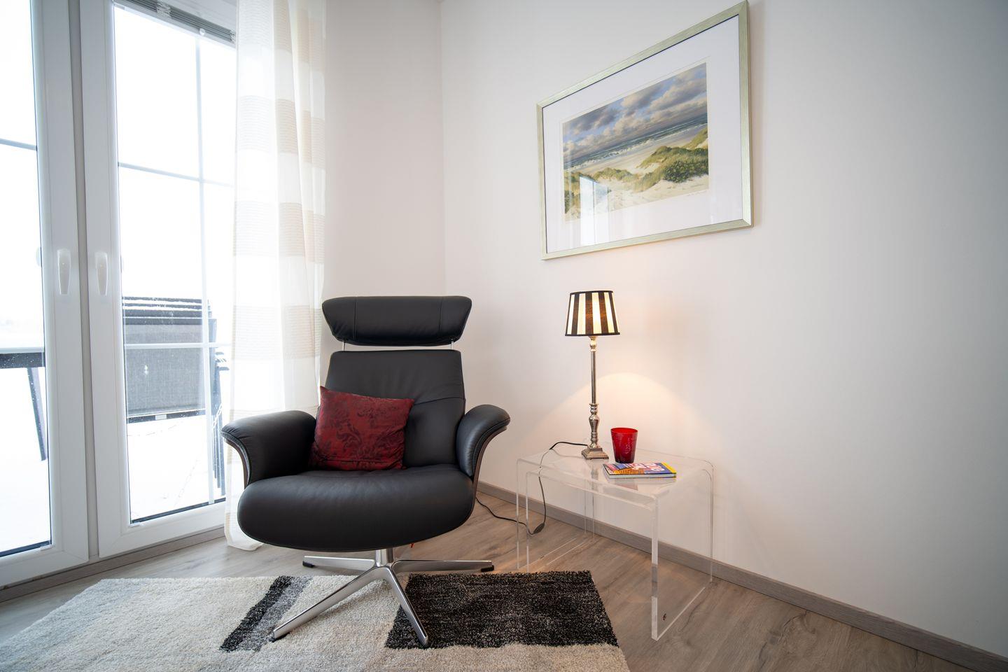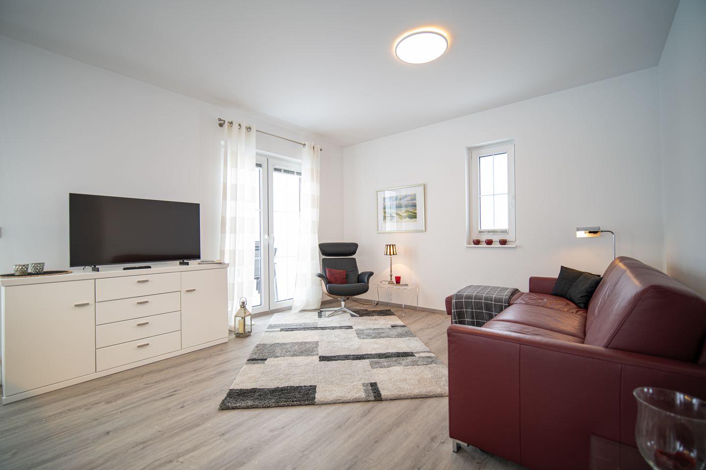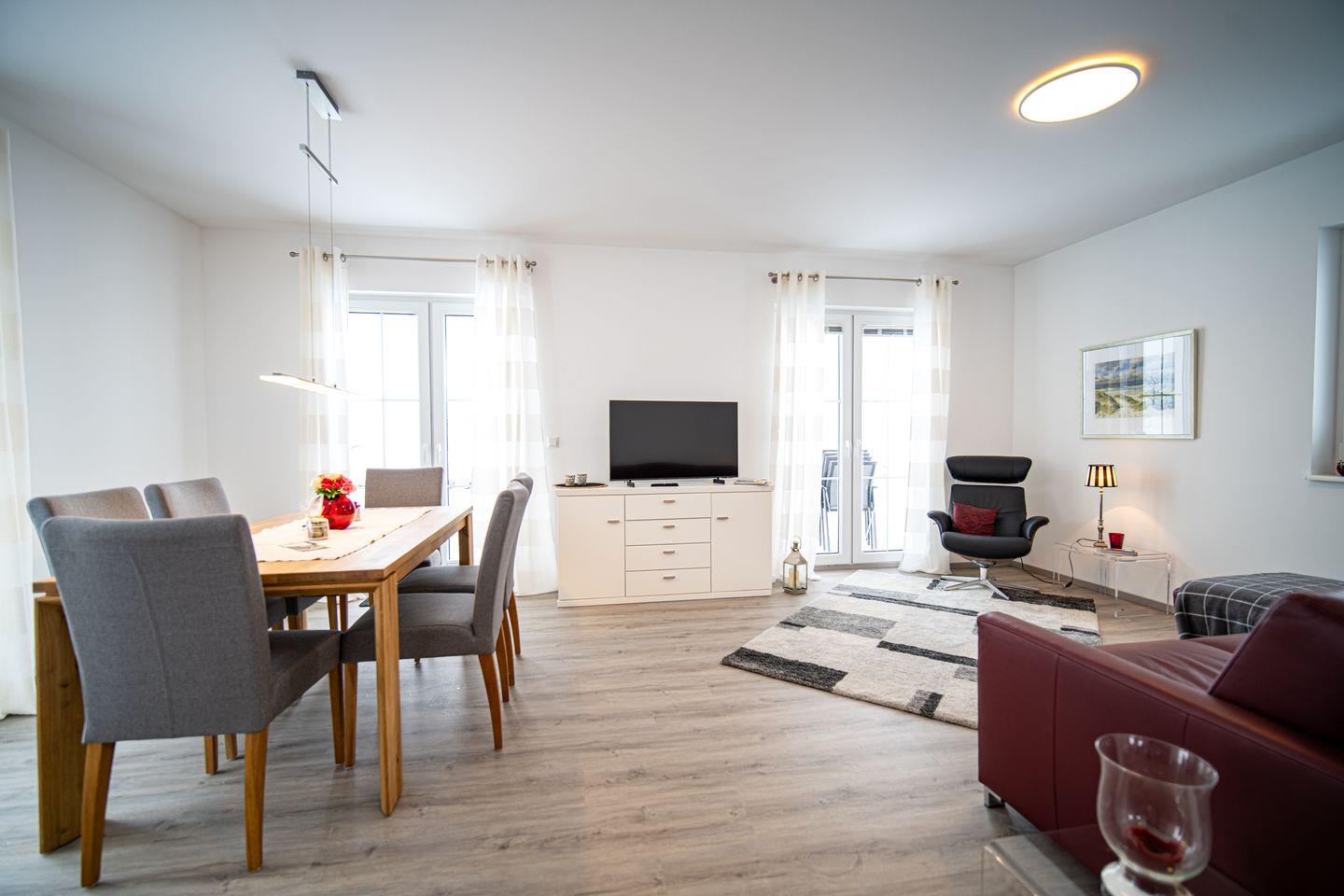 Das Haus erstreckt sich über zwei Ebenen und bietet Platz für bis zu 6 Personen – ideal für Familien oder gemeinsam reisende Paare. Im Erdgeschoss erwartet Sie ein großzügiger, offener Wohn- und Essbereich. Durch die bodentiefen Fenster flutet Licht hinein und eröffnet den Blick auf das schöne Grundstück. Ob gemeinsame Mahlzeiten, Kochabende in der voll ausgestatteten Küche mit Kochbar oder entspannte Stunden auf dem Sofa: Hier fühlt sich Urlaub wie ein echtes Zuhause an. Ein Duschbad sowie ein praktischer Hauswirtschaftsraum runden das Erdgeschoss ab.