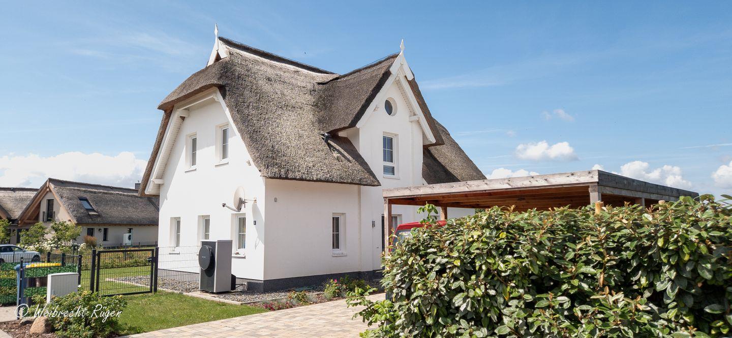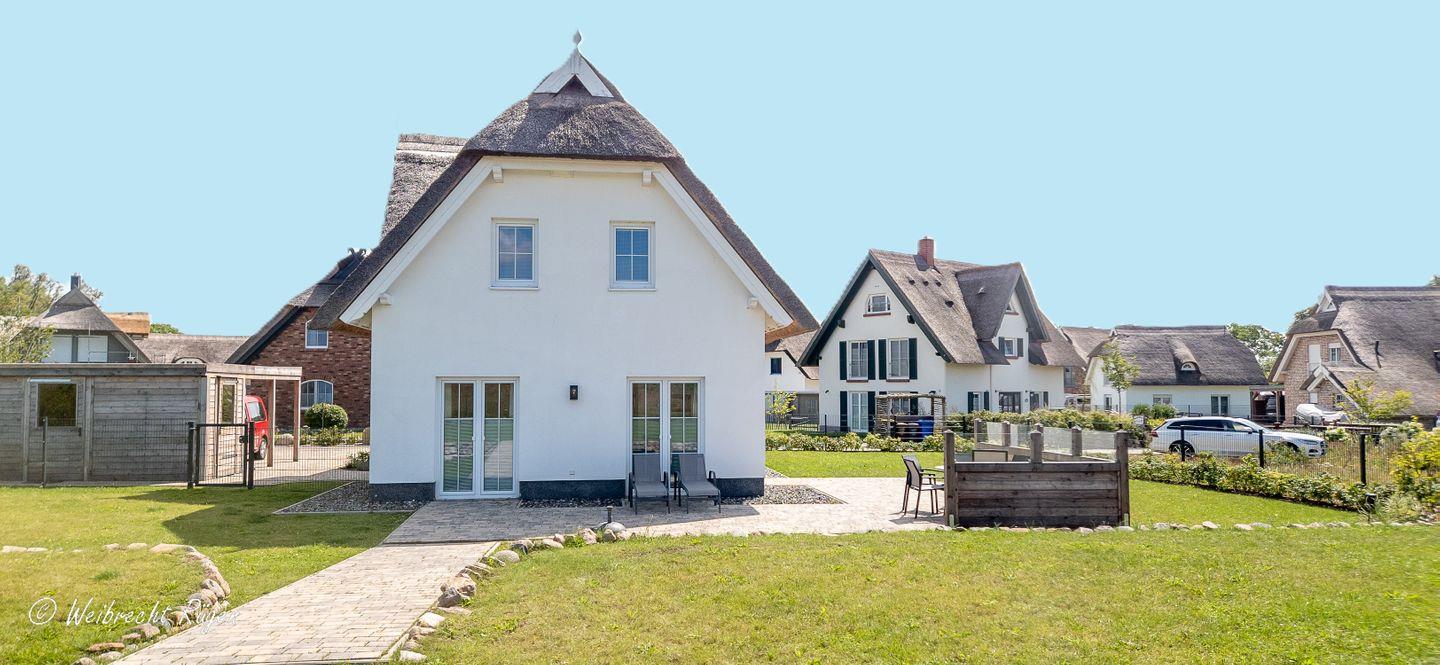 Im Obergeschoss liegen drei behagliche Schlafzimmer – jedes ausgestattet mit einem 160 cm breiten Doppelbett und viel Stauraum. Das große Badezimmer kombiniert Dusche und Badewanne, ideal für Wellnessmomente nach einem Strandtag oder einer Bodden-Wanderung.