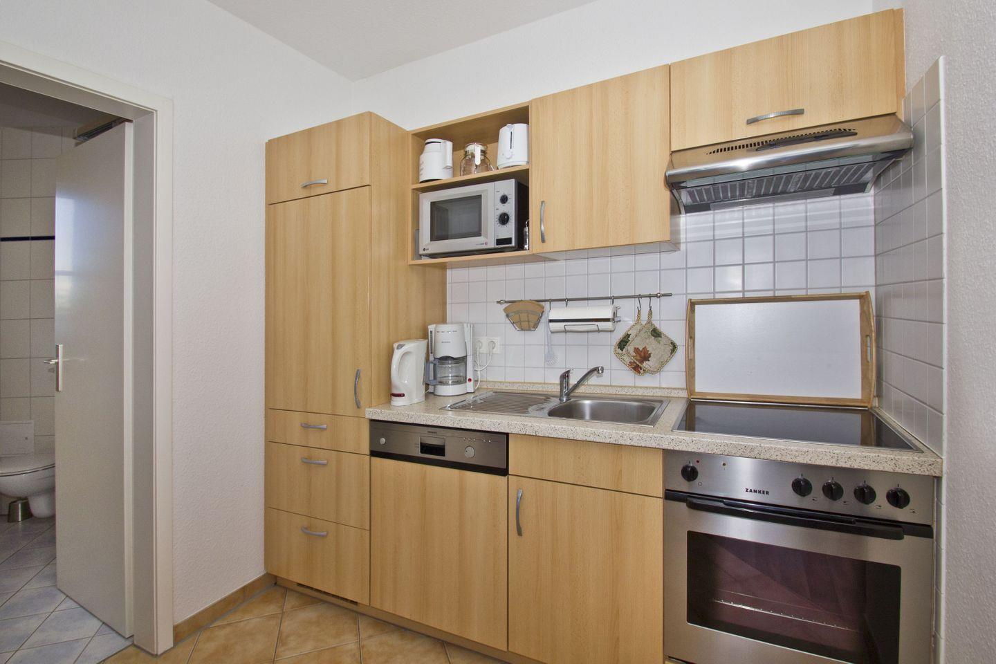KÜCHE // Küchenzeile, 4-Platten Ceranherd, Spülmaschine, Kühlschrank mit Gefrierfach, Backofen, Toaster, Wasserkocher, Kaffeemaschine, Mikrowelle, Eierkocher, reichlich Besteck, Geschirr und Küchenutensilien ++