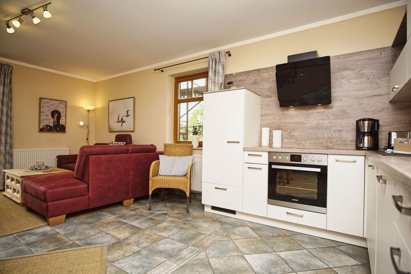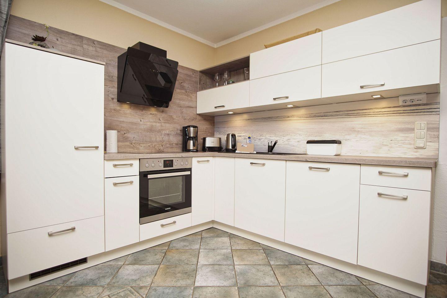KÜCHE // offene Küche, 4-Felder Ceranherd mit Backofen, Kühlschrank, Toaster, Wasserkocher, Kaffeemaschine, reichlich Besteck, Geschirr und Küchenutensilien ++