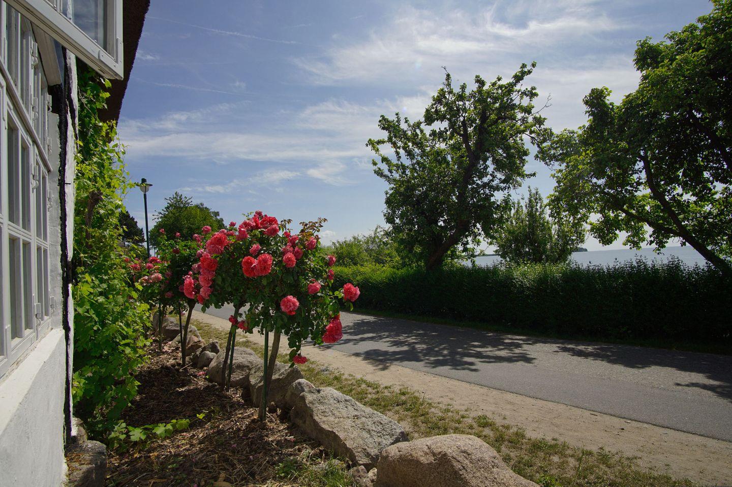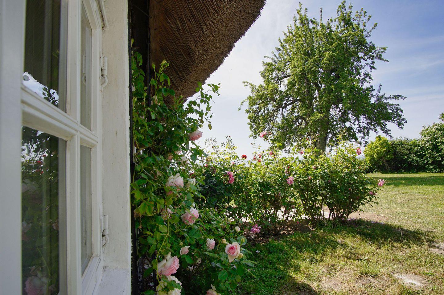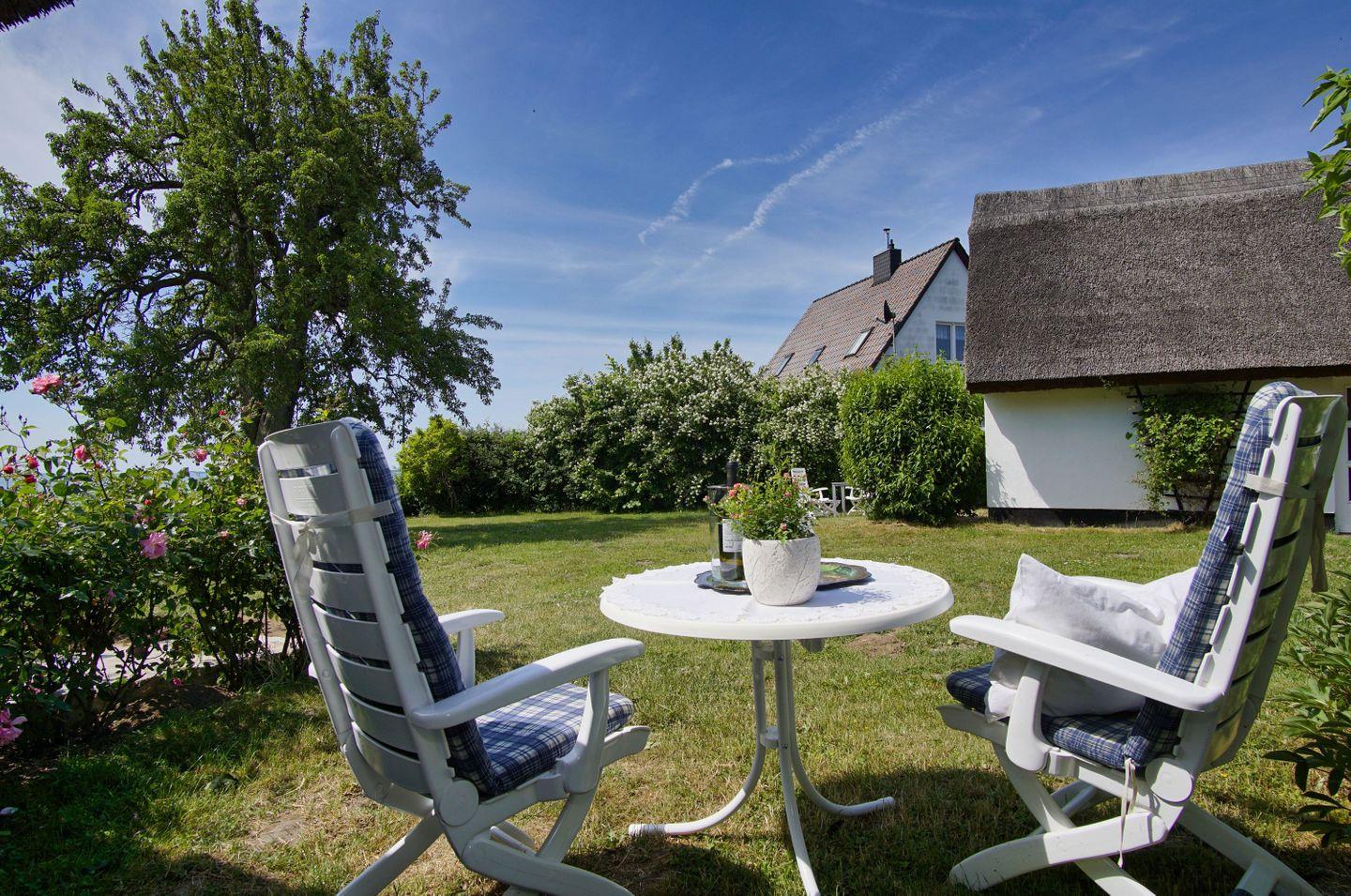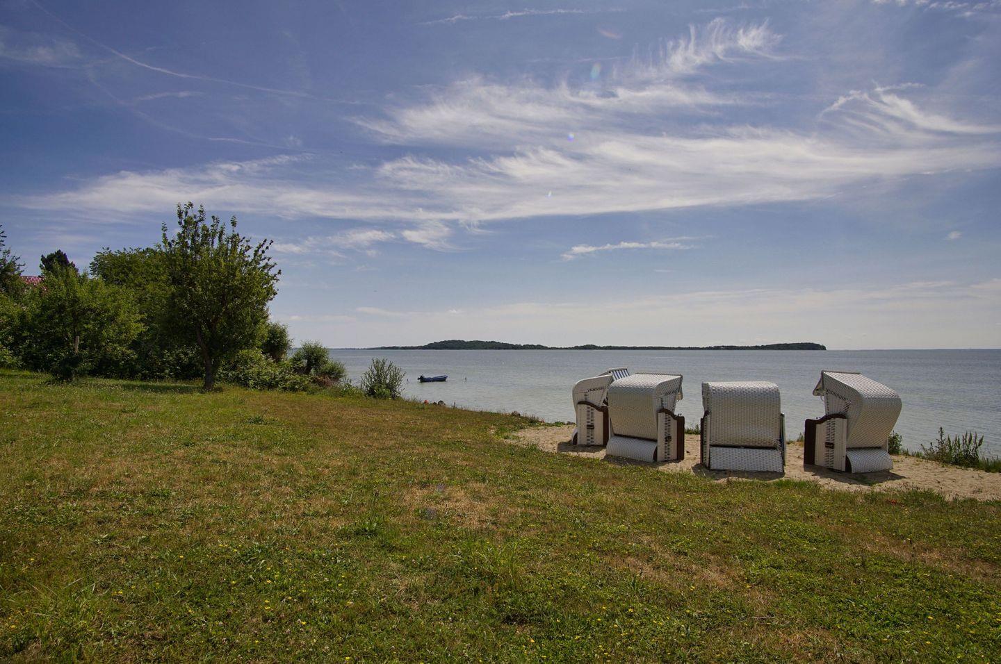 Das große Gartengrundstück grenzt auf der einen Seite an die malerischen Wiesen und Wälder der Rügener Naturlandschaft, auf der anderen Seite an die Küste des Boddens. Auf dem privaten Badezugang mit Liegewiese steht dem Ferienhaus ein eigener Strandkorb zur Verfügung.