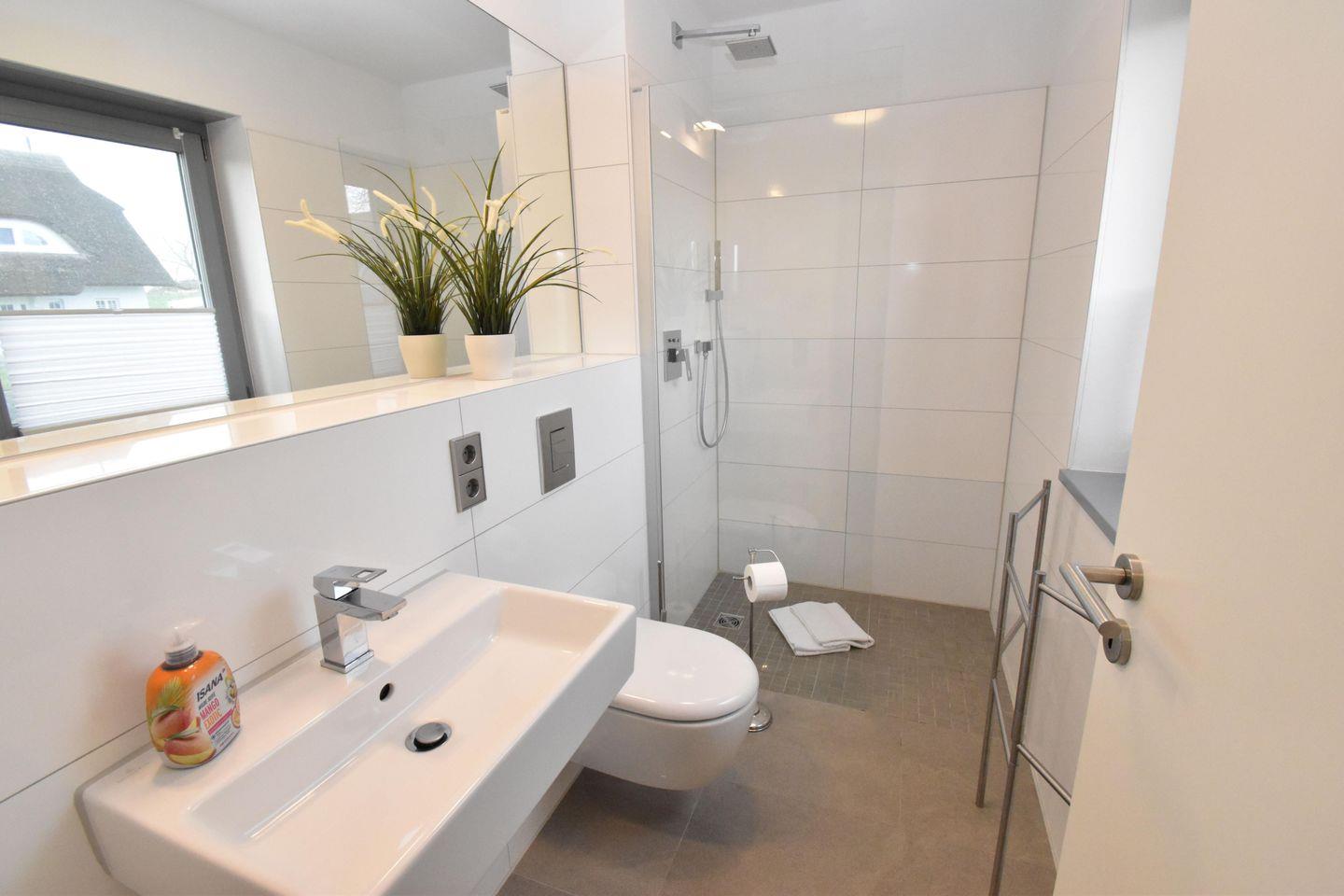 Die drei Schlafzimmer und ein weiteres Badezimmer mit Regendusche und Badewanne sind im Obergeschoss untergebracht.